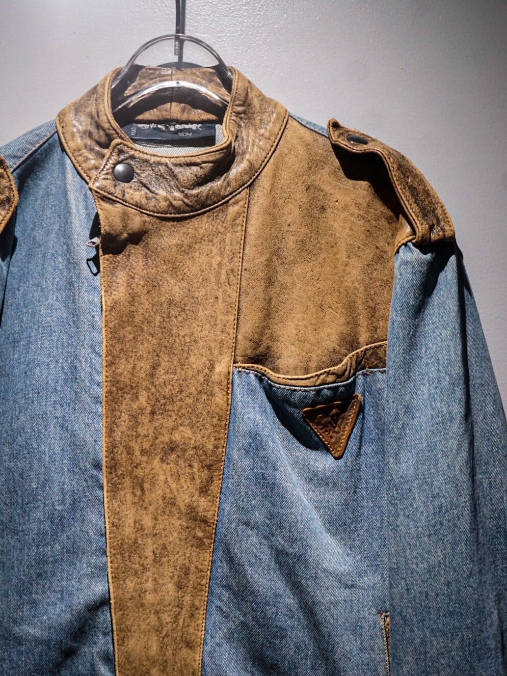 アタリ具合が絶妙なデニムのボディに、上質なブラウンレザーを切り替えたライダース型のデニムジャケット。