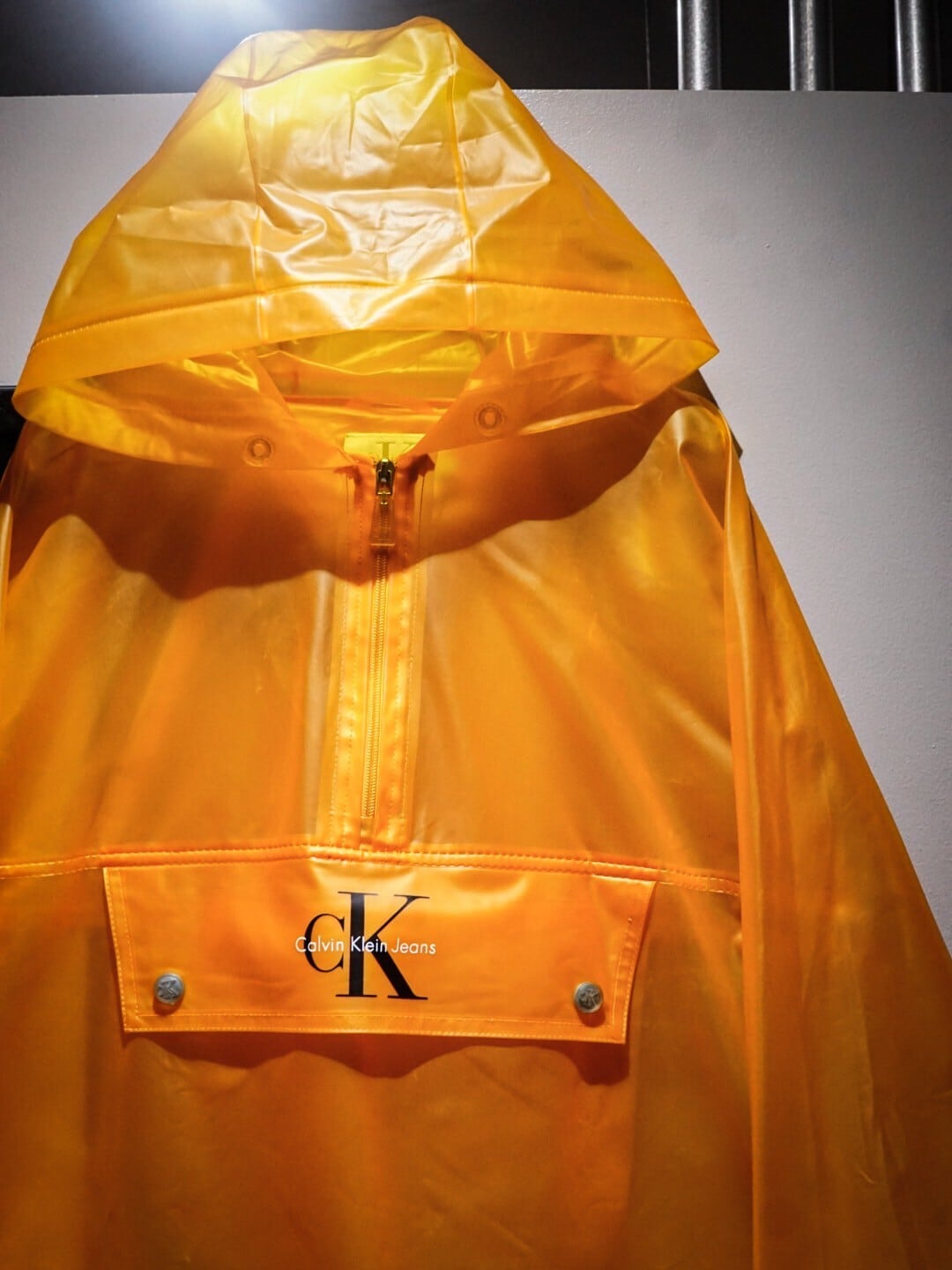 独特の透け感と光沢をもったオレンジのポリビニール素材を使用したアノラックパーカー。