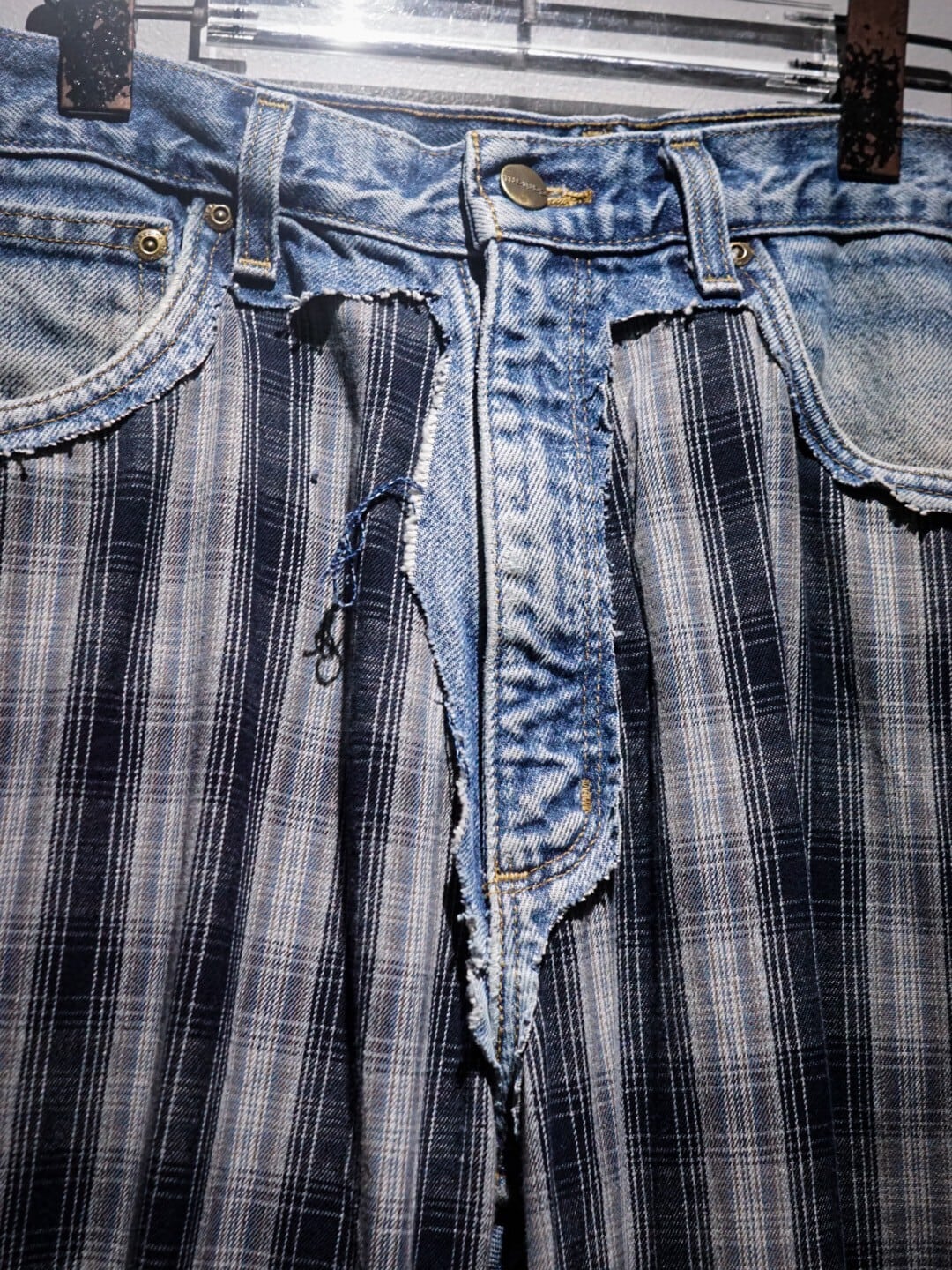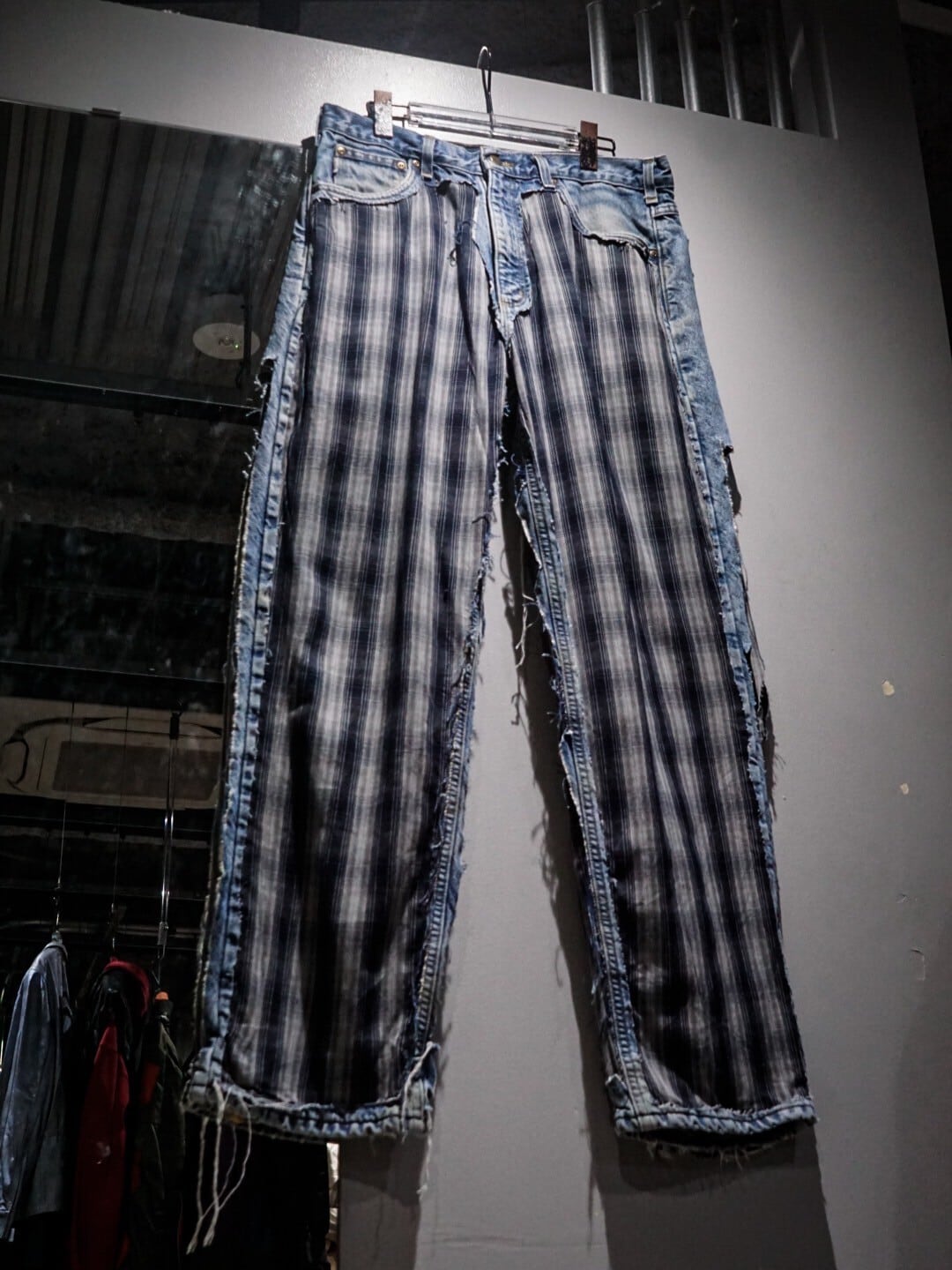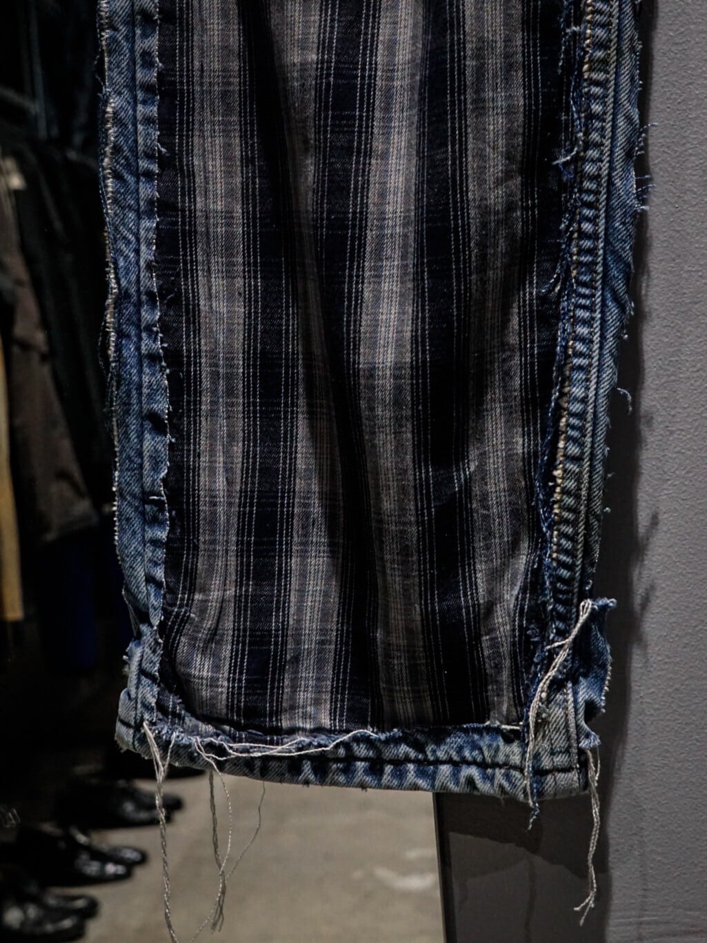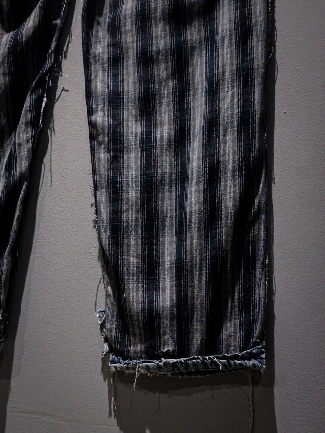 フロントバックにチェック柄の生地を切り替えたリメイクパンツ。