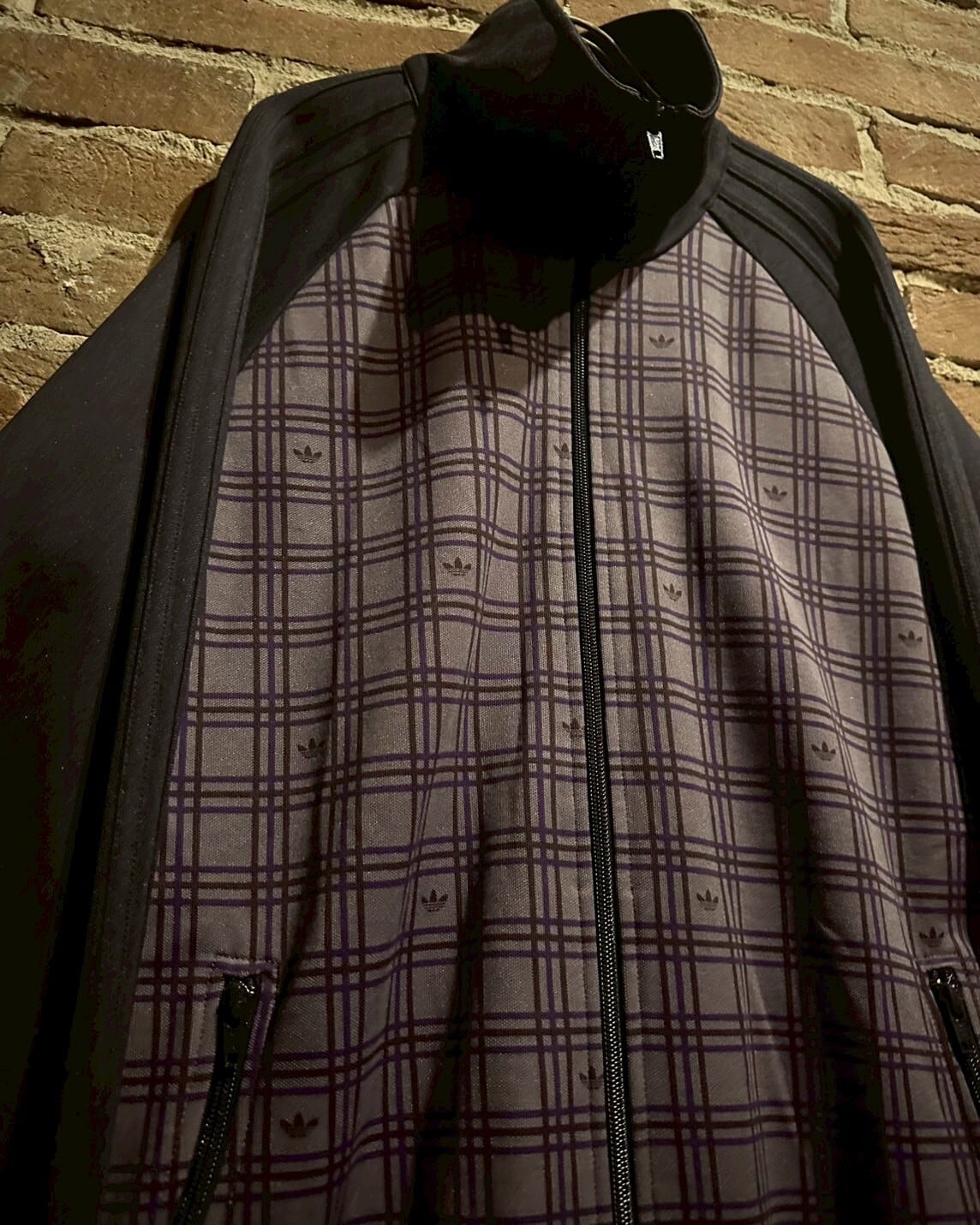 深みのある紫のボディに、フロントにチェック柄を切り替えたadidasのトラックジャケット。