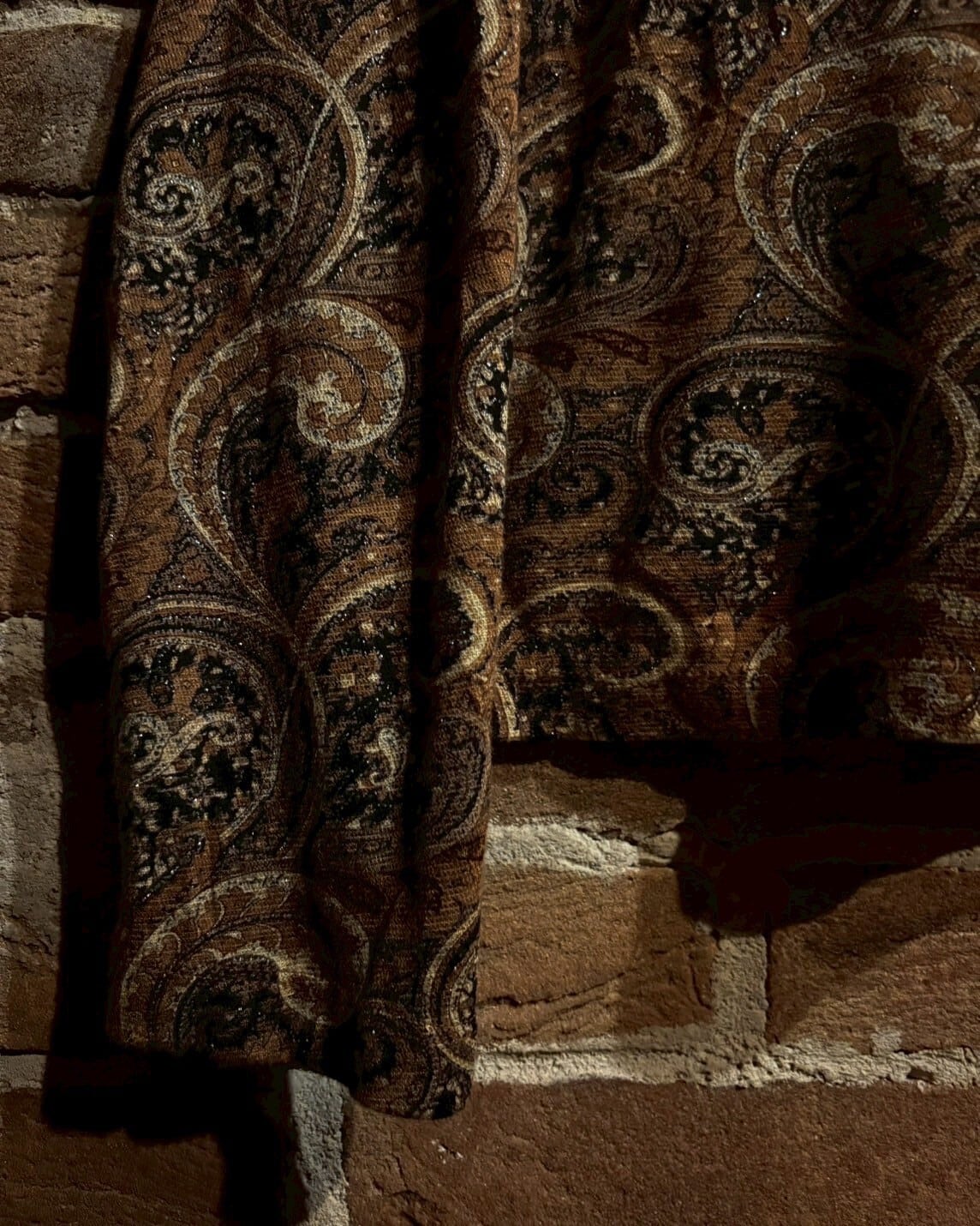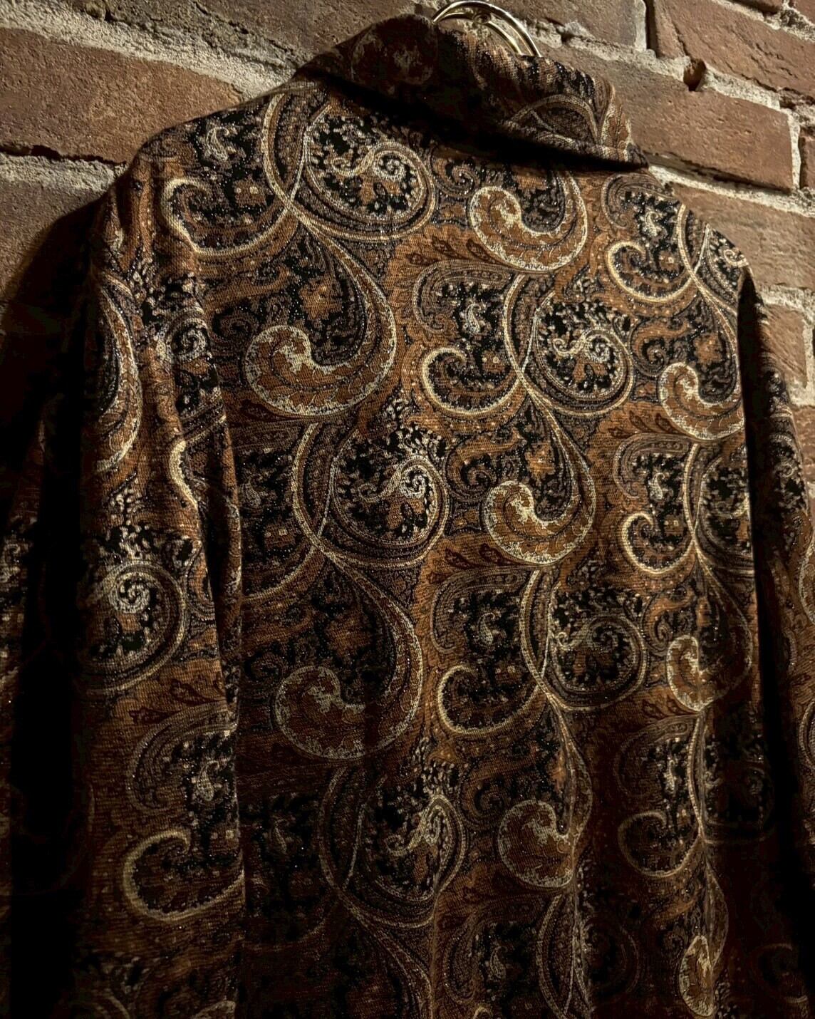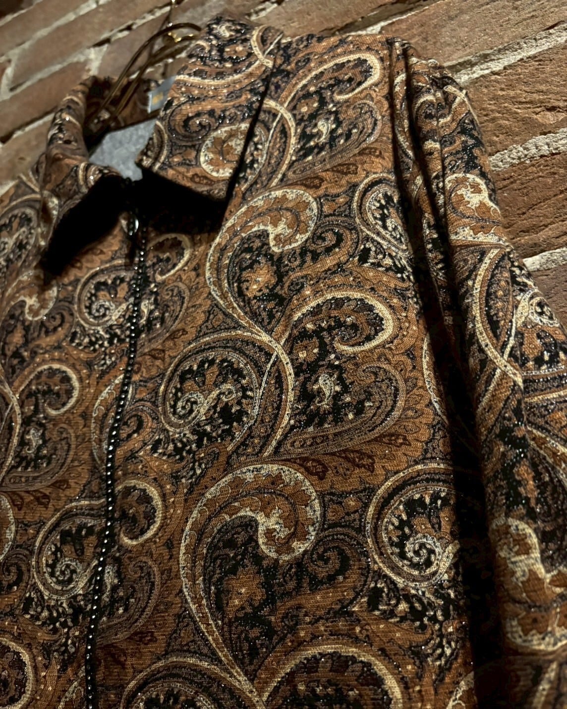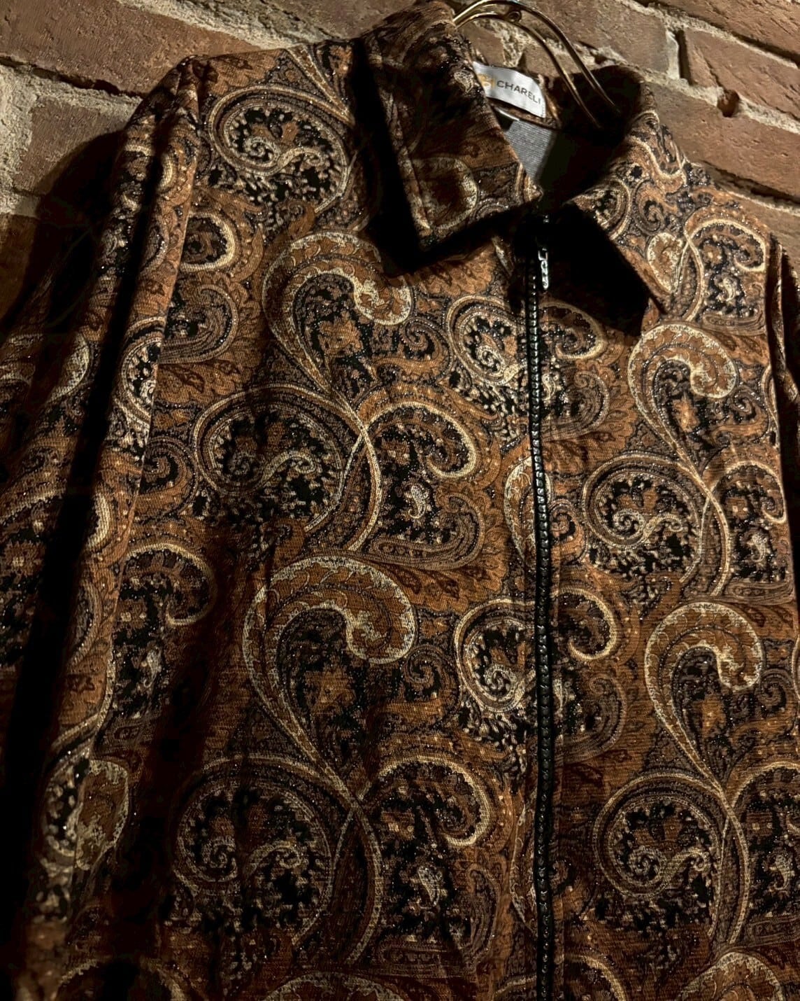 伸縮性のあるブラウンのボディをベースに、ペイズリー柄を載せたジップアップジャケット。