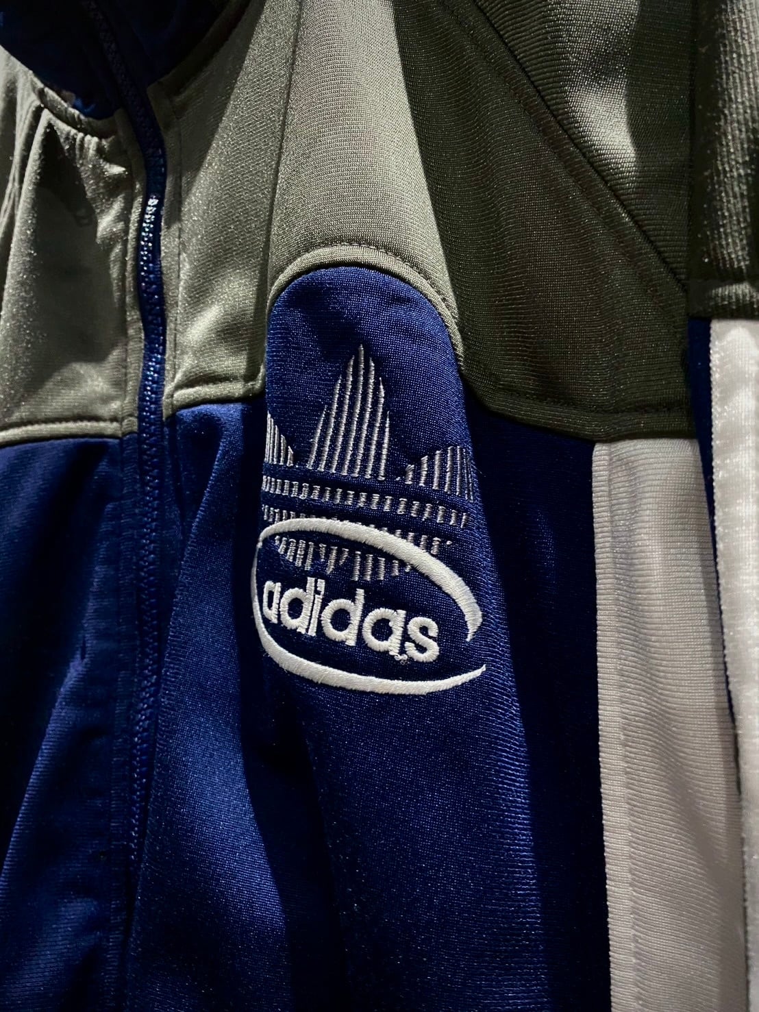 白×ネイビー×グレーの配色で複雑な切り替えを施した、絶妙なデザインバランスにまとめ上げられた90'sトラックジャケット。