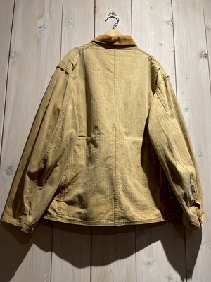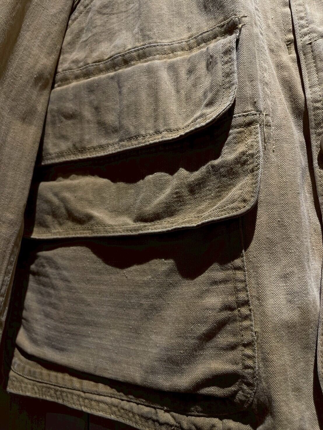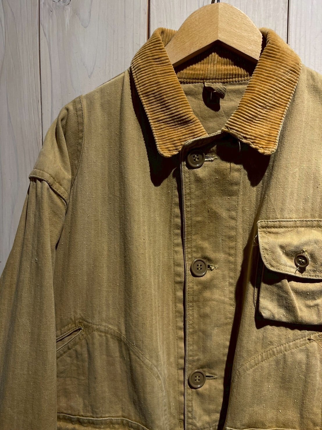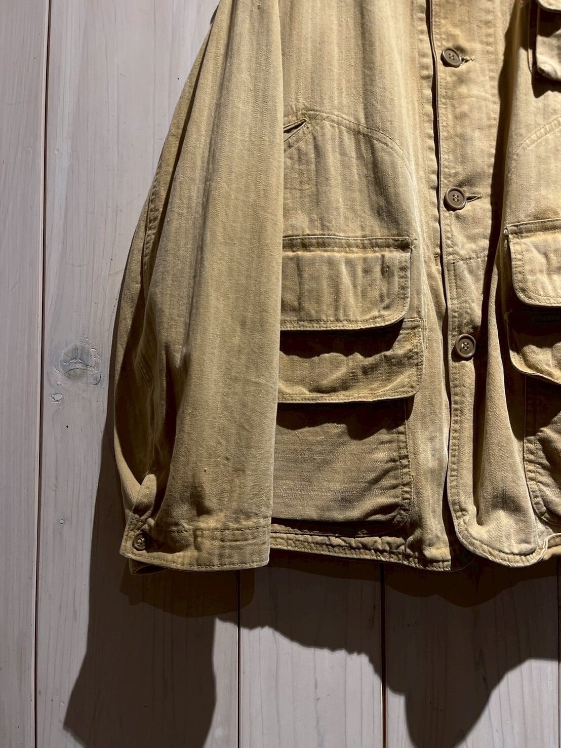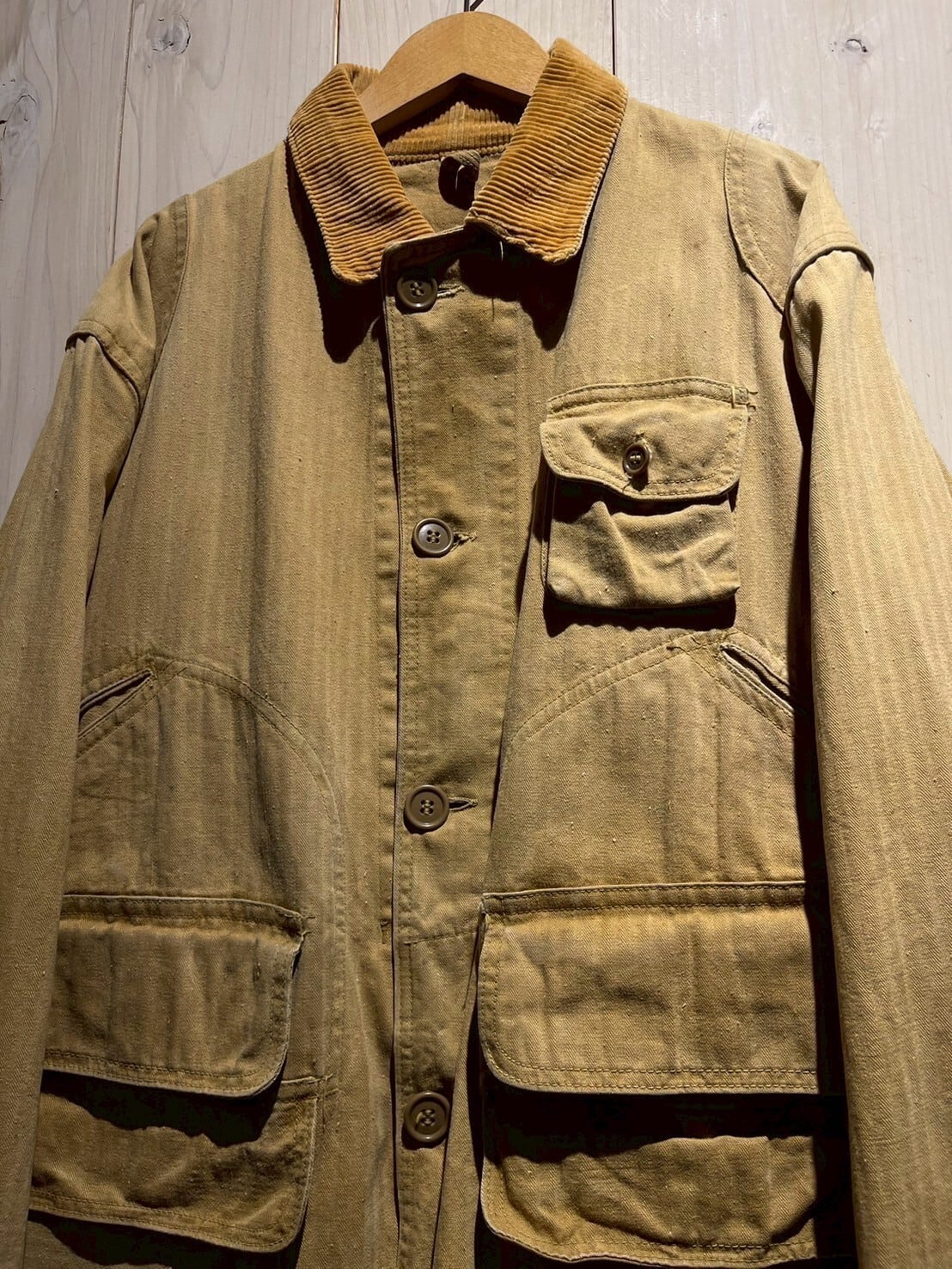 コットン100%使用し、ヘリンボーン織に仕上げた生地に、各所にギミックを散りばめた40〜50'sのハンティングジャケット。