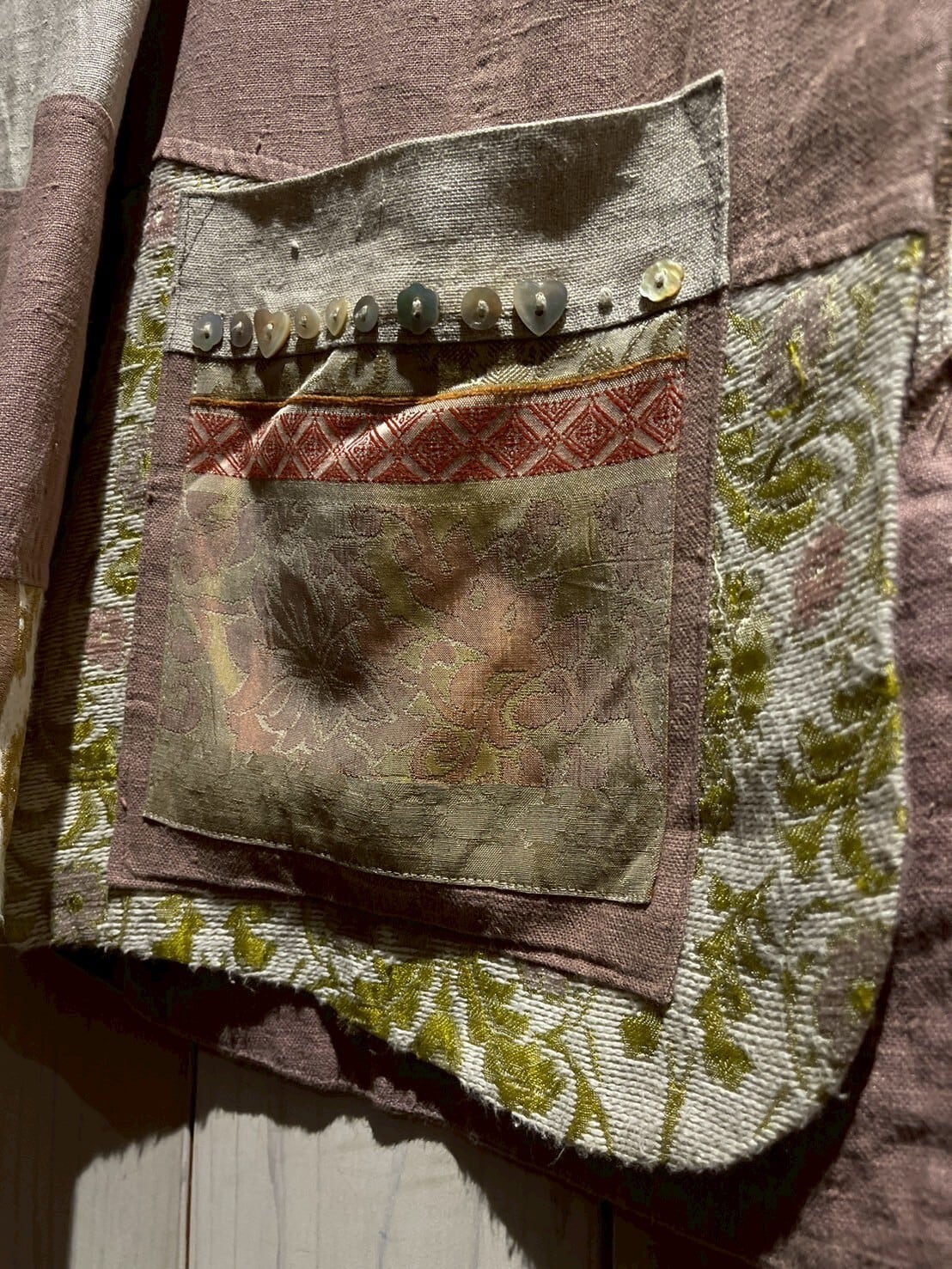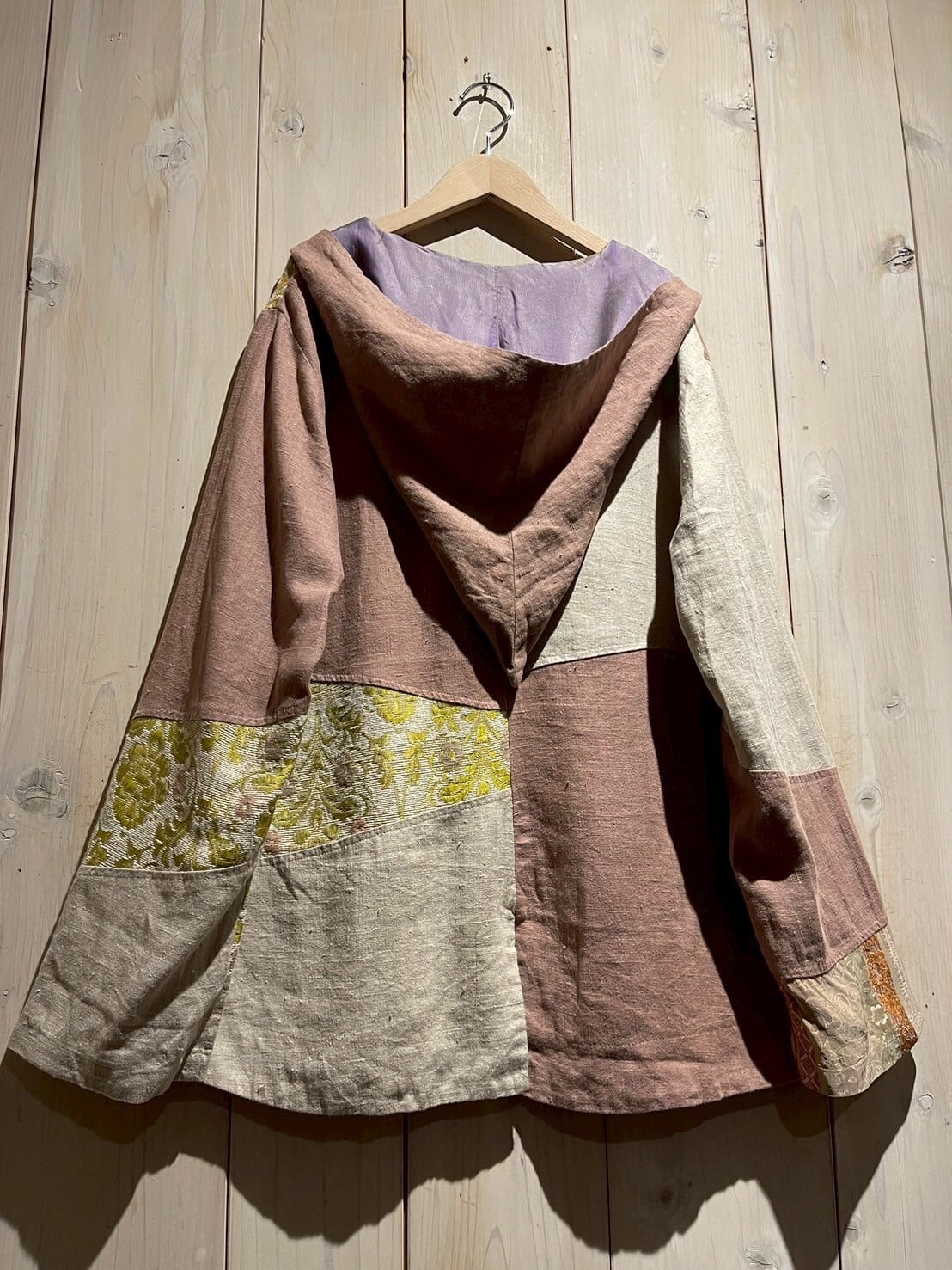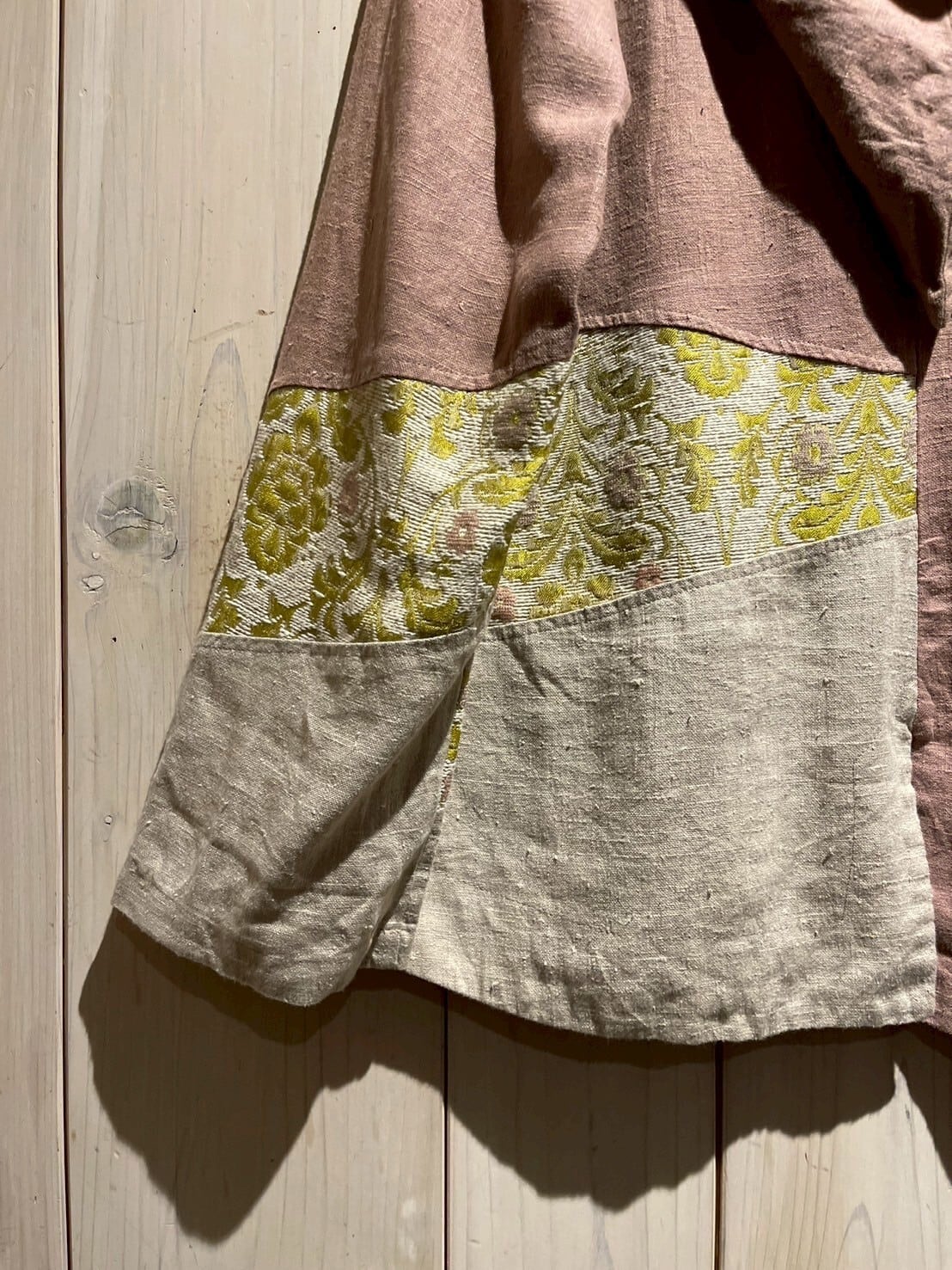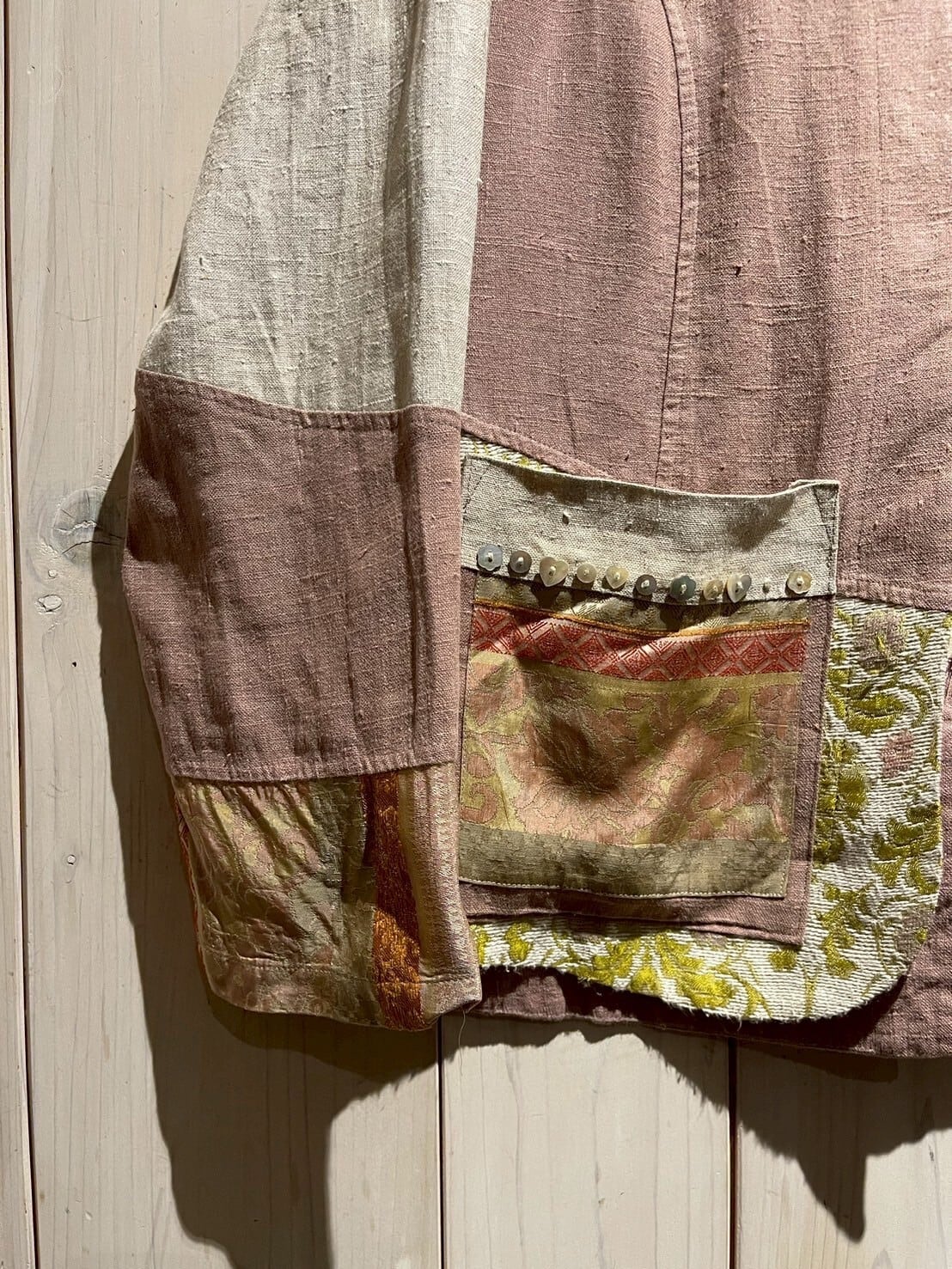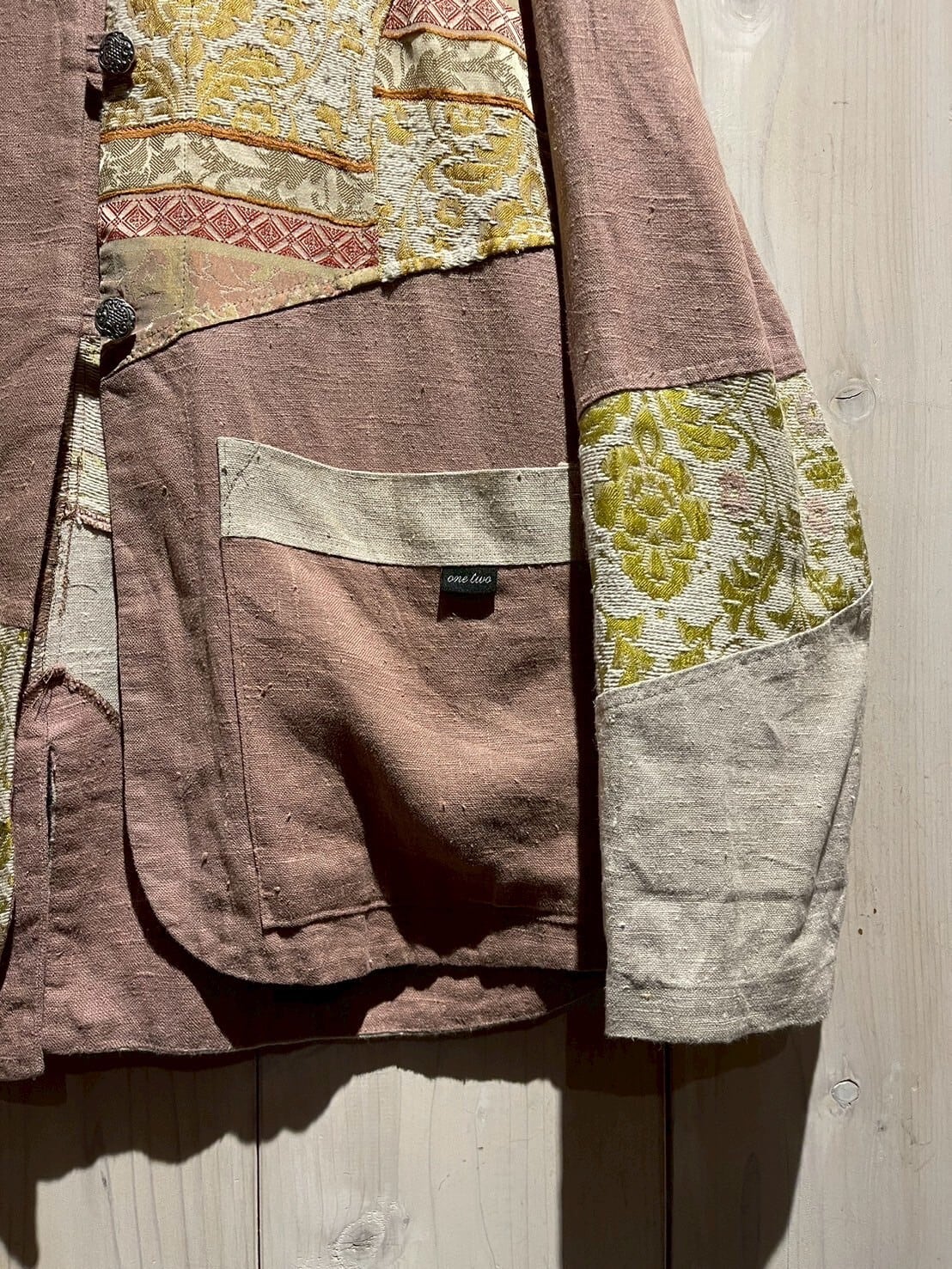 ベージュ×ピンクのリネンに、上質なジャガード織を掛け合わせパッチワーク風に仕上げたジャケット。