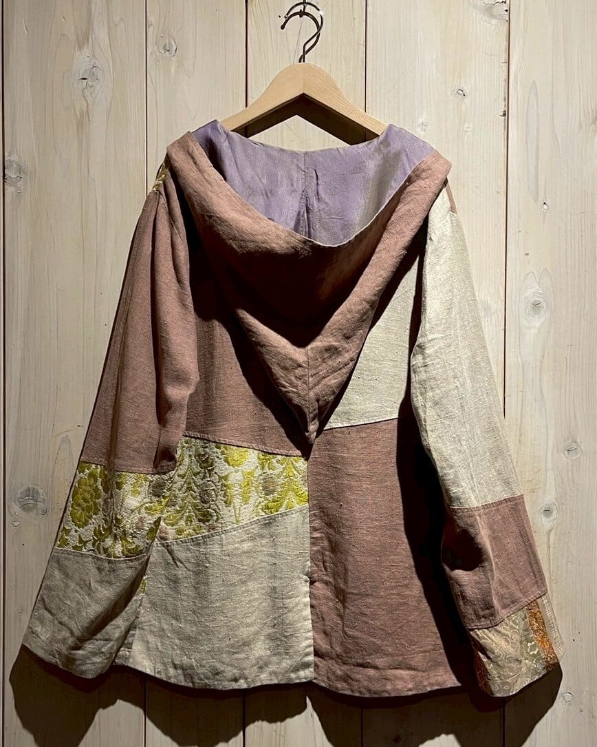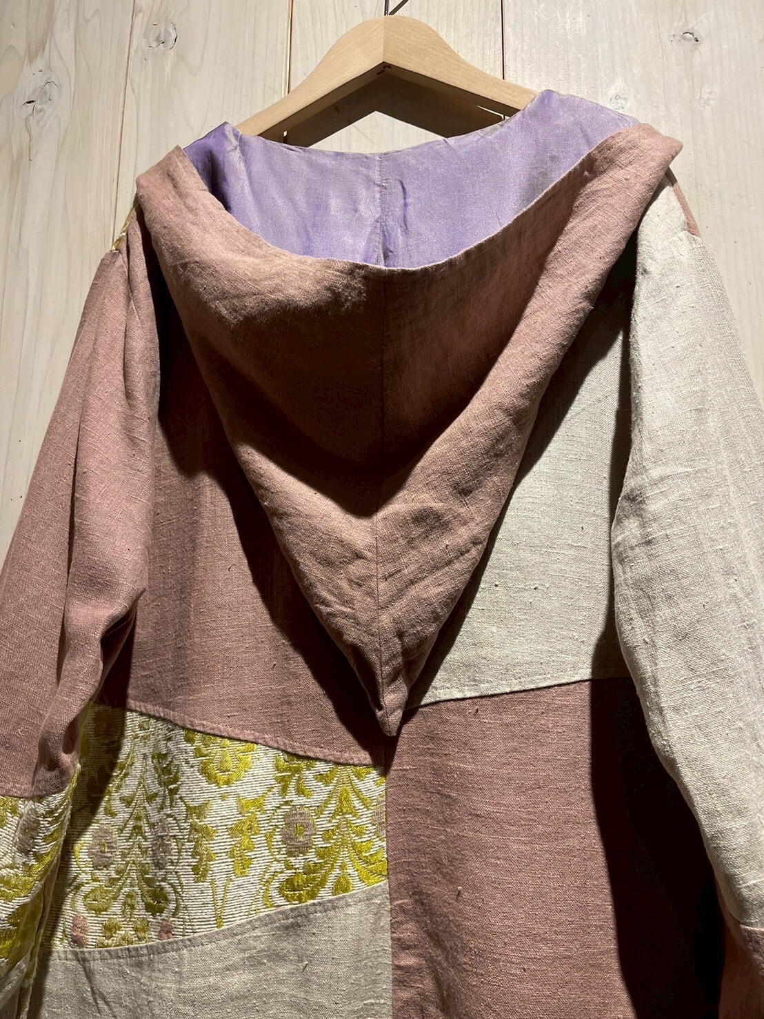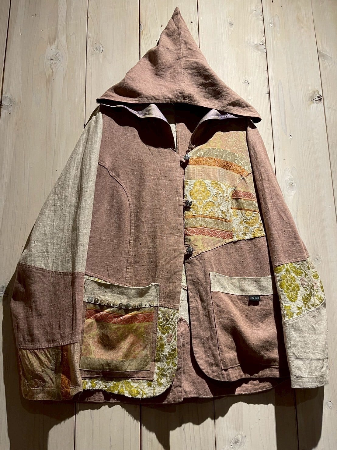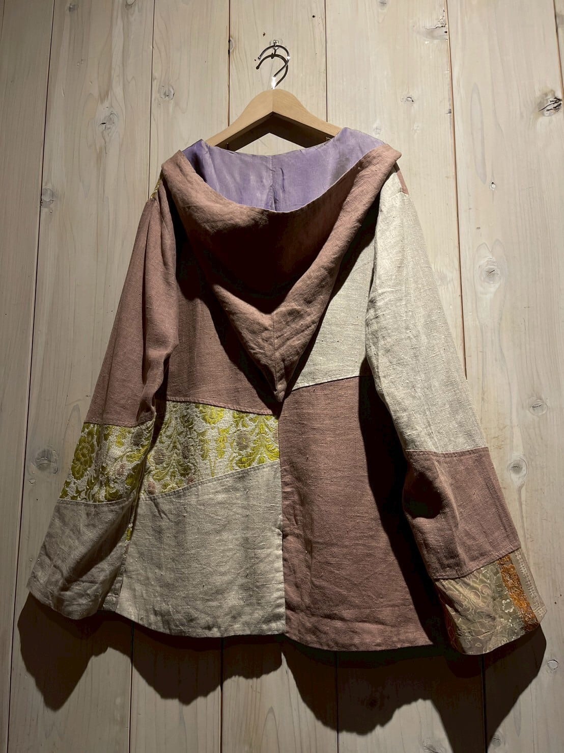 ベージュ×ピンクのリネンに、上質なジャガード織を掛け合わせパッチワーク風に仕上げたジャケット。