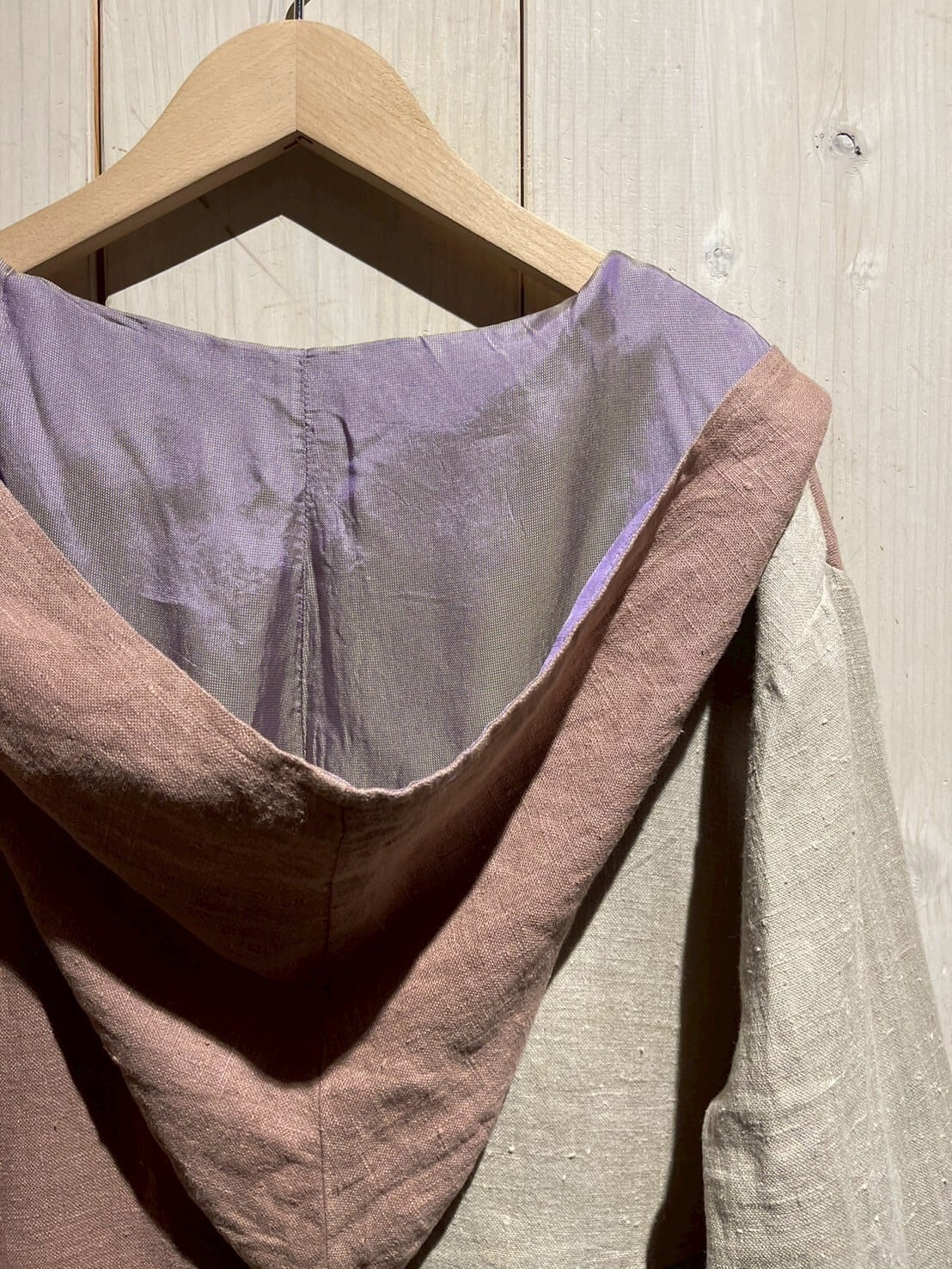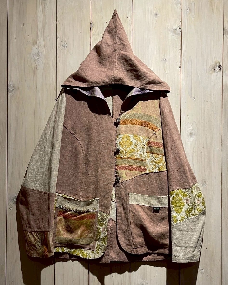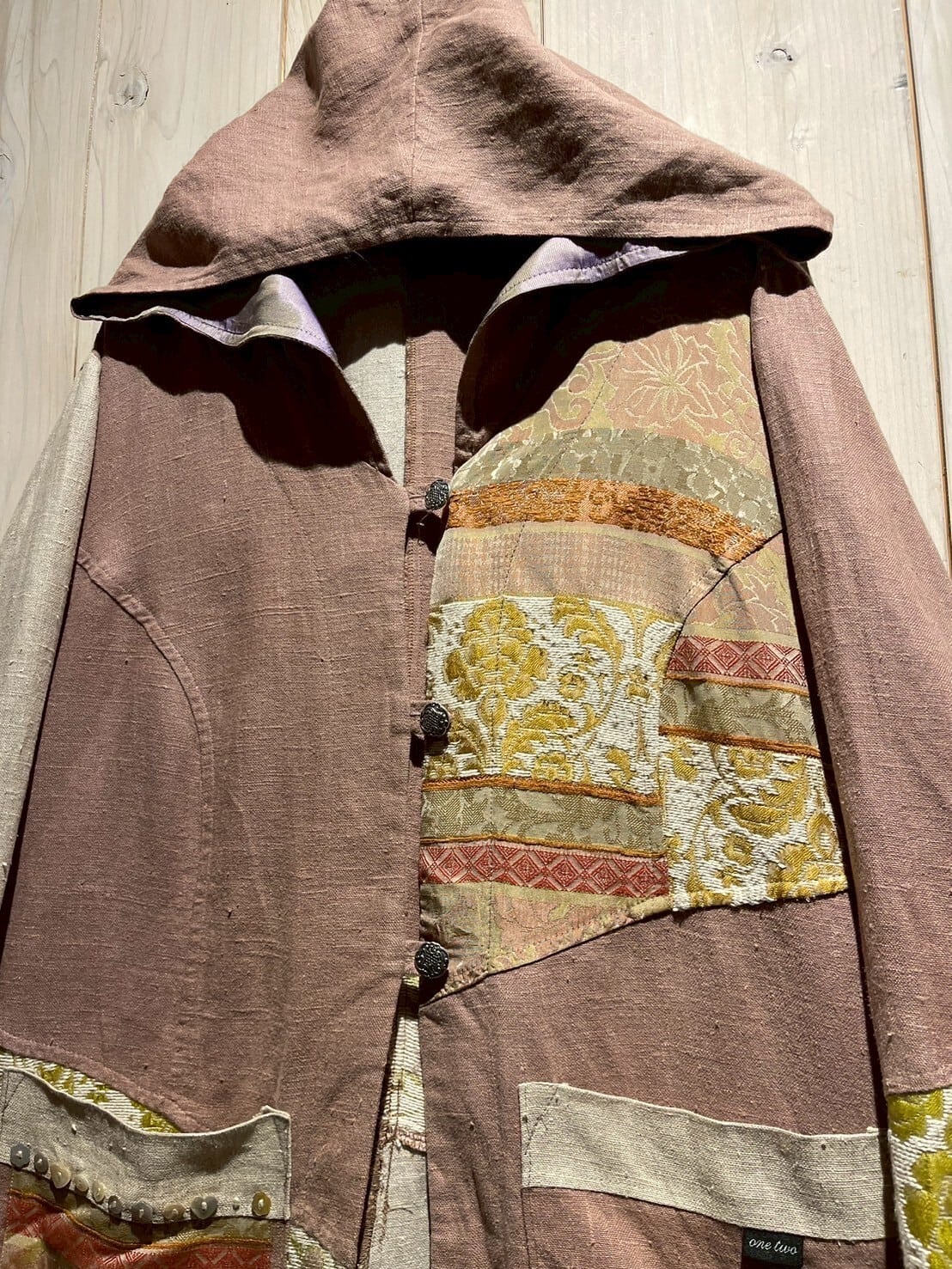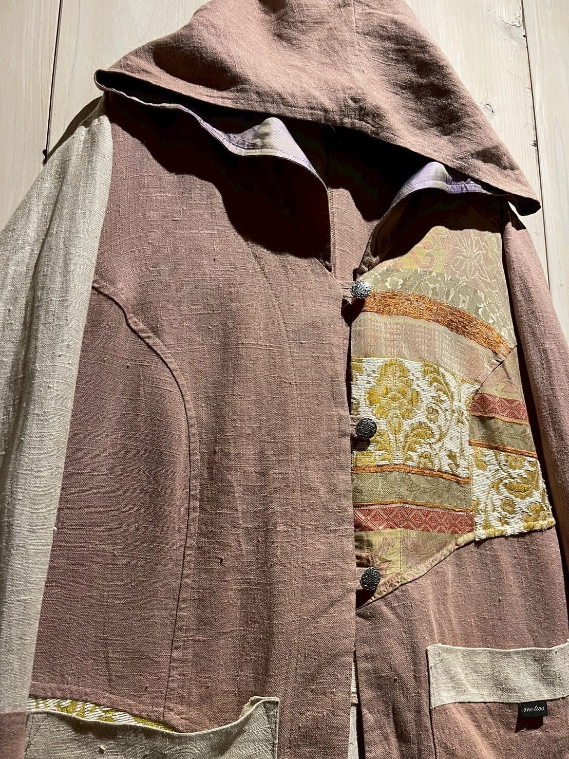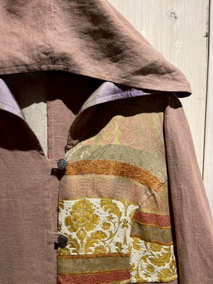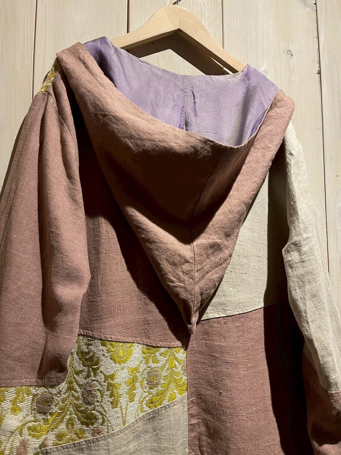 ベージュ×ピンクのリネンに、上質なジャガード織を掛け合わせパッチワーク風に仕上げたジャケット。