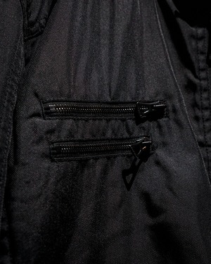 パリッとハリのあるブラックの素材をベースに、両胸にジップポケット、両サイドにはスラッシュポケットを配したジャケット。