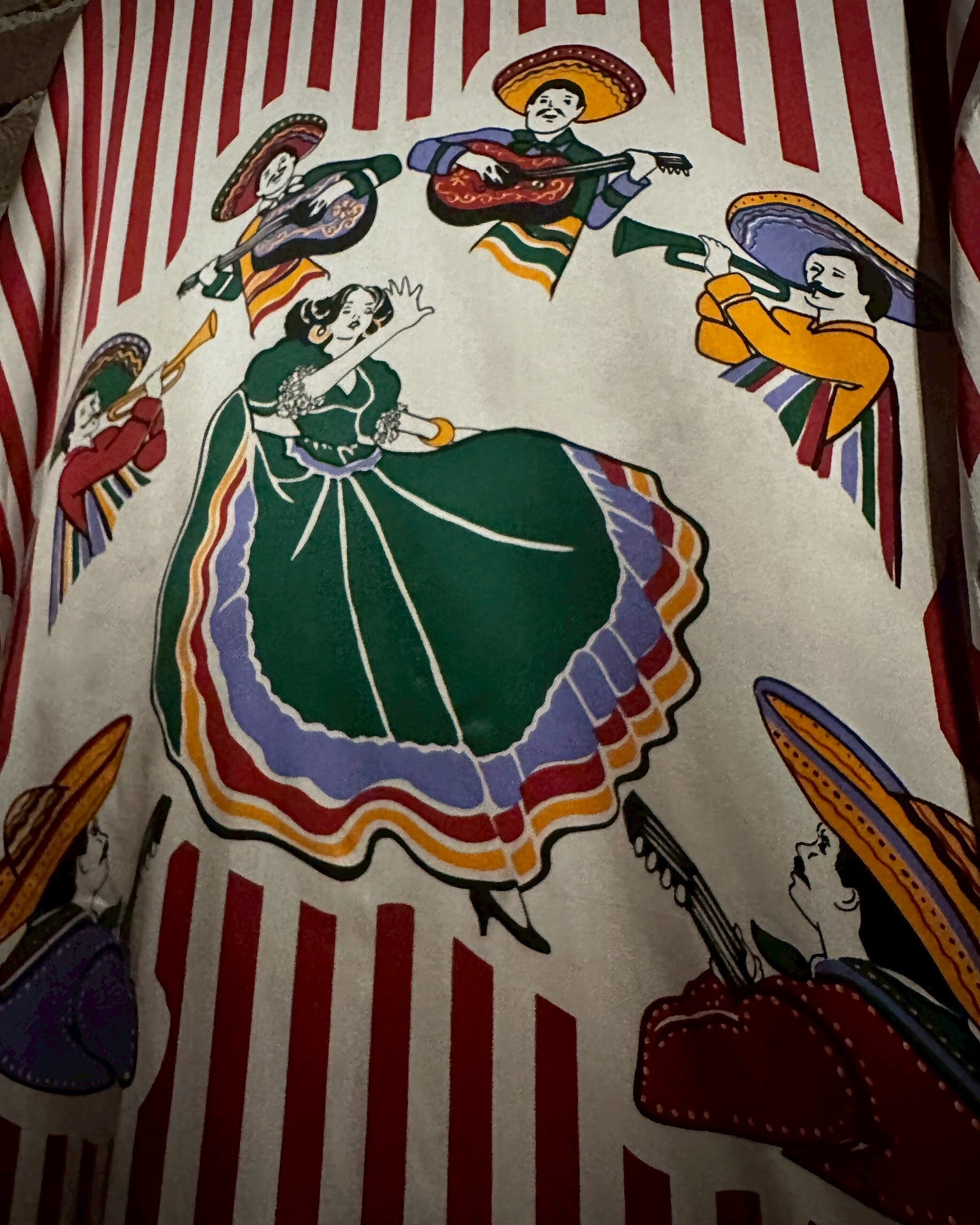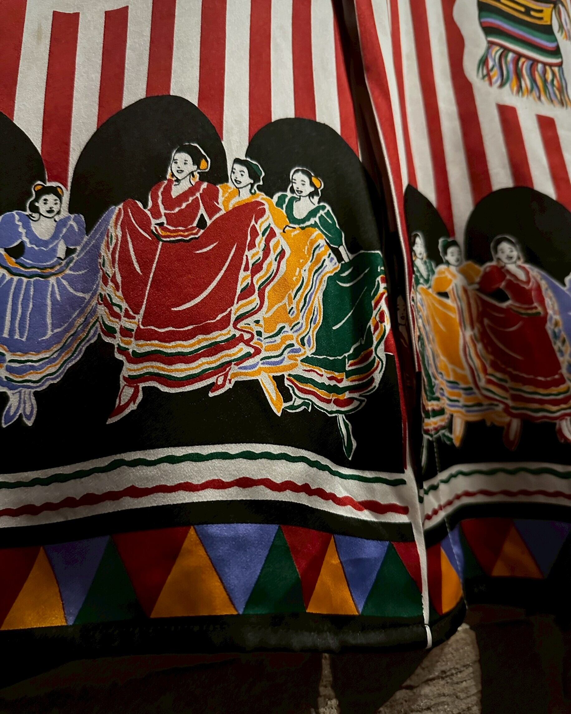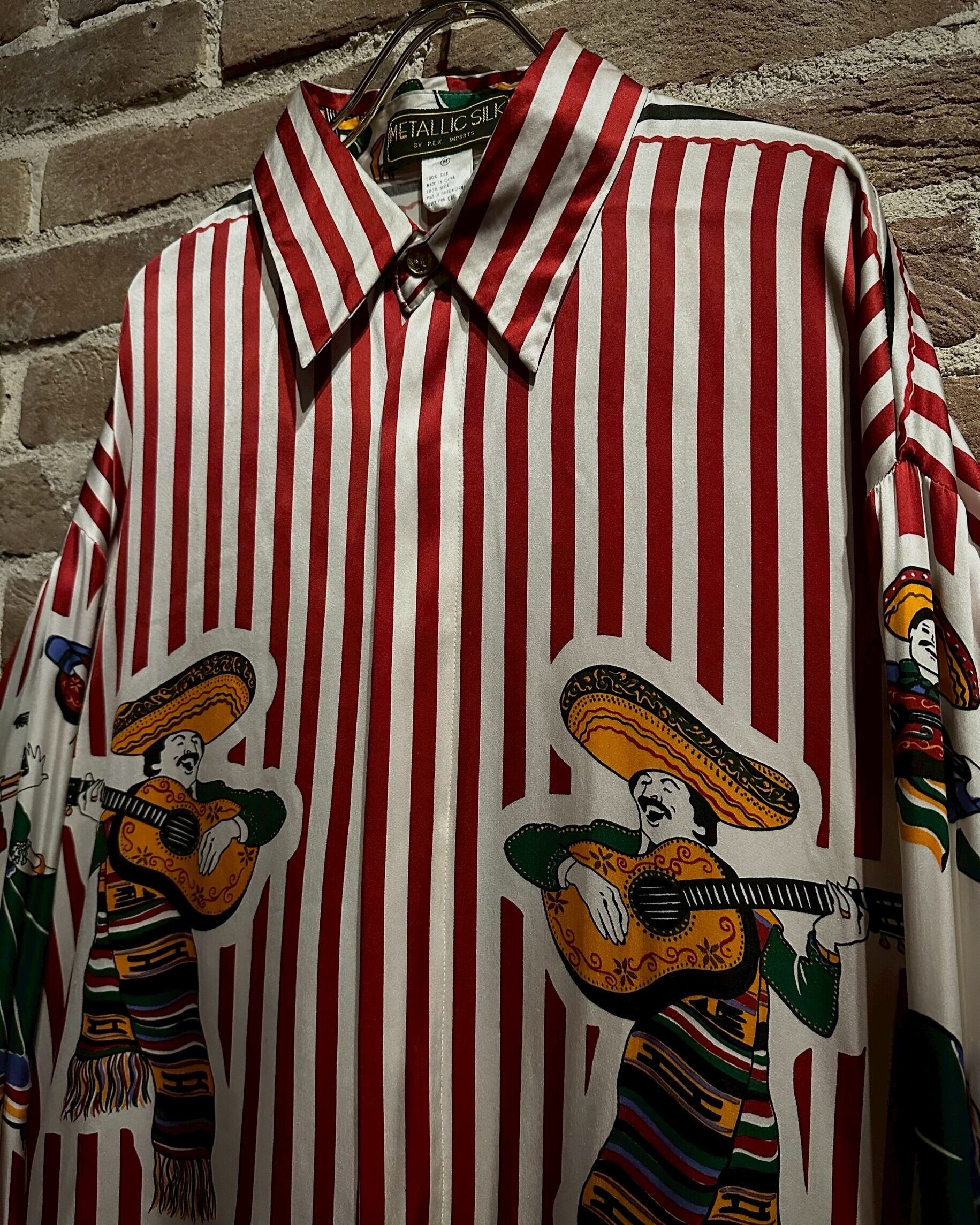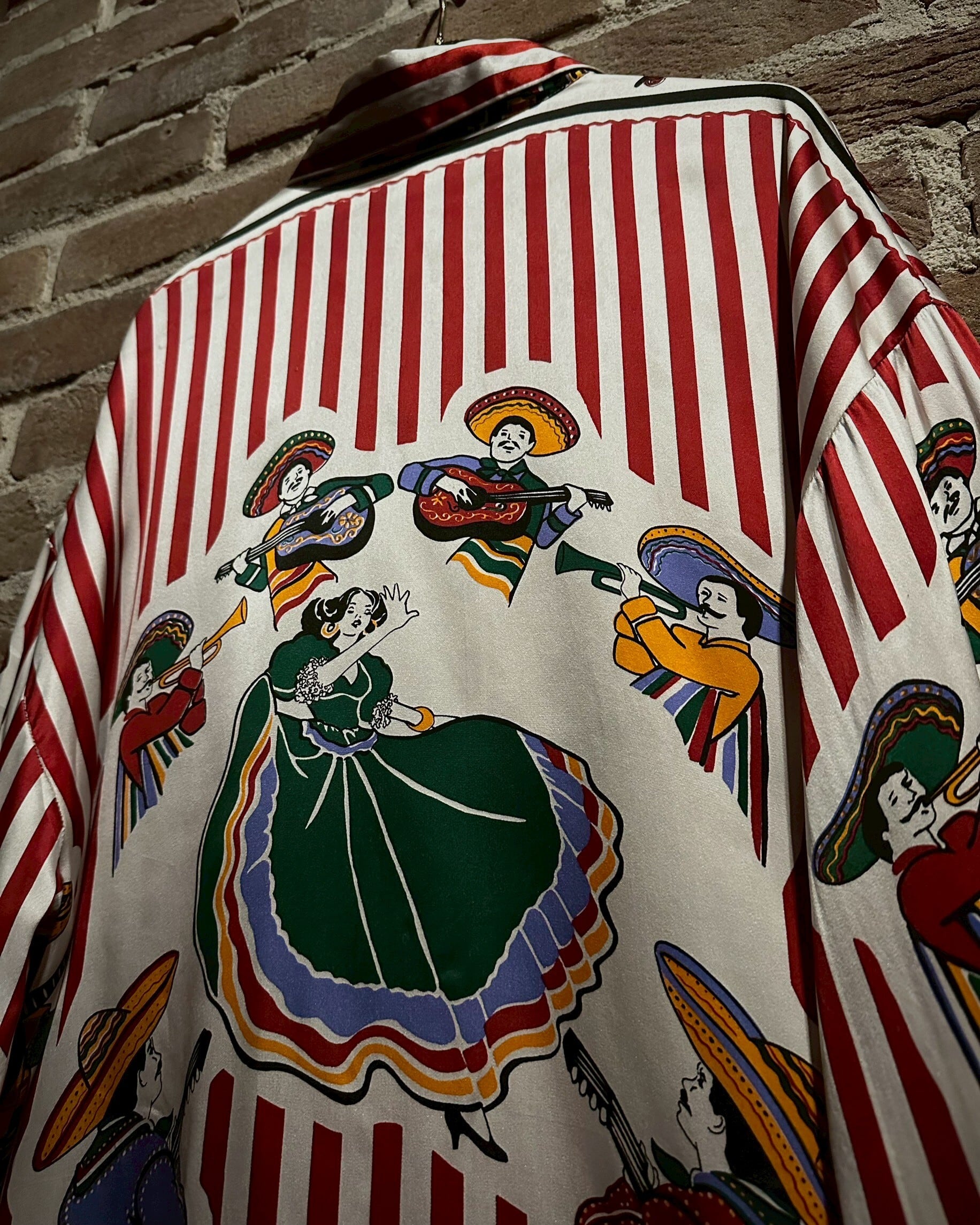 上品な光沢感が美しく、スルスルっと滑らかで上質なシルク素材に、赤×白のストライプ、メキシコの伝統舞踊のシーンを載せたスペシャルな長袖シャツ。