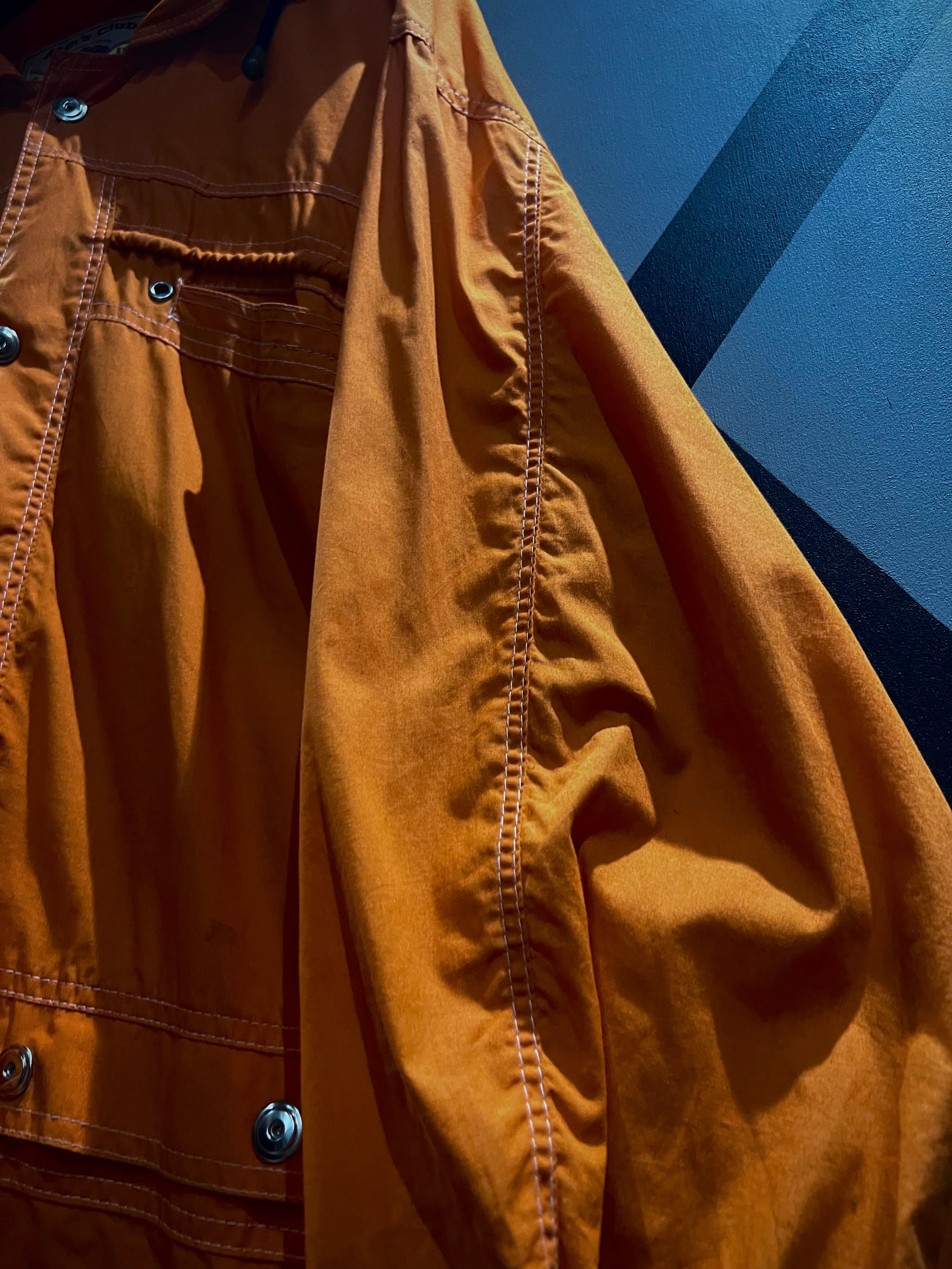 ビビッドなオレンジのボディーに光り輝くシルバーのスナップボタンや、微かに存在感を放つホワイトのステッチ。隅々までこだわり抜かれたディテールに服好きの方々は目と心の双方を奪われます。