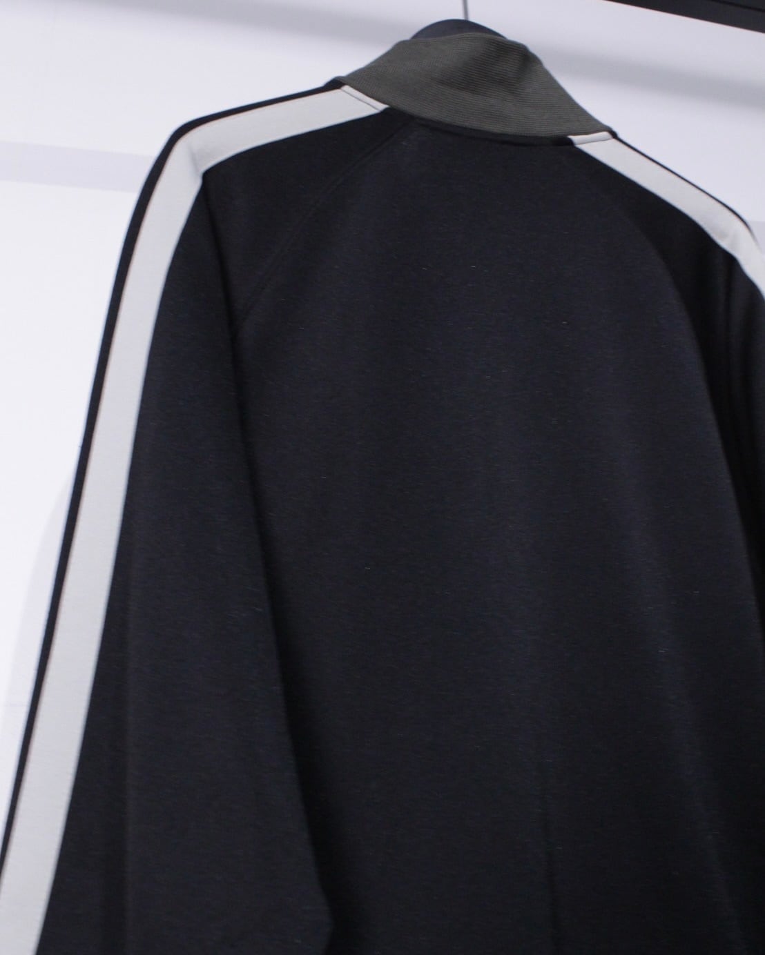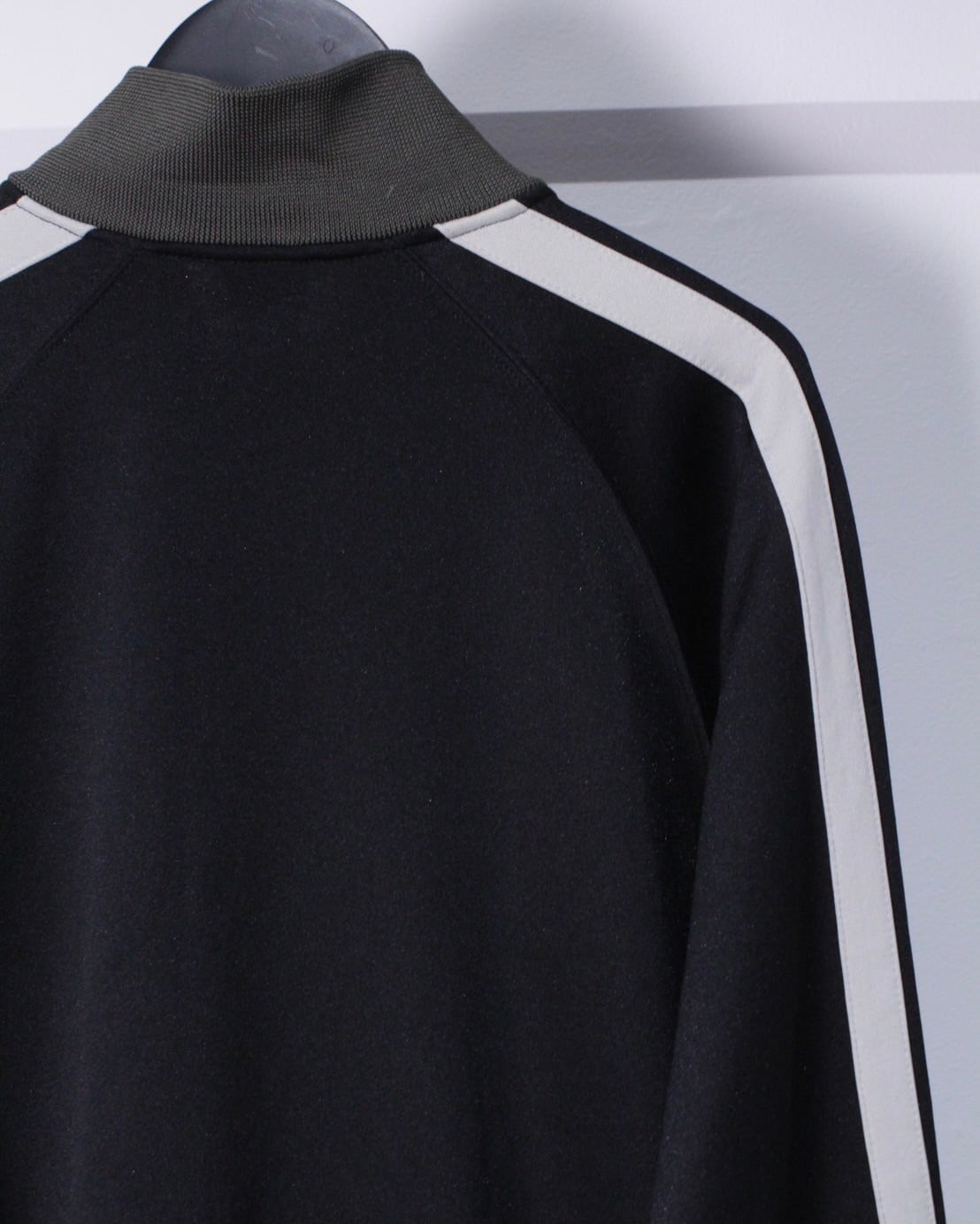 ブラックをベースにカーキ、ホワイトのライン切り替えを施し、ストリートブランドらしいプリントを左胸に施したトラックジャケット。