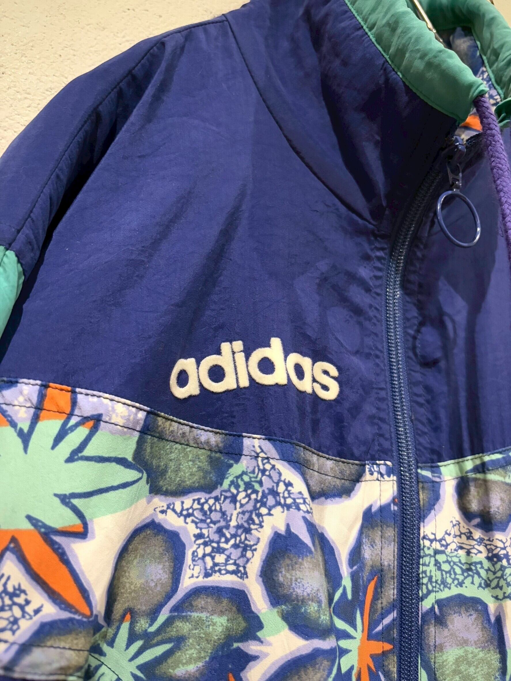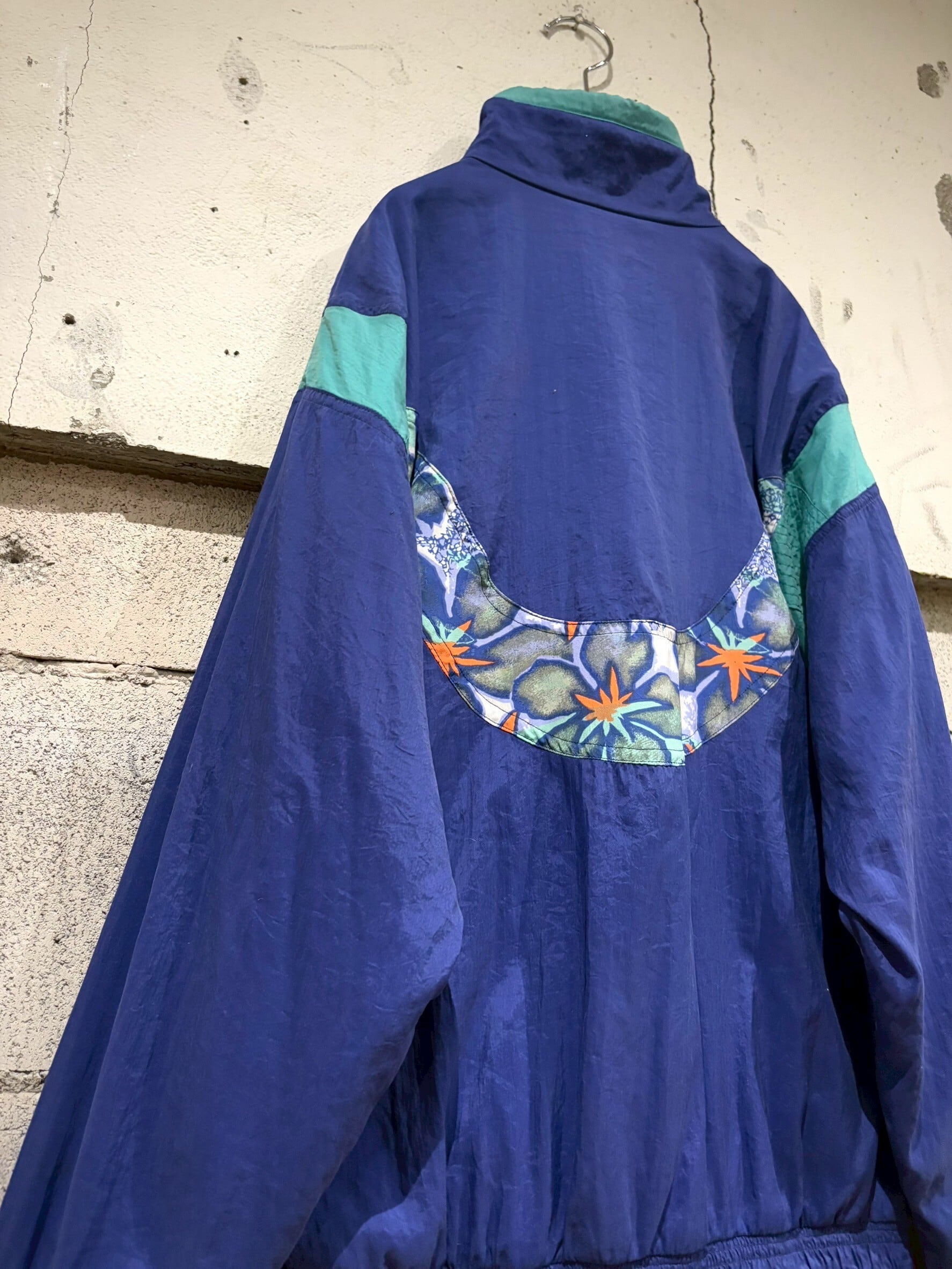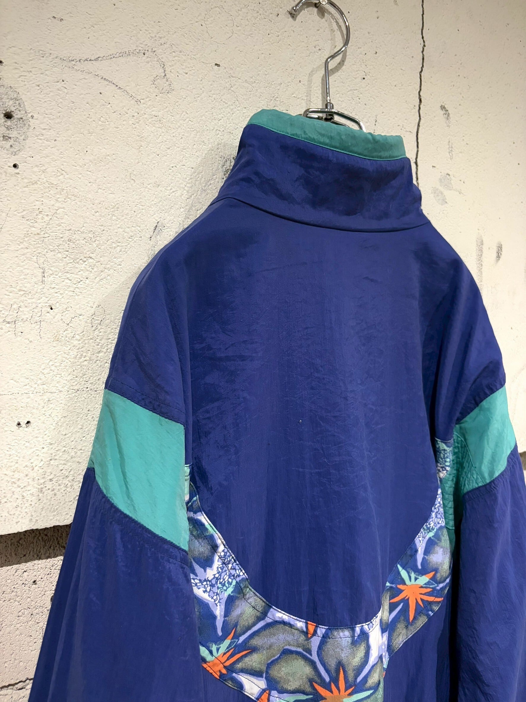 青×水色ベースのシャリ感のあるナイロンのボディに、美しくアーティスティックな花柄を切り替えた80's ユーロヴィンテージのスペシャルな1着。