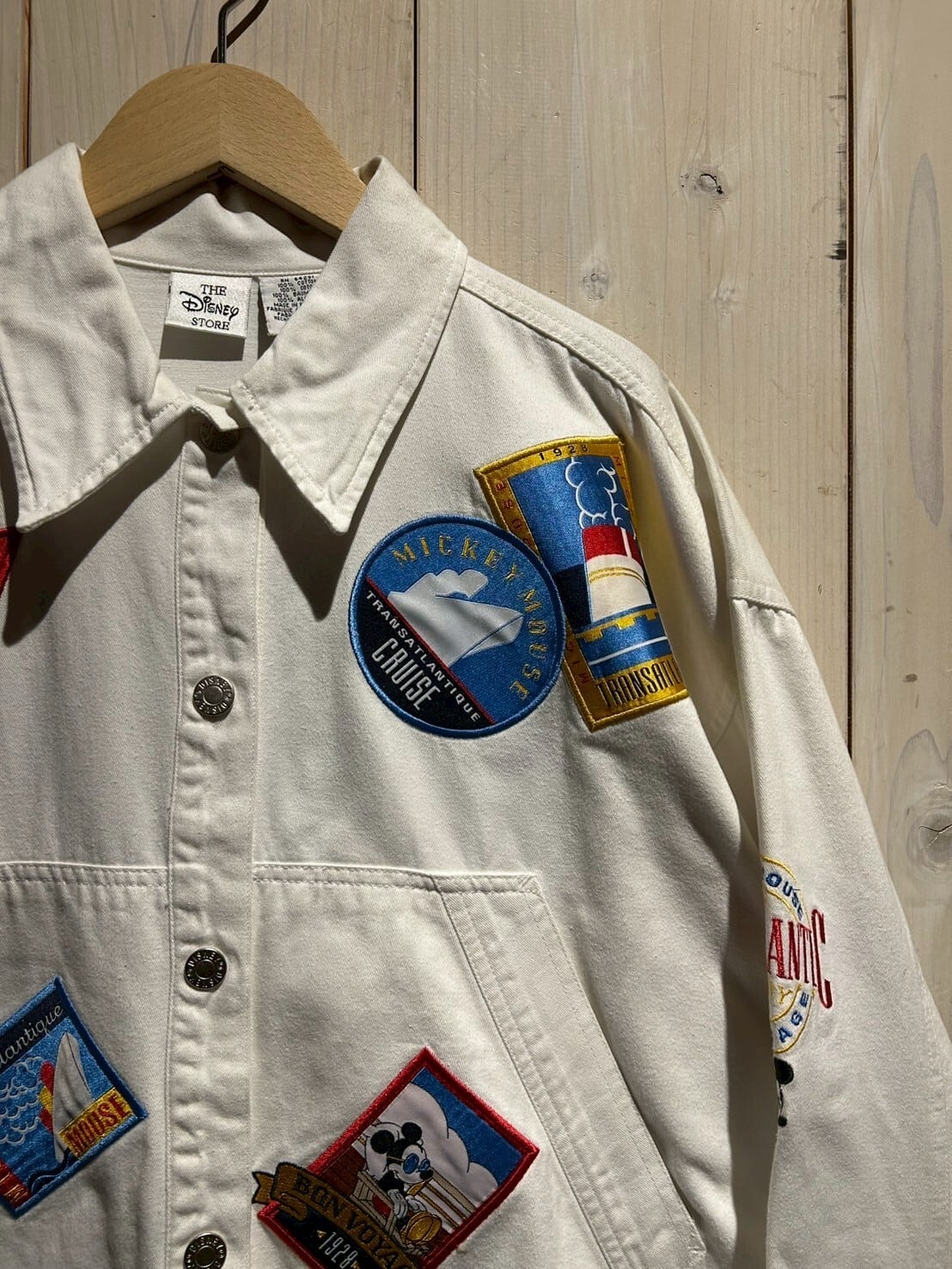 程よくくすんだホワイトをベースとしたデニムに、海モチーフのミッキーマウスのデザインが施されたワッペンを随所に貼り付けたデニムシャツジャケット。