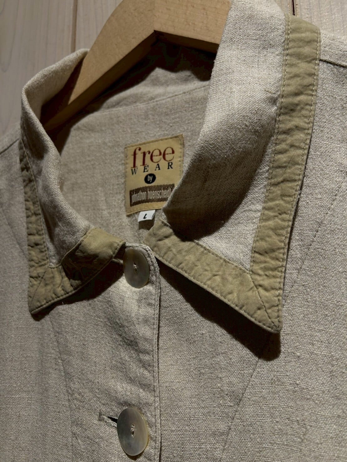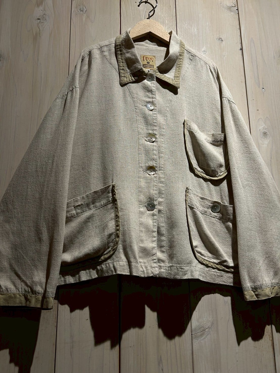 柔らかなベージュのボディをベースに、フロントに大きめのポケットを載せた、リネン混のジャケット。