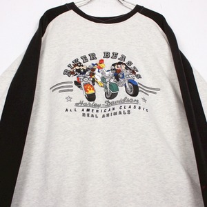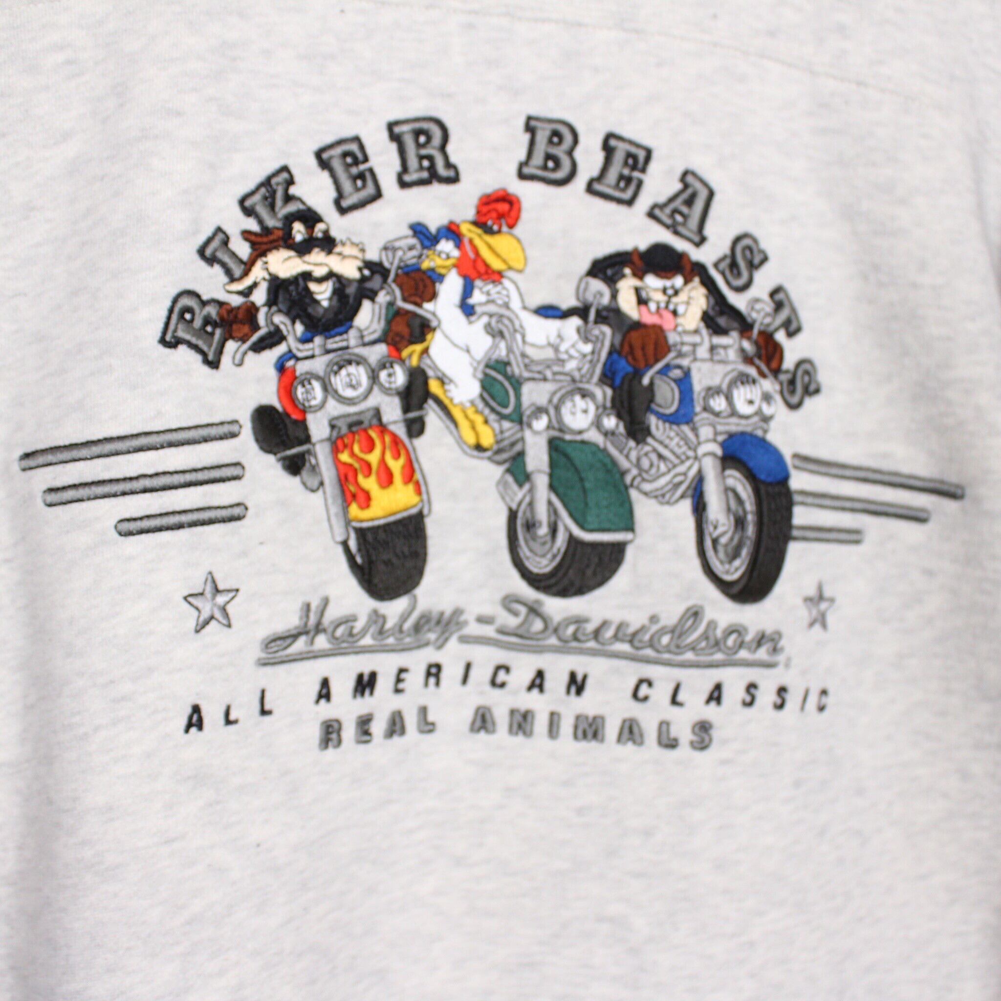ワーナーが制作するアニメシリーズ、"ルーニーテューンズ"に登場するキャラクター達がハーレーに載っている姿を刺繍で刻んだスウェット。