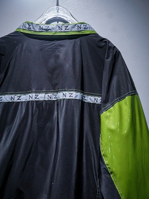 サラッとしたブラックのボディをベースに、パキッとした鮮やかなグリーンのビニール素材を切り替えたジャケット。