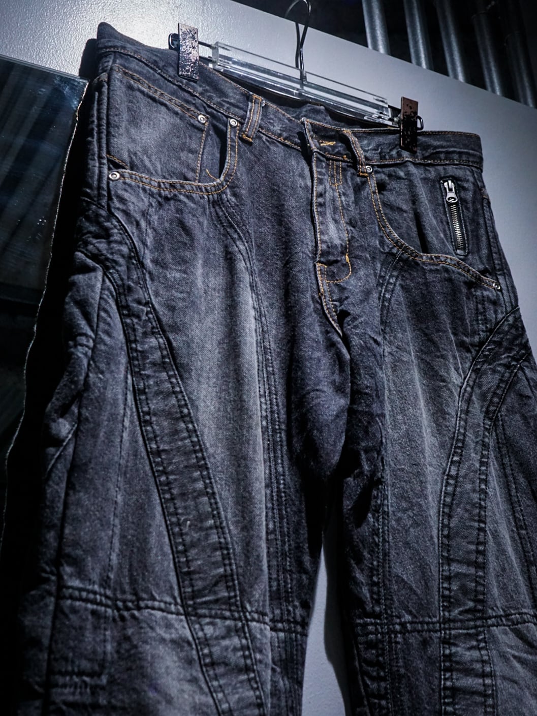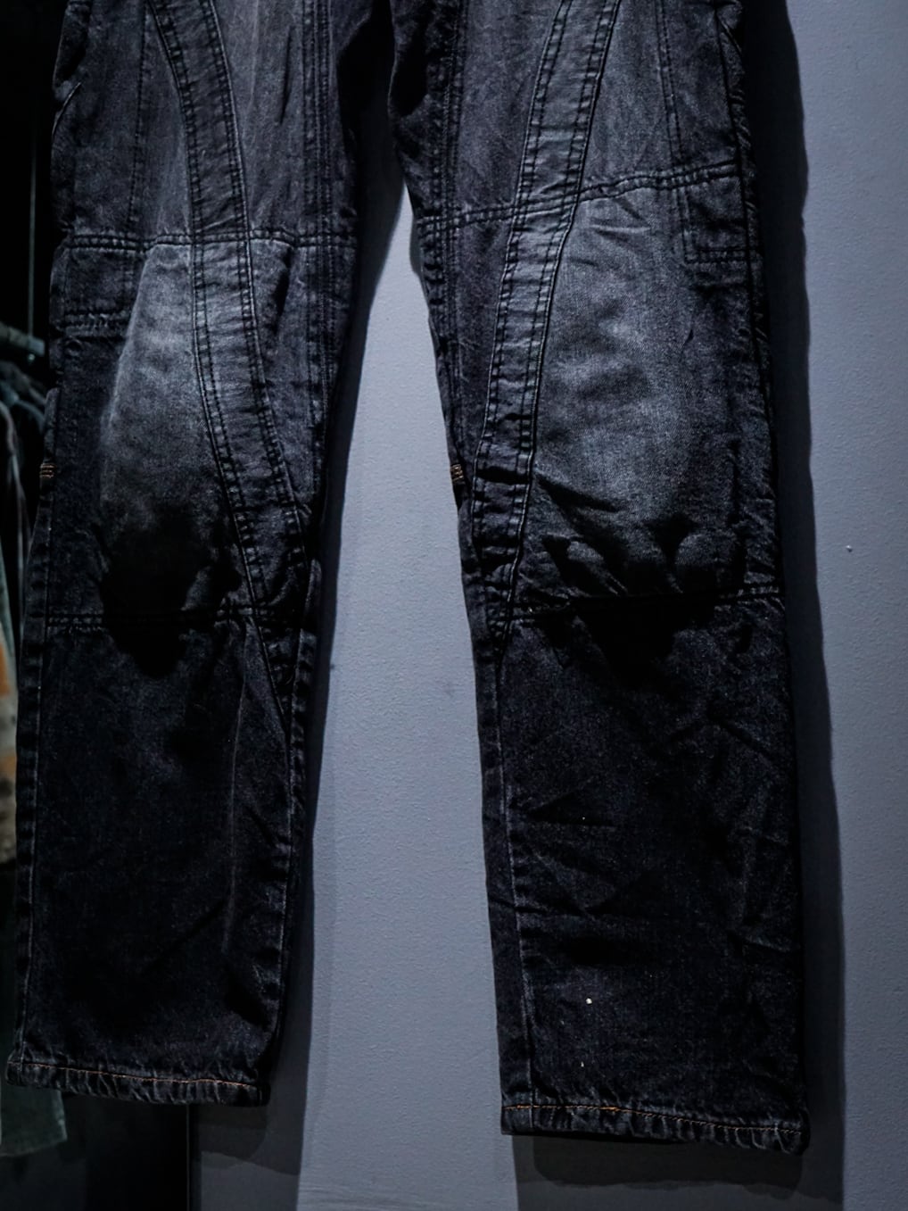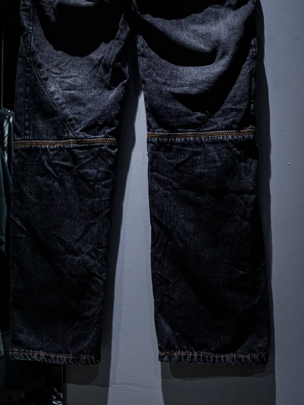 美しくフェードしたブラックデニムに、立体裁断調の切り替えを施し膝部分には出し入れ可能なパッドが装備されている稀有なデニムレーシングパンツをご紹介いたします。