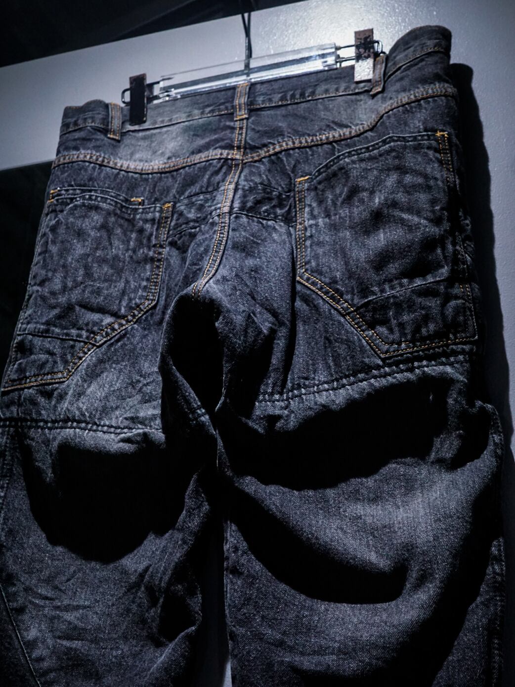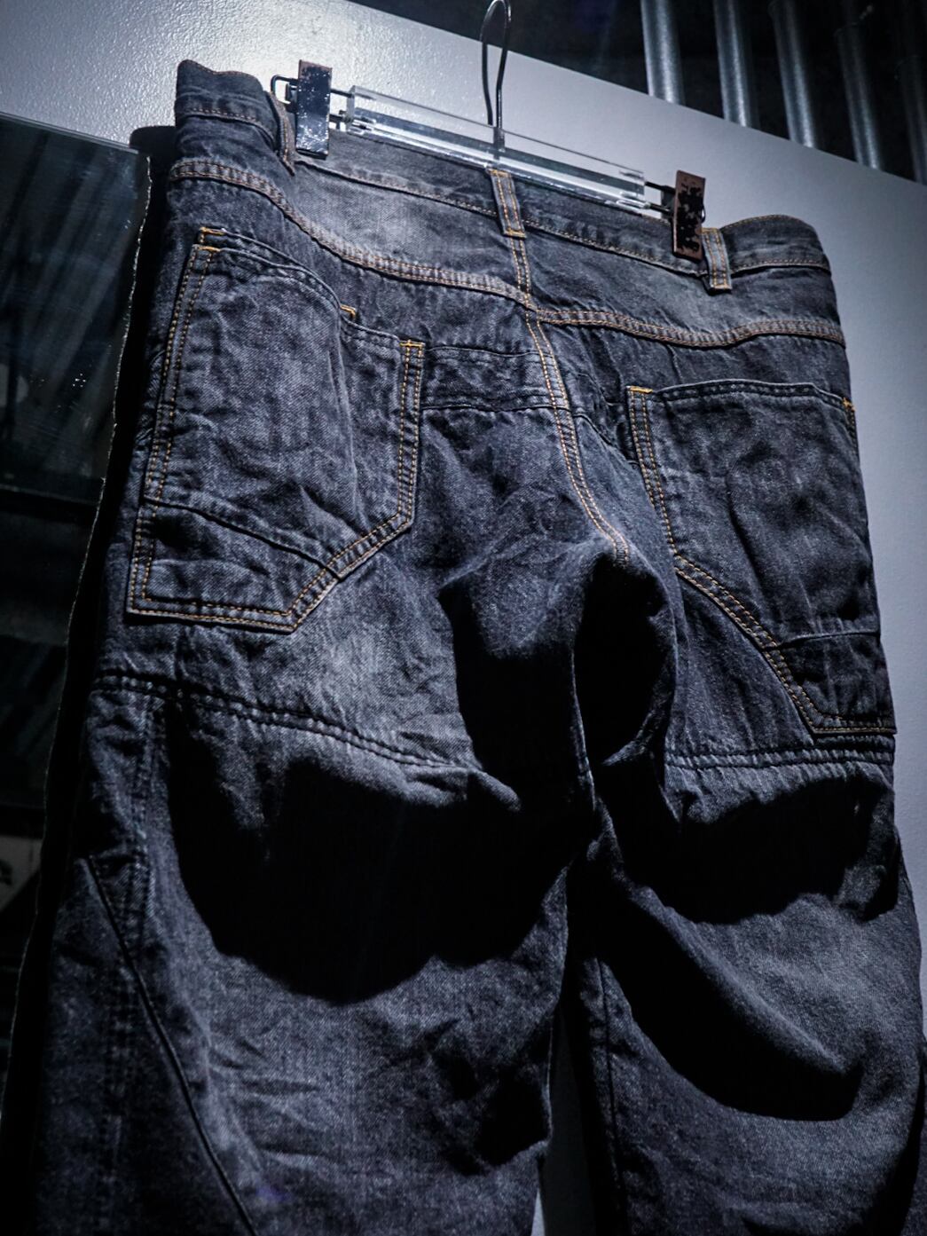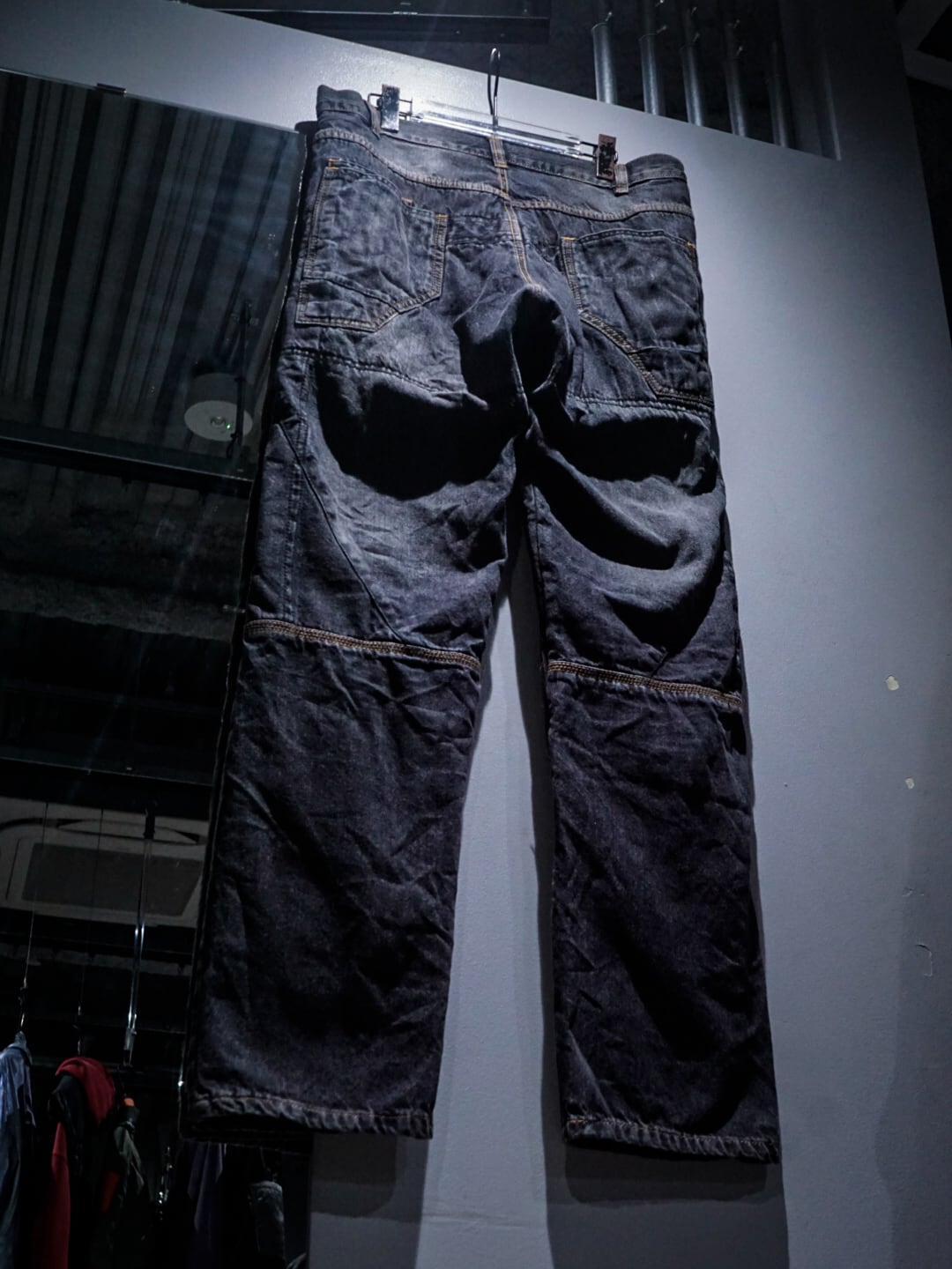 美しくフェードしたブラックデニムに、立体裁断調の切り替えを施し膝部分には出し入れ可能なパッドが装備されている稀有なデニムレーシングパンツをご紹介いたします。