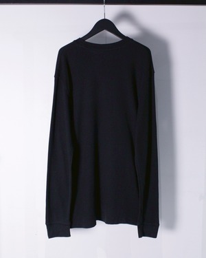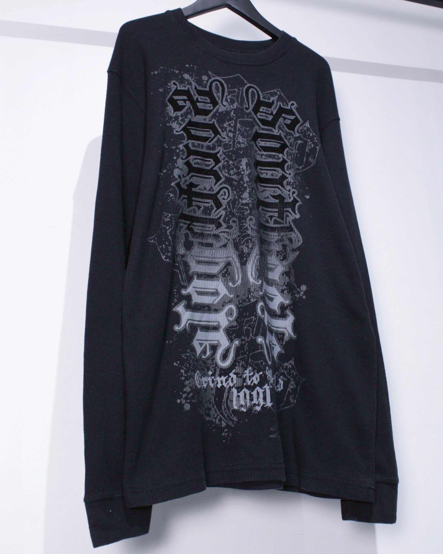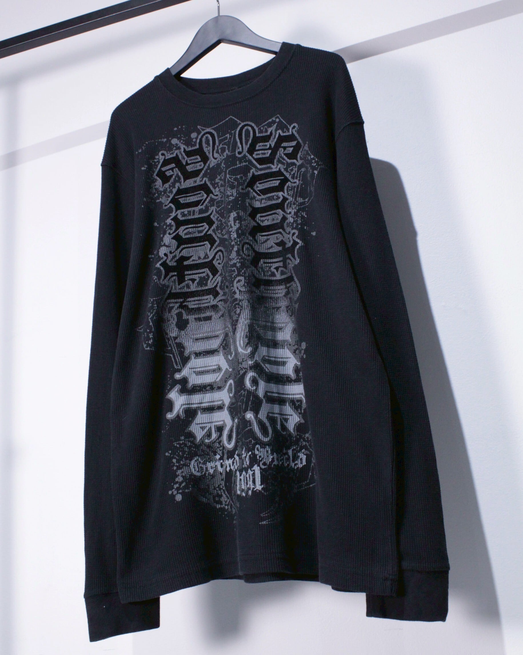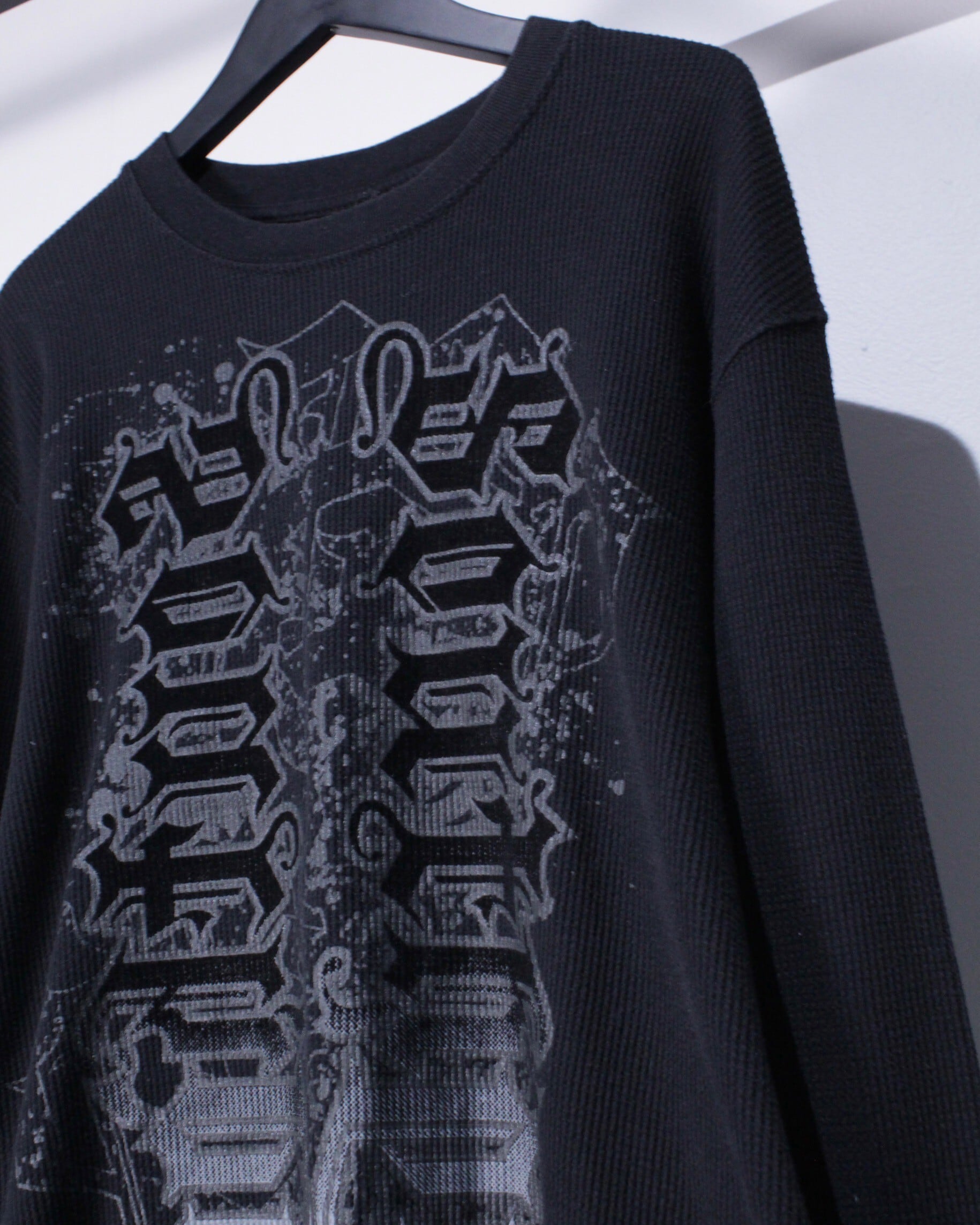 ブラックのボディをベースに、ゴシック風にブランドロゴをプリントで載せたサーマルロンT。