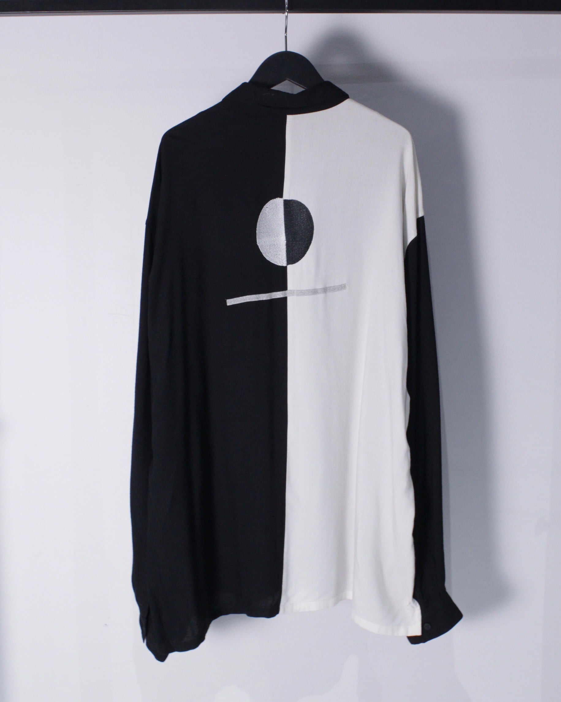 ブラックを基調としたボディに、シンプルに洗練されながらどこか独特な雰囲気を放つ黒の切り替えが前身頃と襟に施されたデザインの長袖シャツ。
