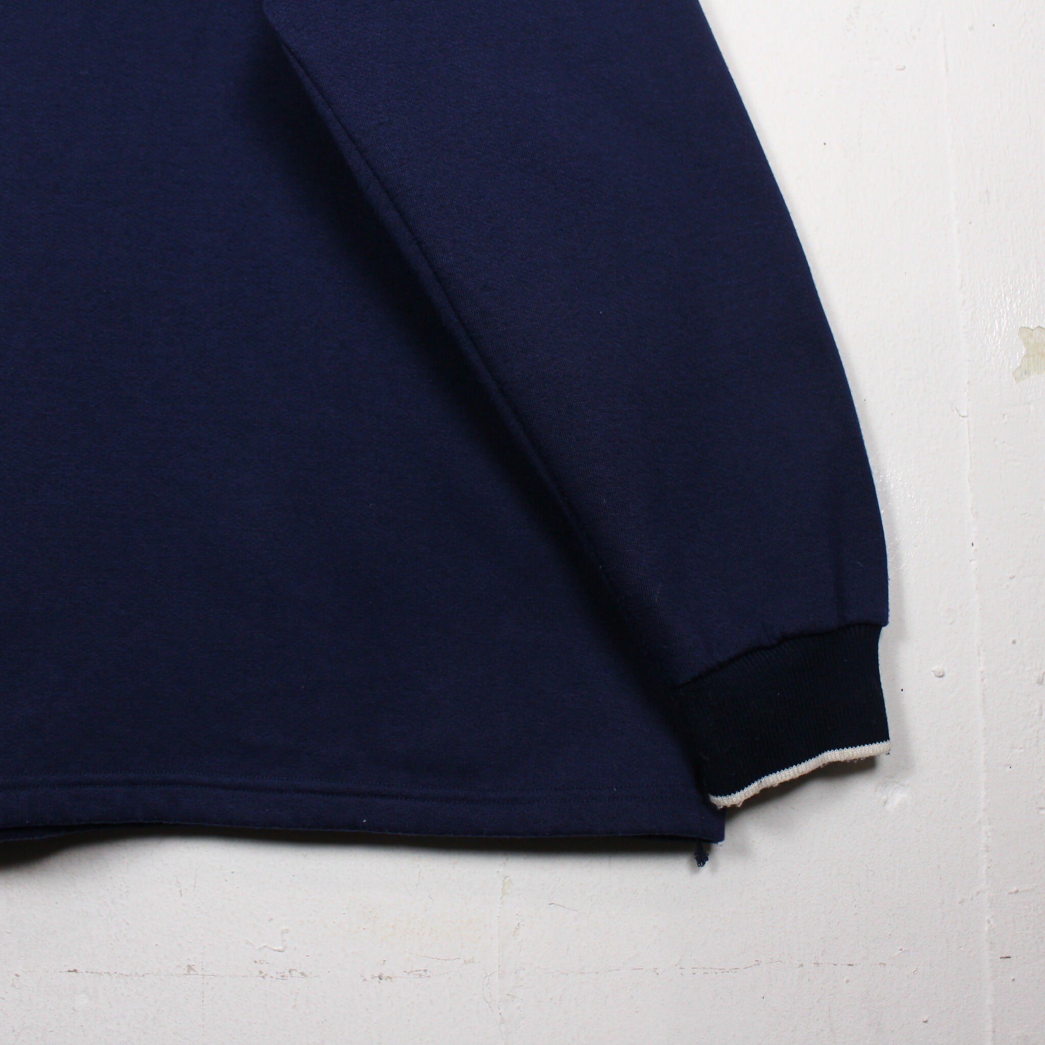 ネイビーのボディをベースに、襟、フロントにブランドネームを載せたニットを切り替えたスウェット。
