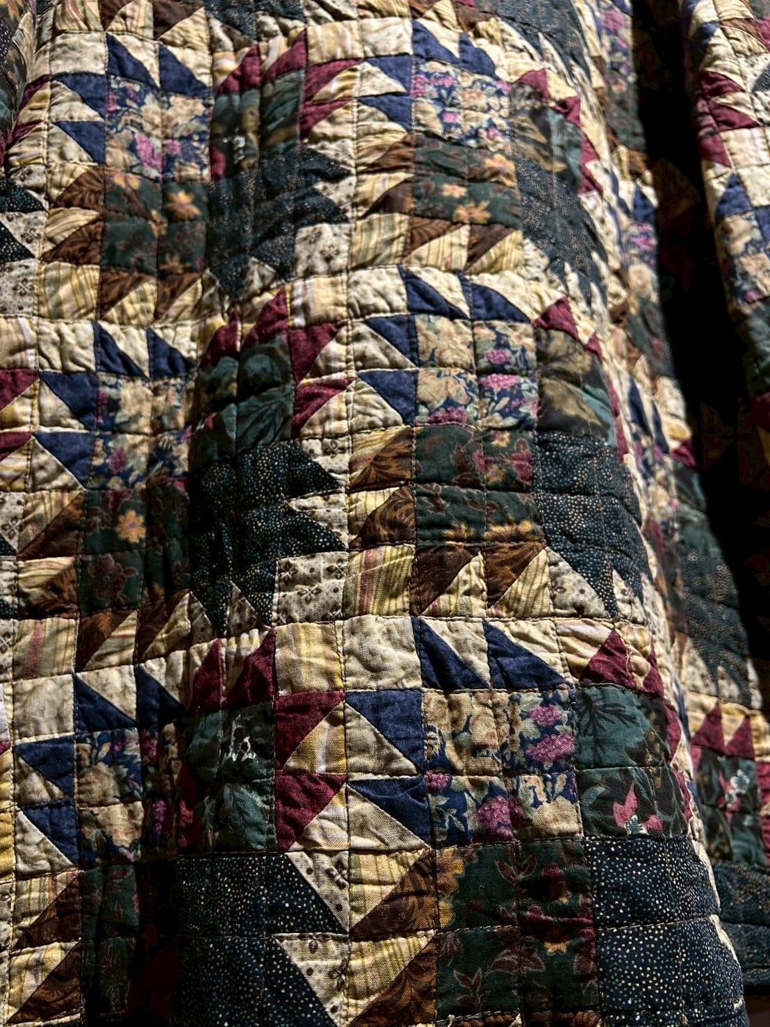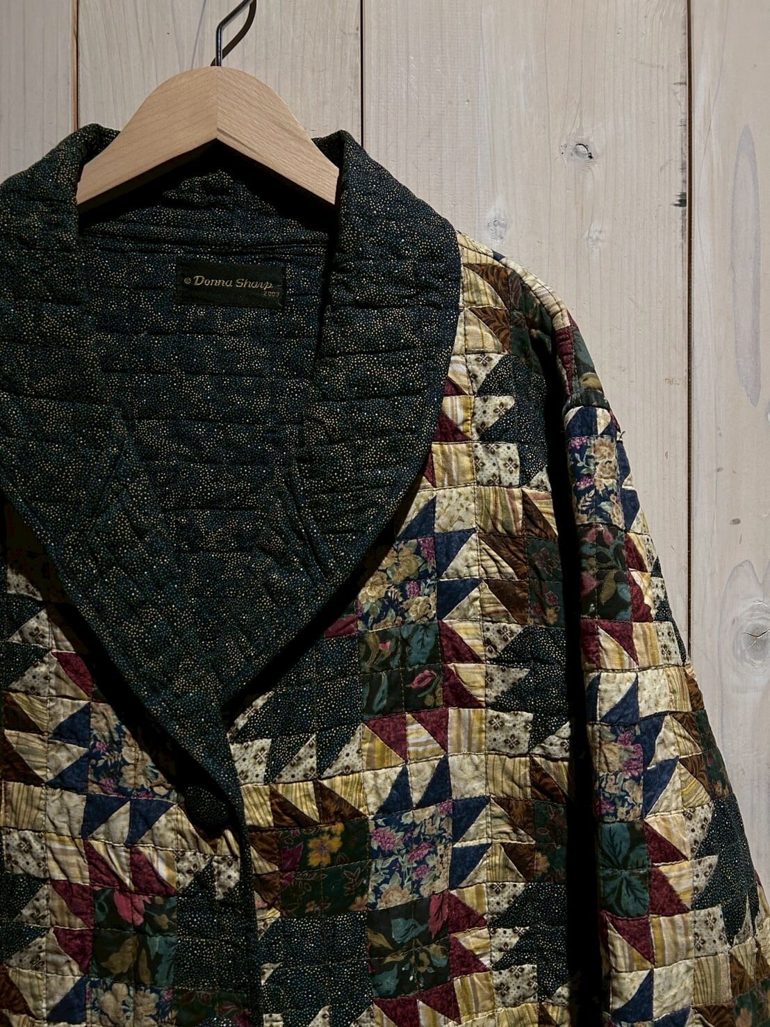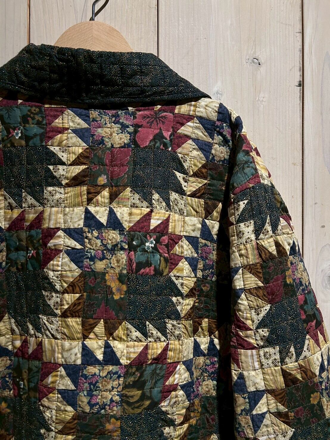 様々なパターンの花柄を載せたテキスタイルを規則的に繋ぎ合わせた、スペシャルなキルトジャケット。