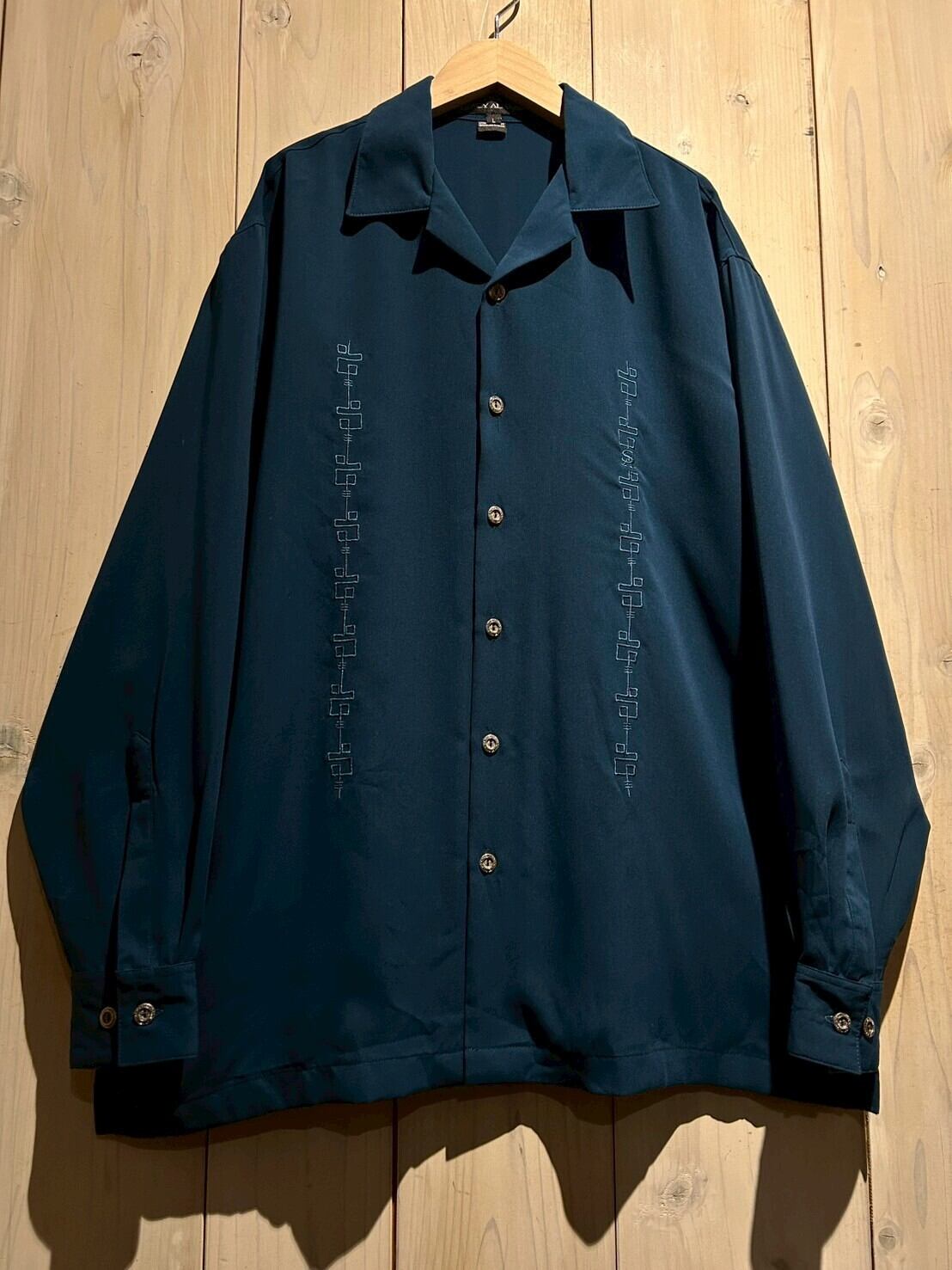 ハリがありながらも滑らかな素材を用いたボディに、フロントに幾何学的な柄の刺繍を刻んだ長袖オープンカラーシャツ。