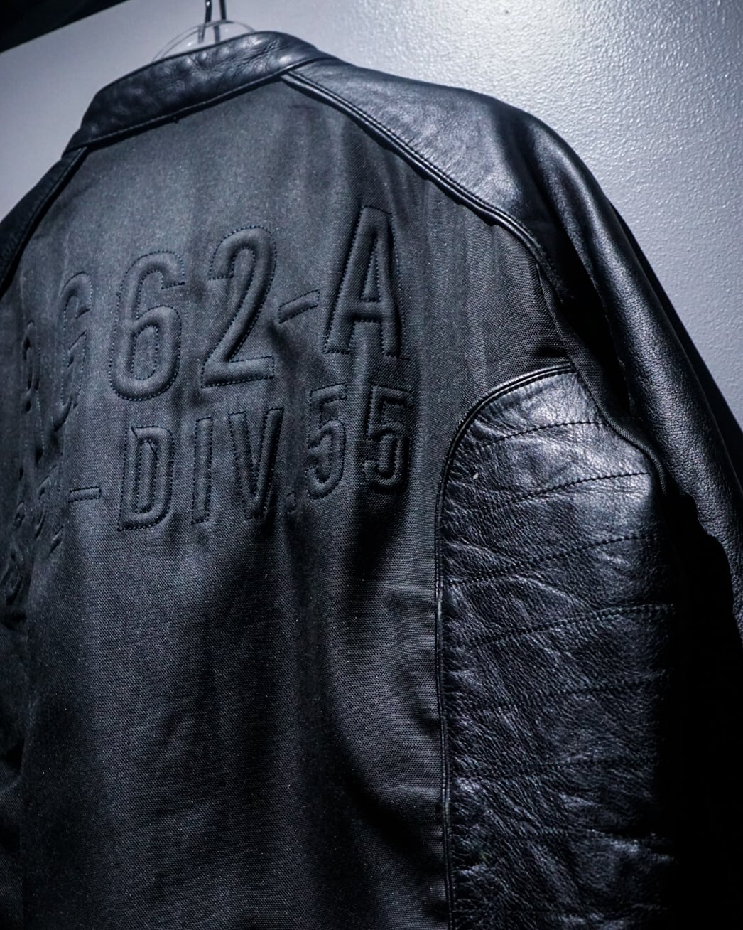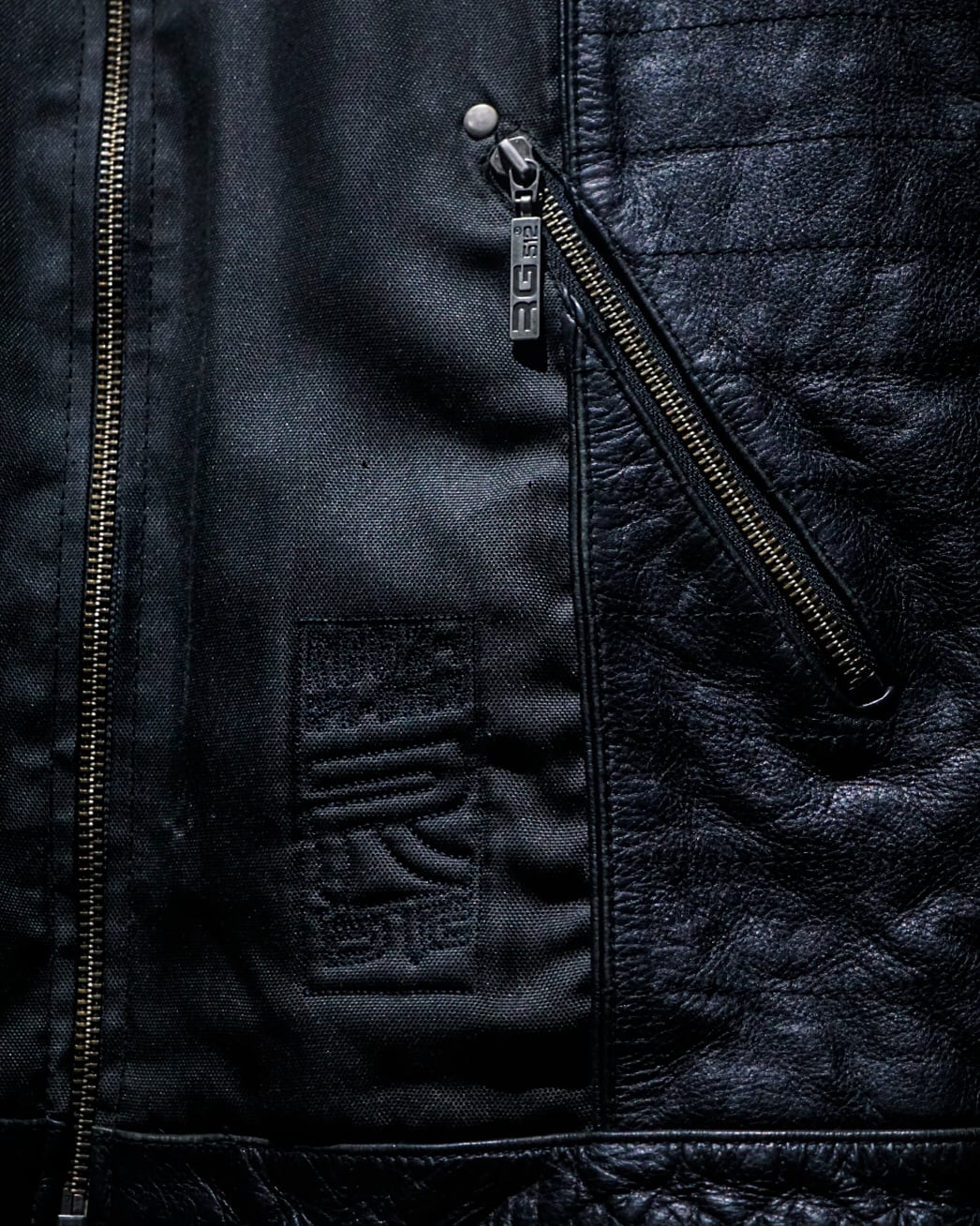 首元からアームにかけて、ボディサイド、裾にレザーを切り替えた事でオールブラックのボディにアクセントが加えられて、強化の役割も果たしています。