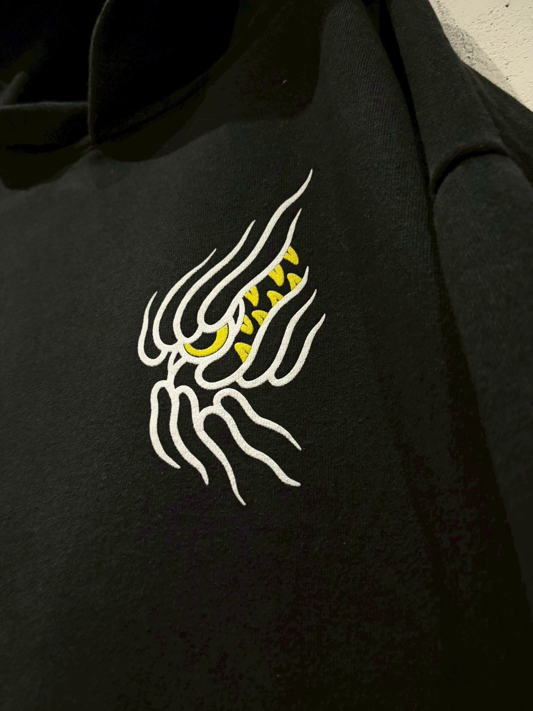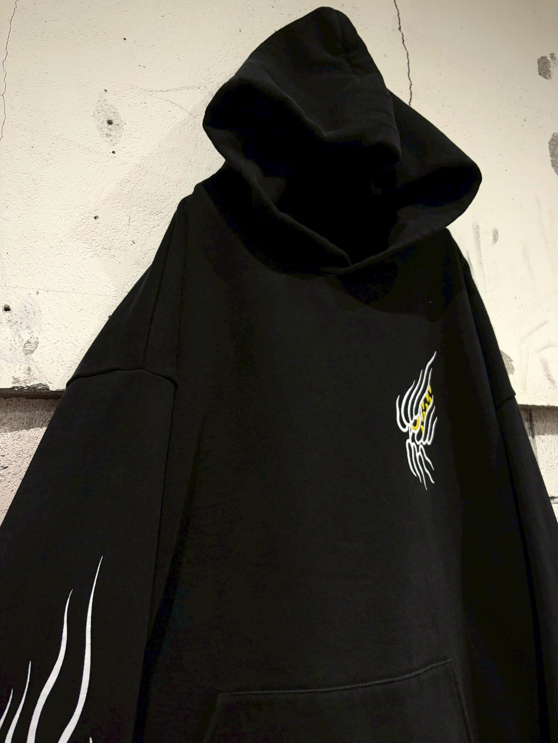 肉感のあるブラックのボディをベースに、トライバル調のウルフをプリントで載せたプルオーバーフーディ。