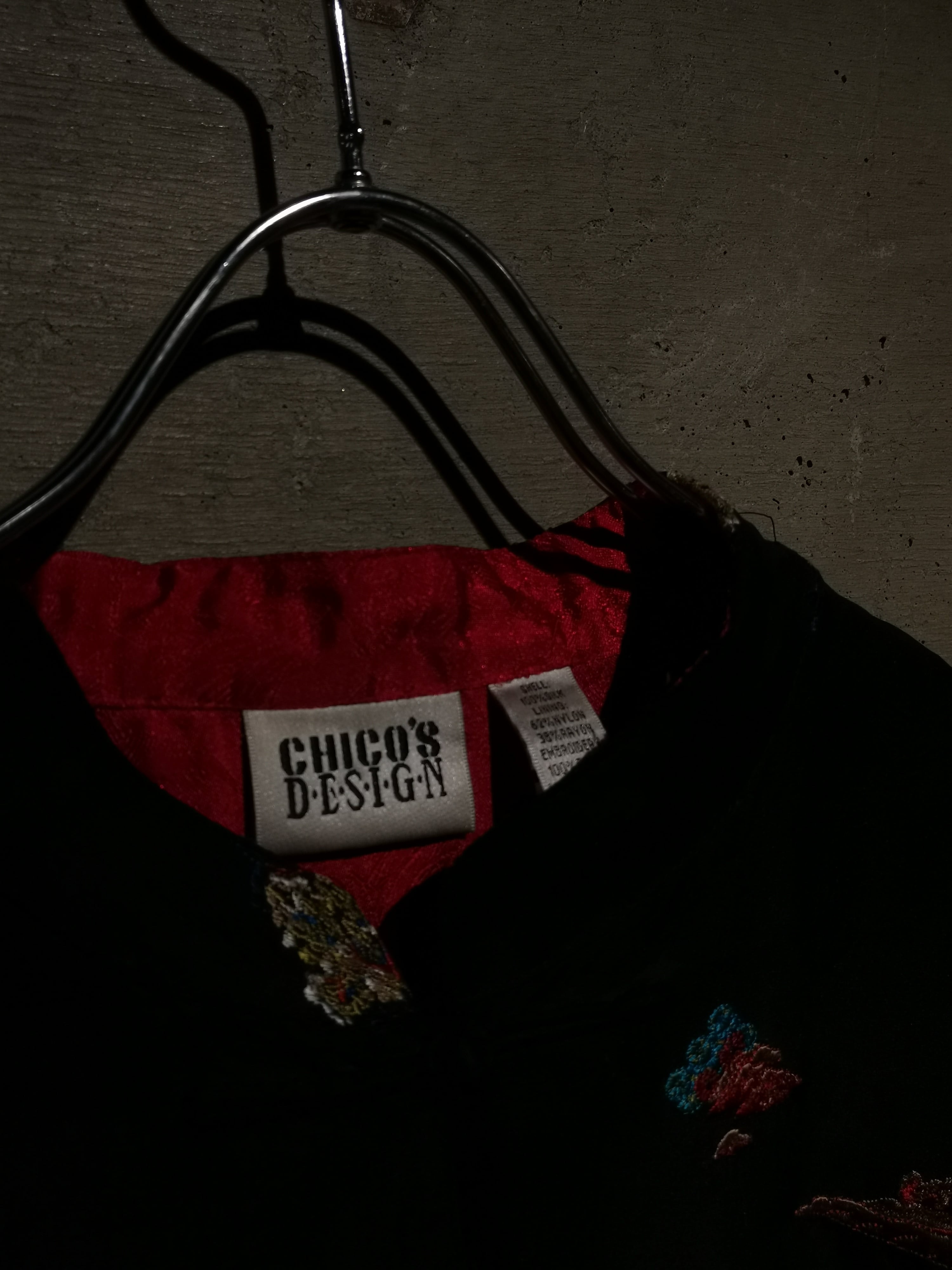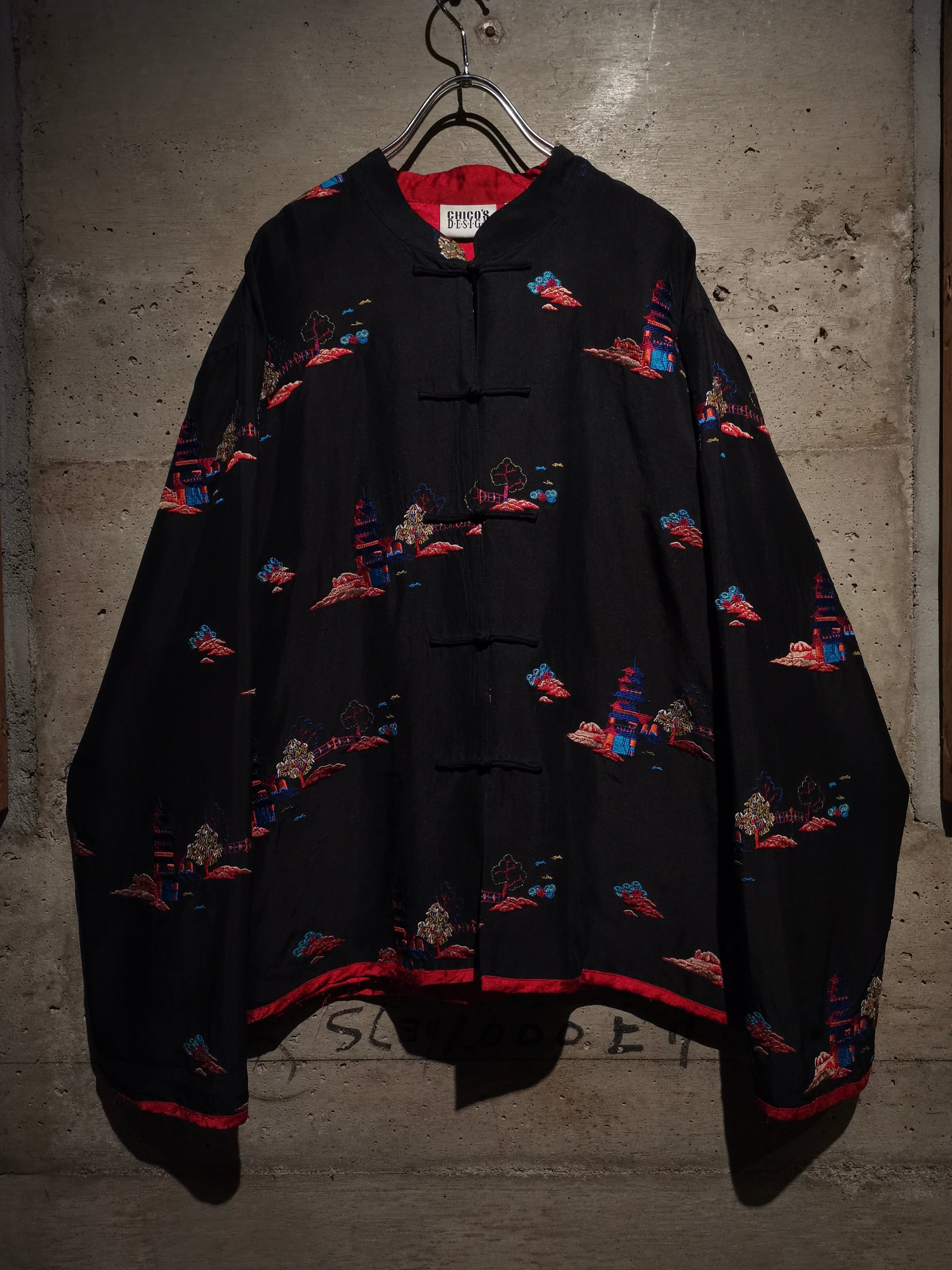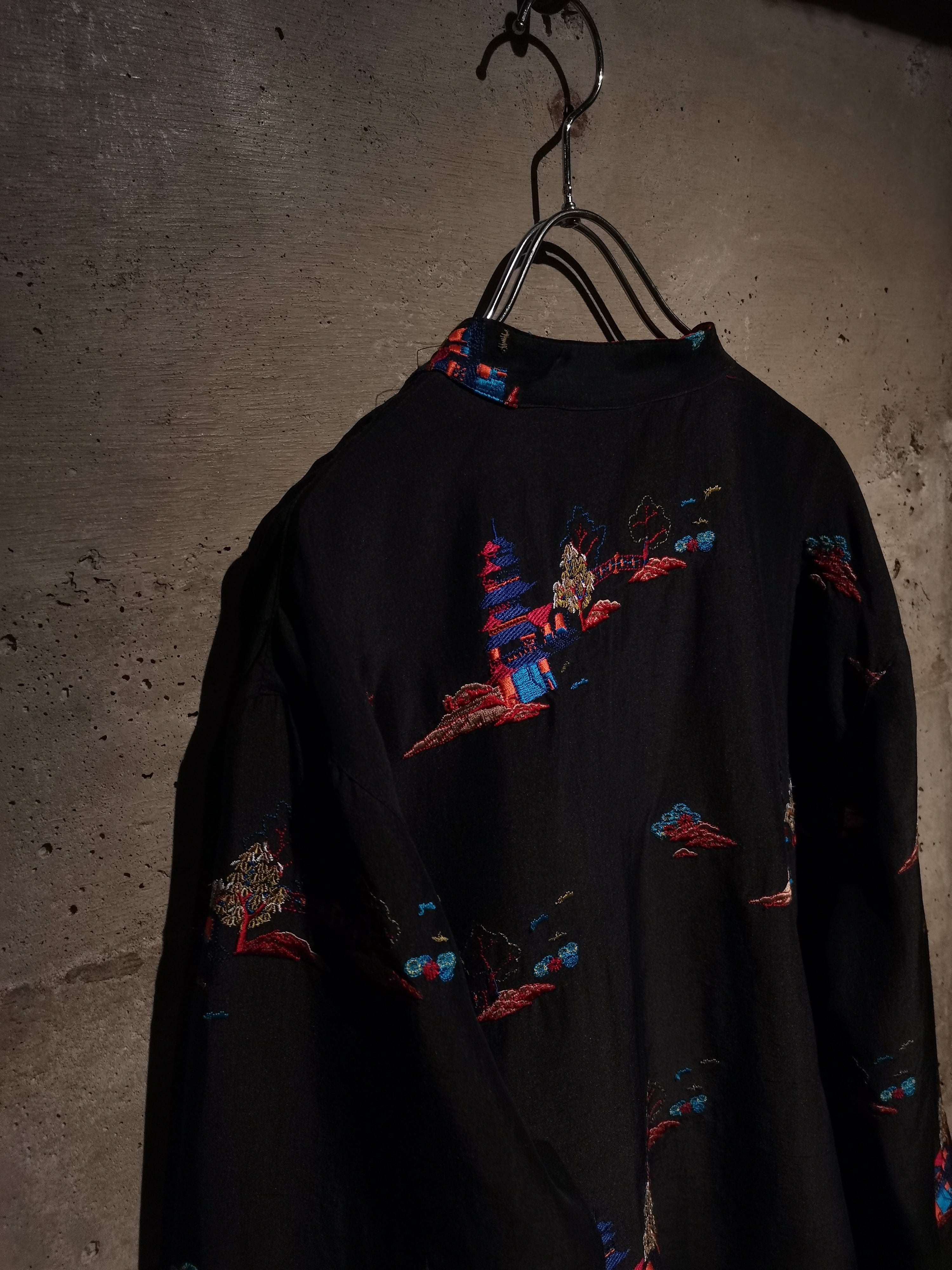 滑らかなブラックのシルクボディに、中華的な異国の雰囲気を漂わせる刺繍を刻んだチャイナシャツ。