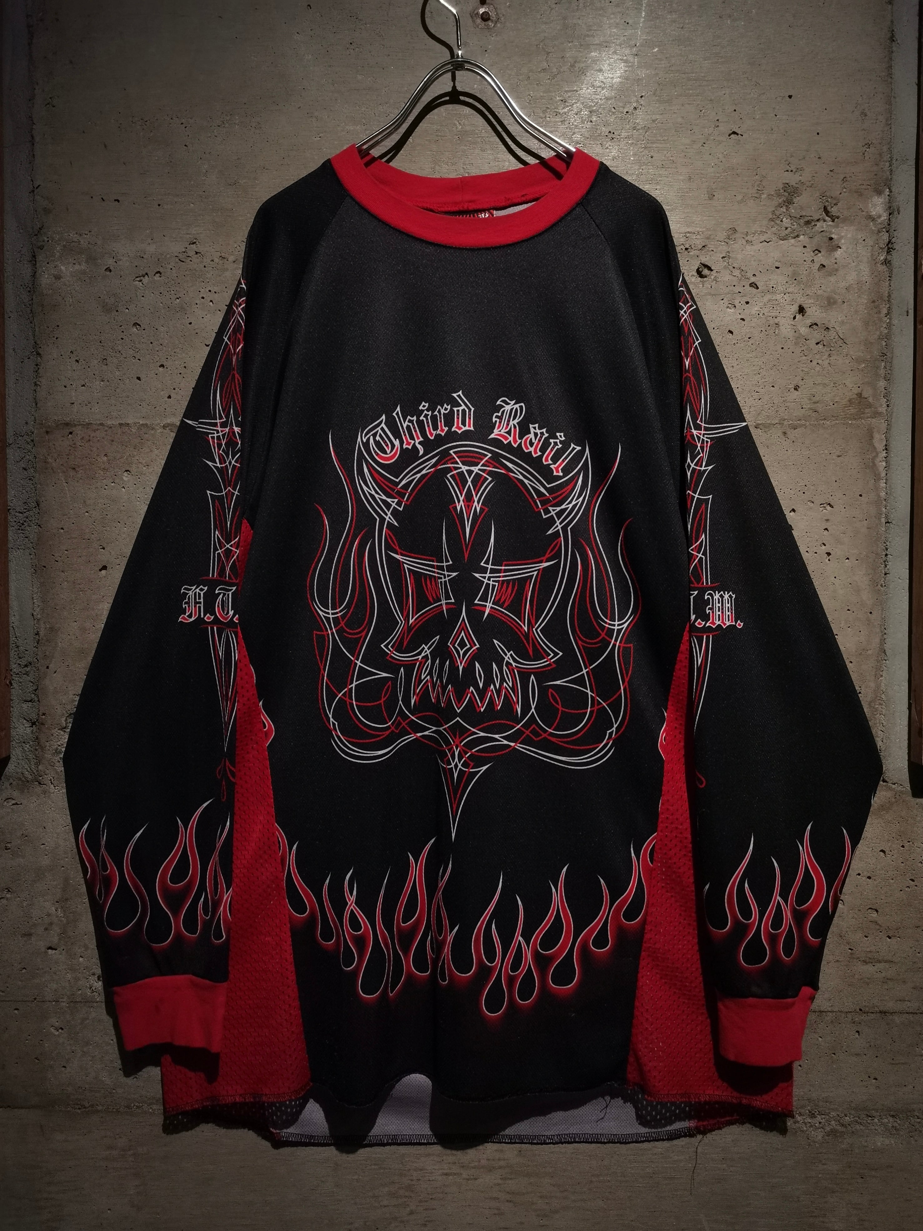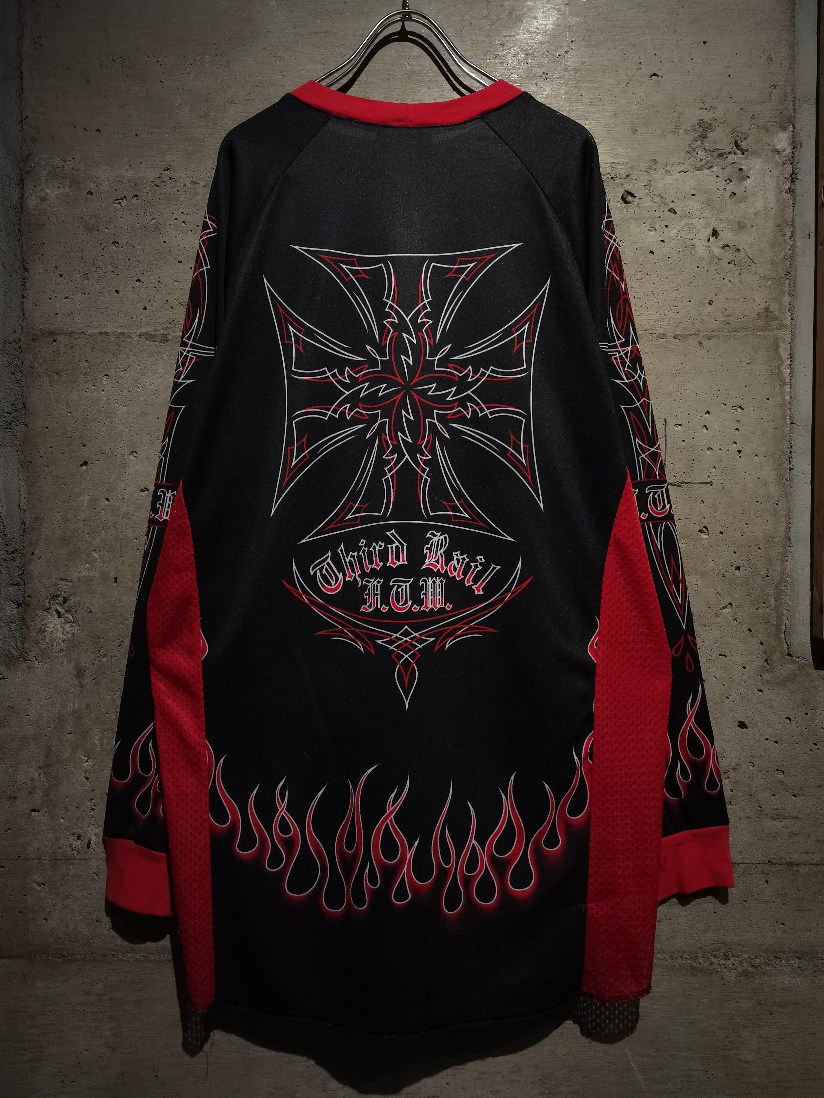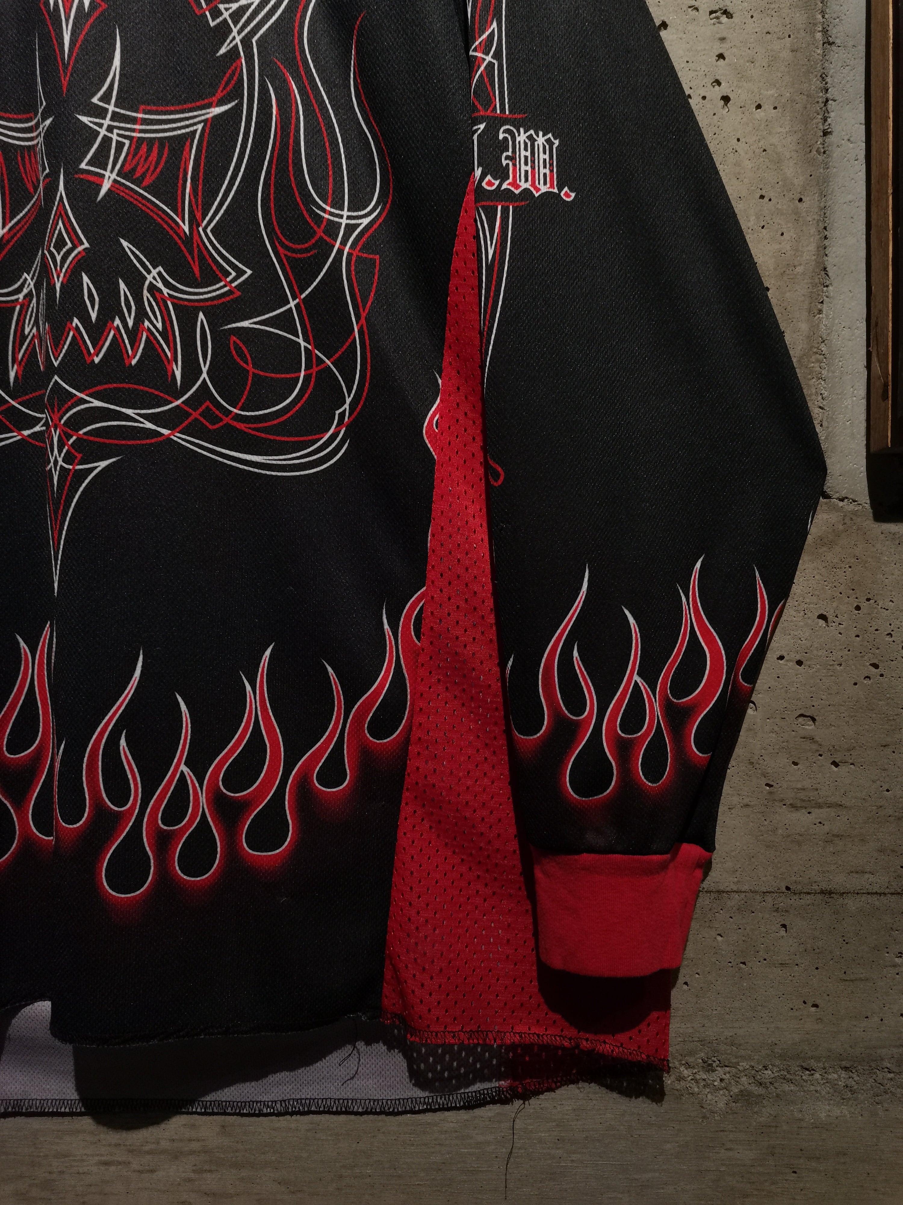 ブラックのボディをベースに、トライバル調のスカルにファイアー、背面にはアイアンクロスモチーフのデザインを載せたゲームシャツ。