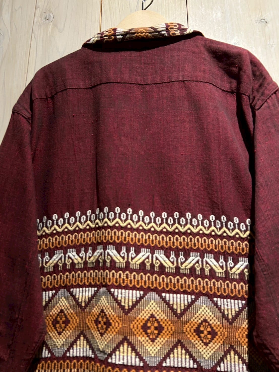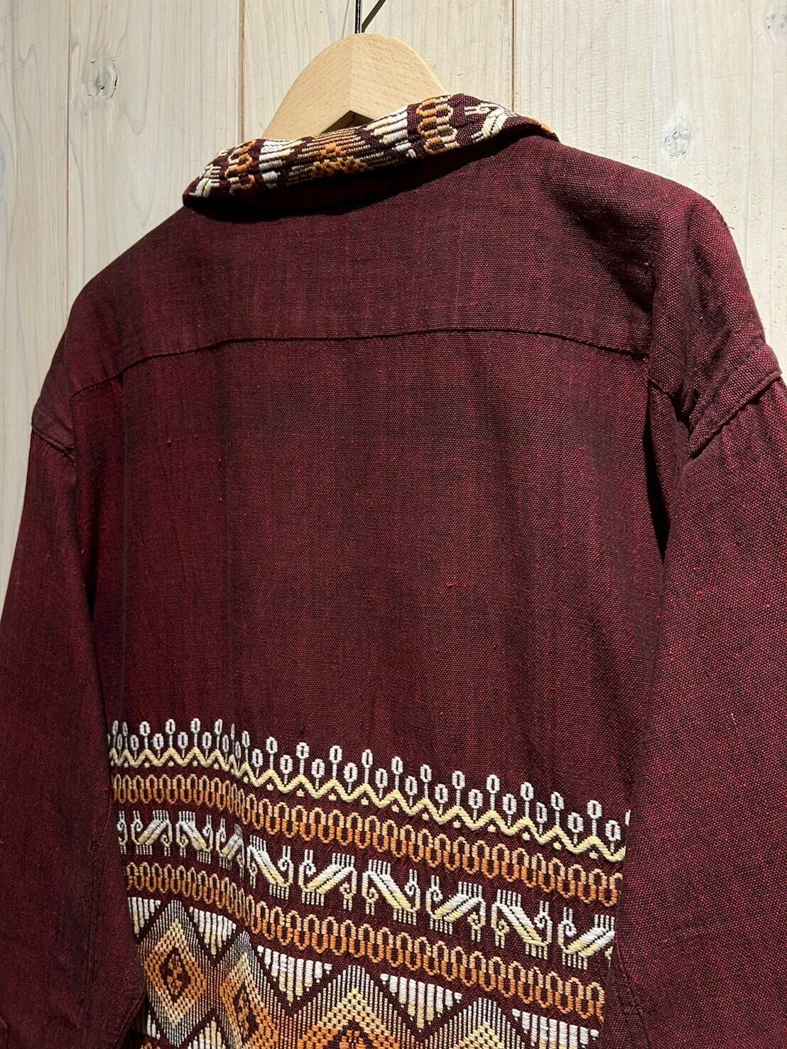 タフかつコシのある生地を用いたボディに、グラデーションの美しいエスニック調の刺繍刻んだシャツジャケット。