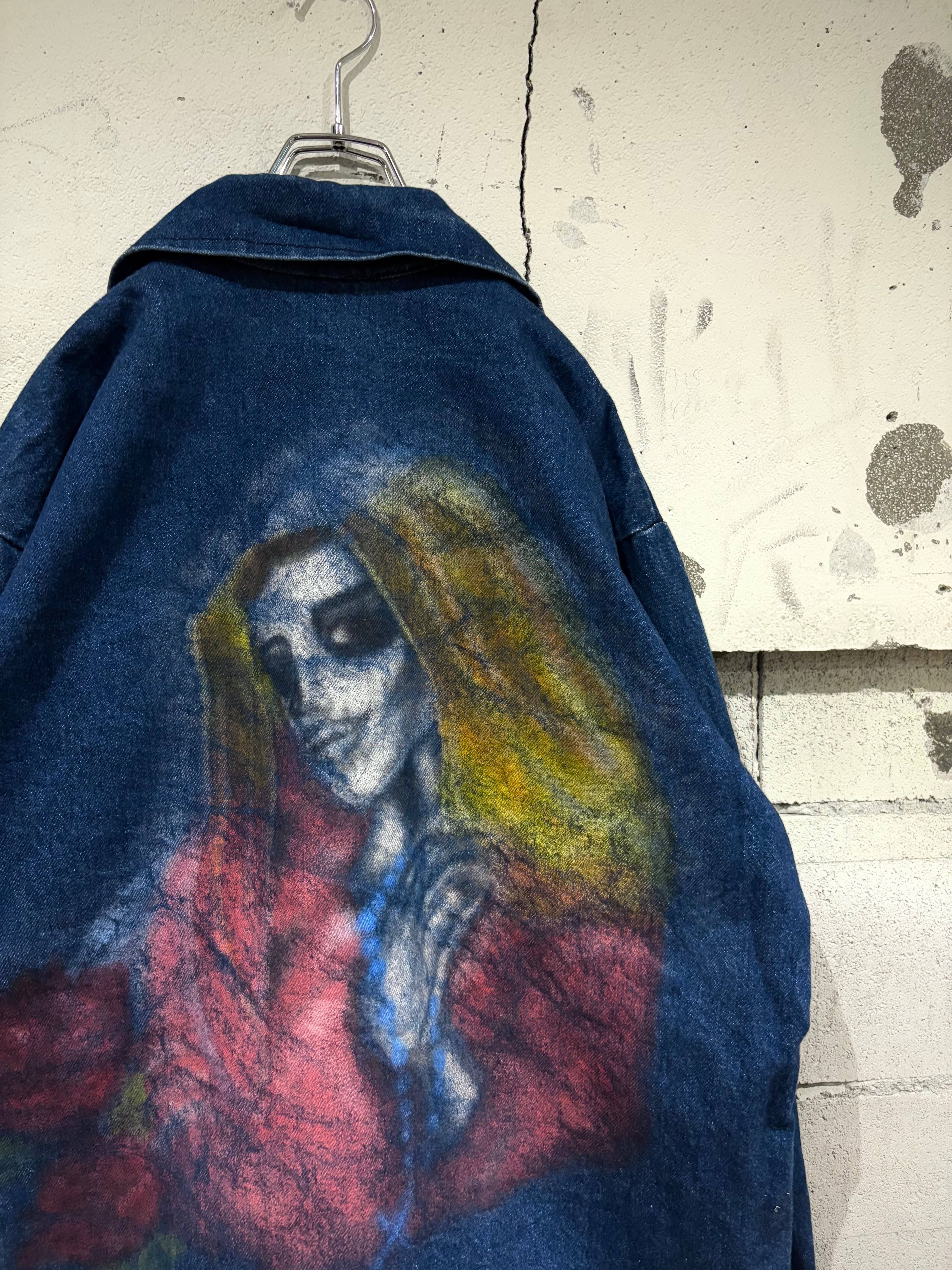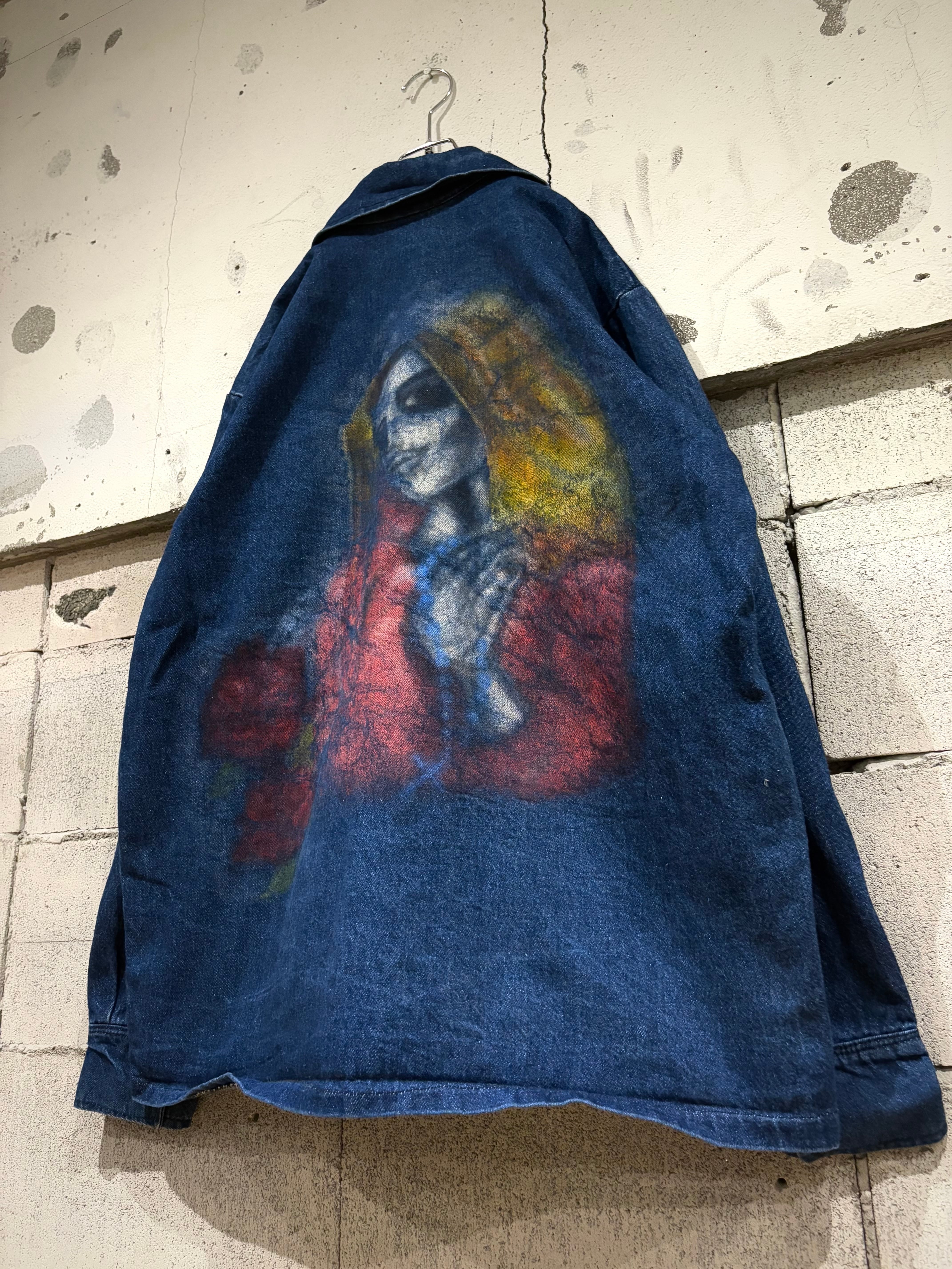 ヴィンテージのデニムカバーオールジャケットに、左胸ポケット"Stussy"の代表的なモチーフであったり、スラングとして用いられたりと、ストリートカルチャーと深い関わりを持つ"8ボール"、背面には薔薇を眺める女性をハンドドローイングで載せた逸品。