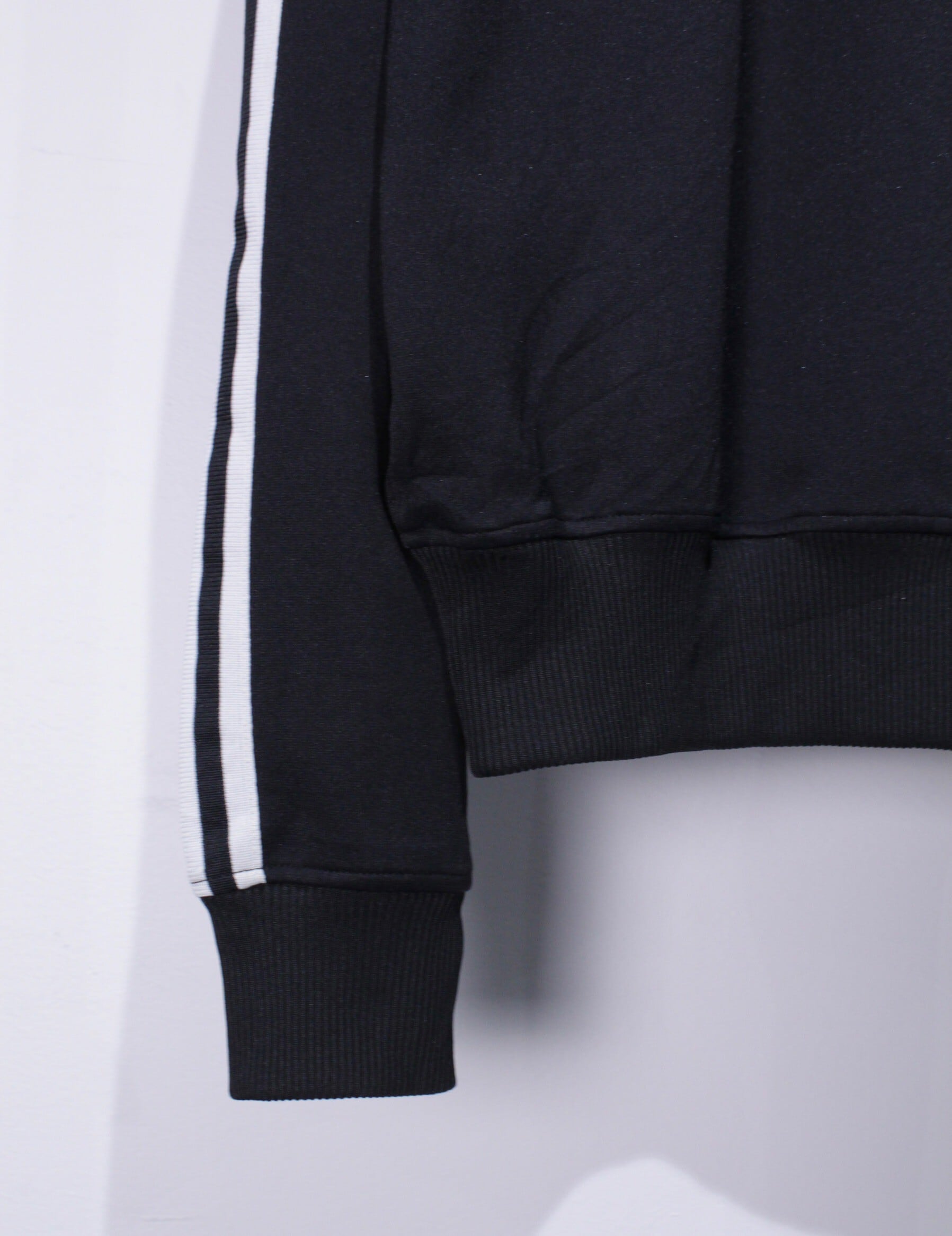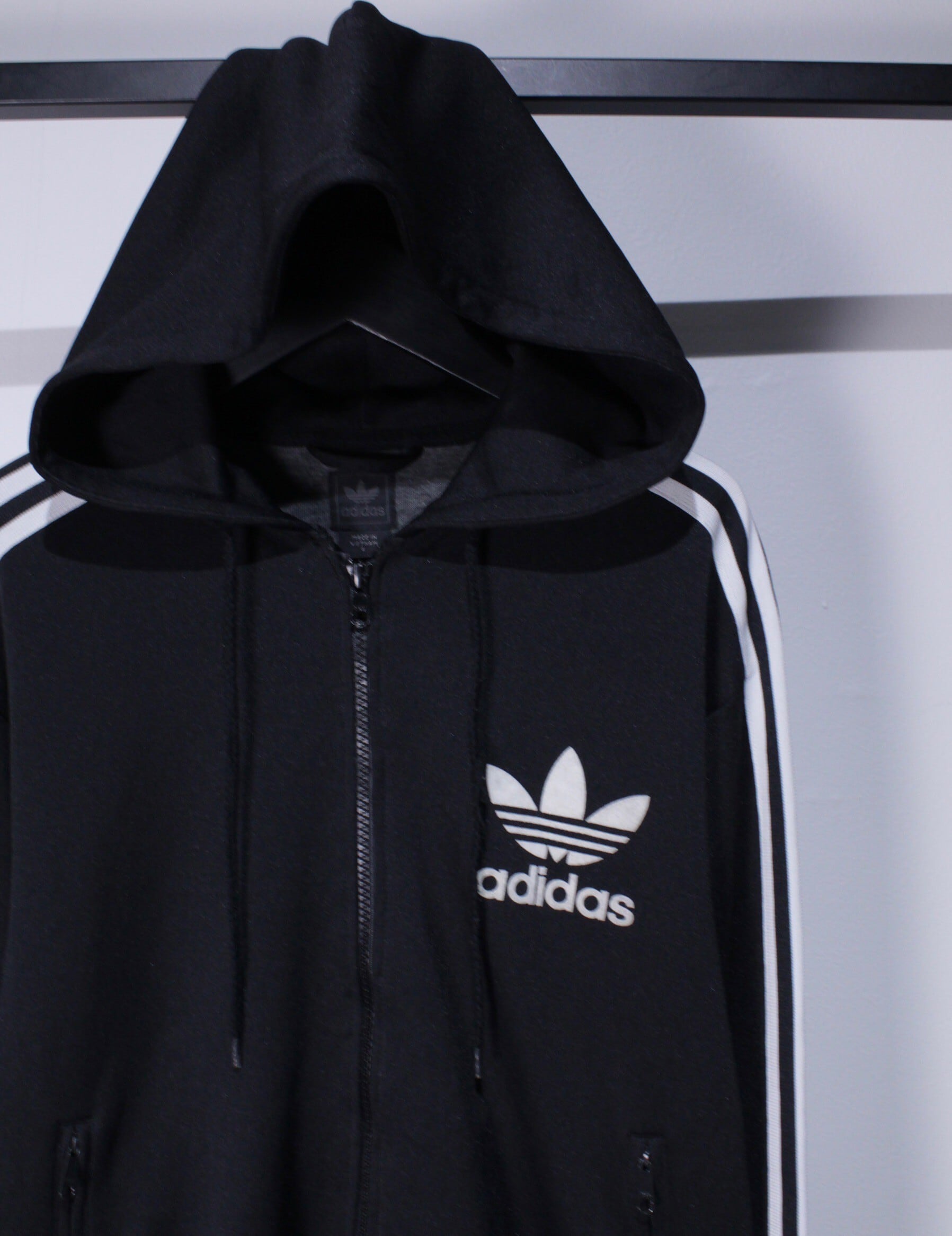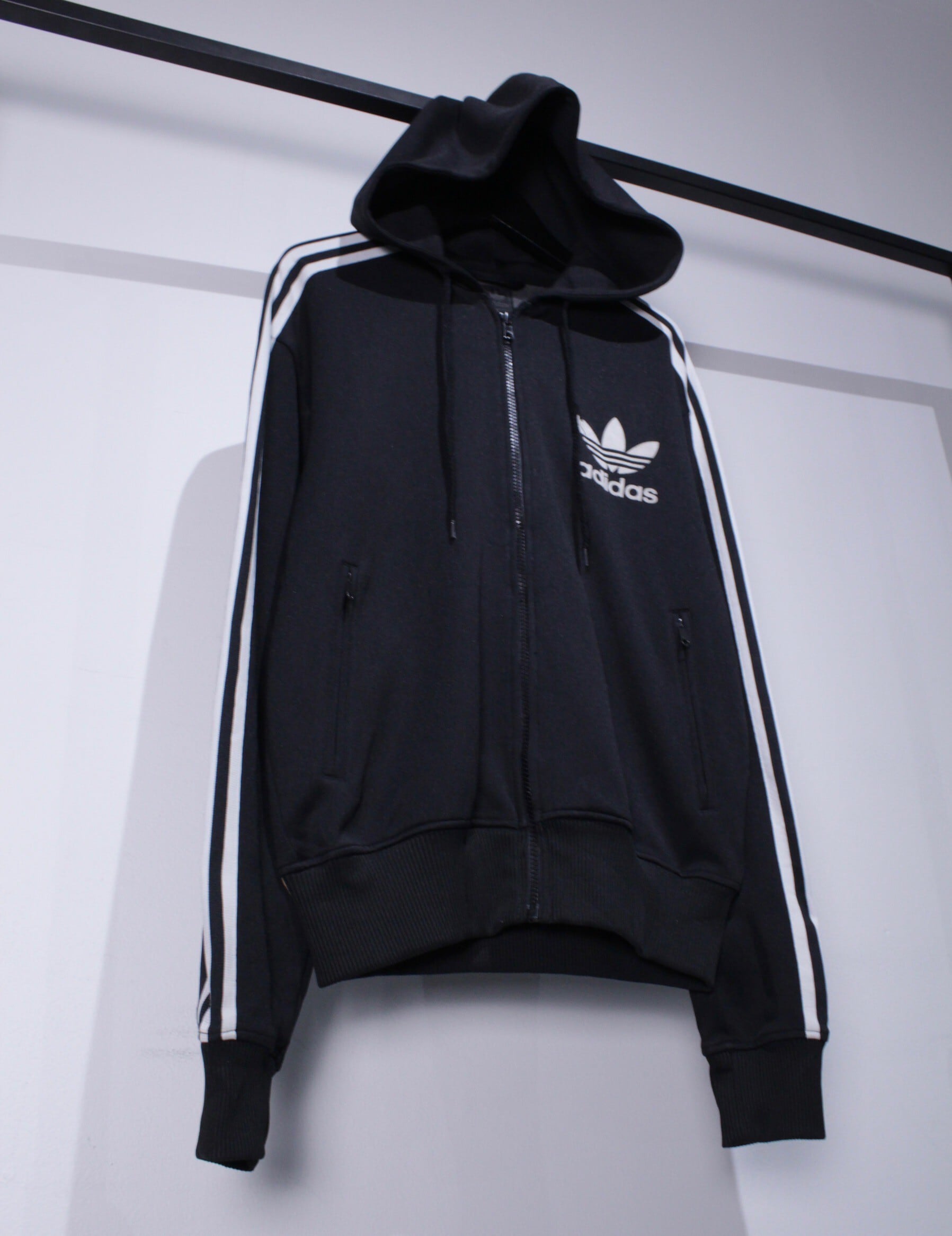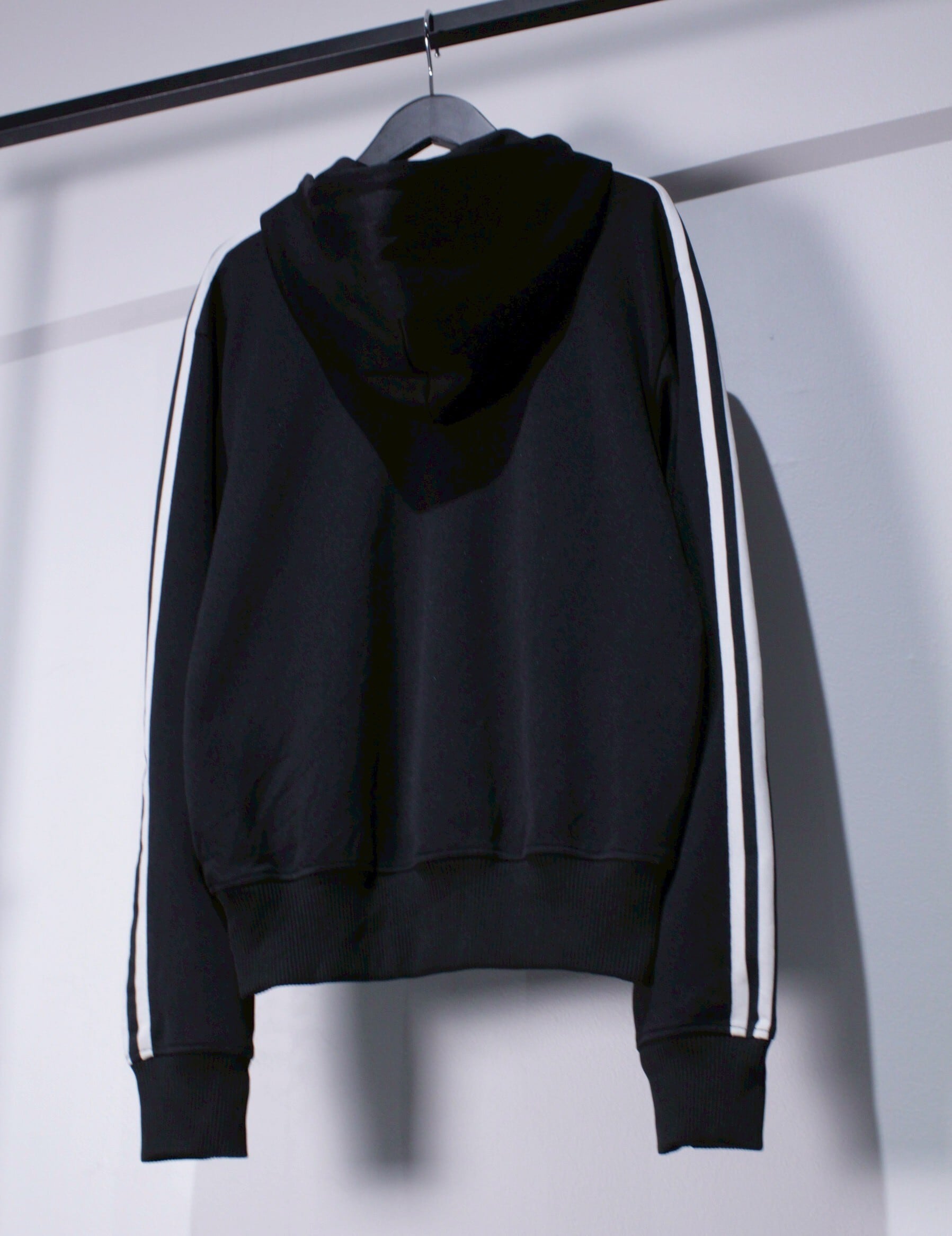 ブラックのカラーをベースに、アディダスの代名詞でもあるブラック×ホワイトの3ラインを施したこのブランドらしいデザインのジップフーディー。