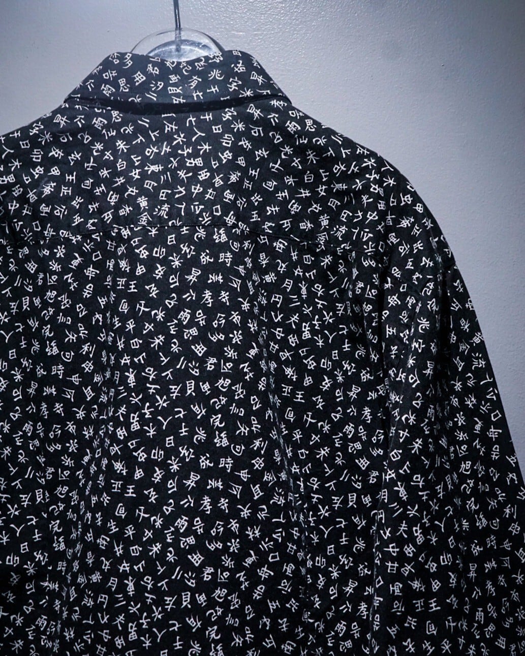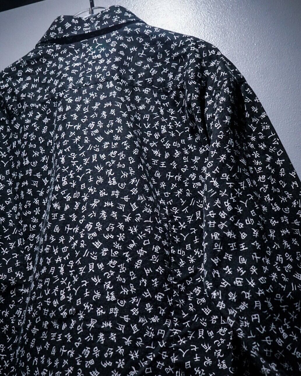 コシのあるブラックのボディをベースに、漢字をボディ全体に散りばめた、思想強めに仕上げられた長袖シャツ。