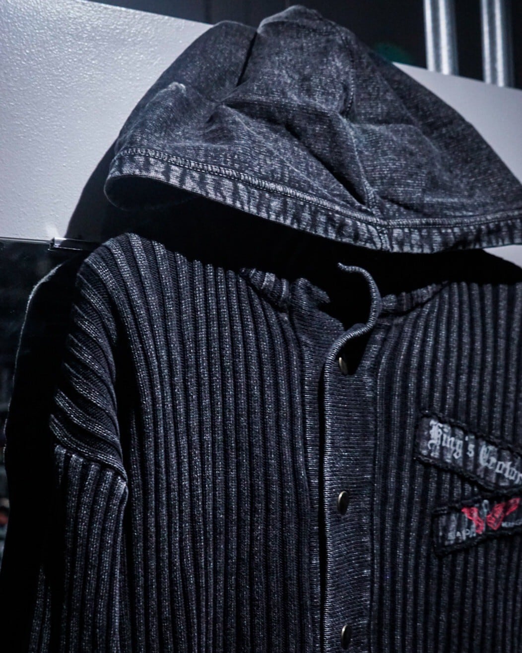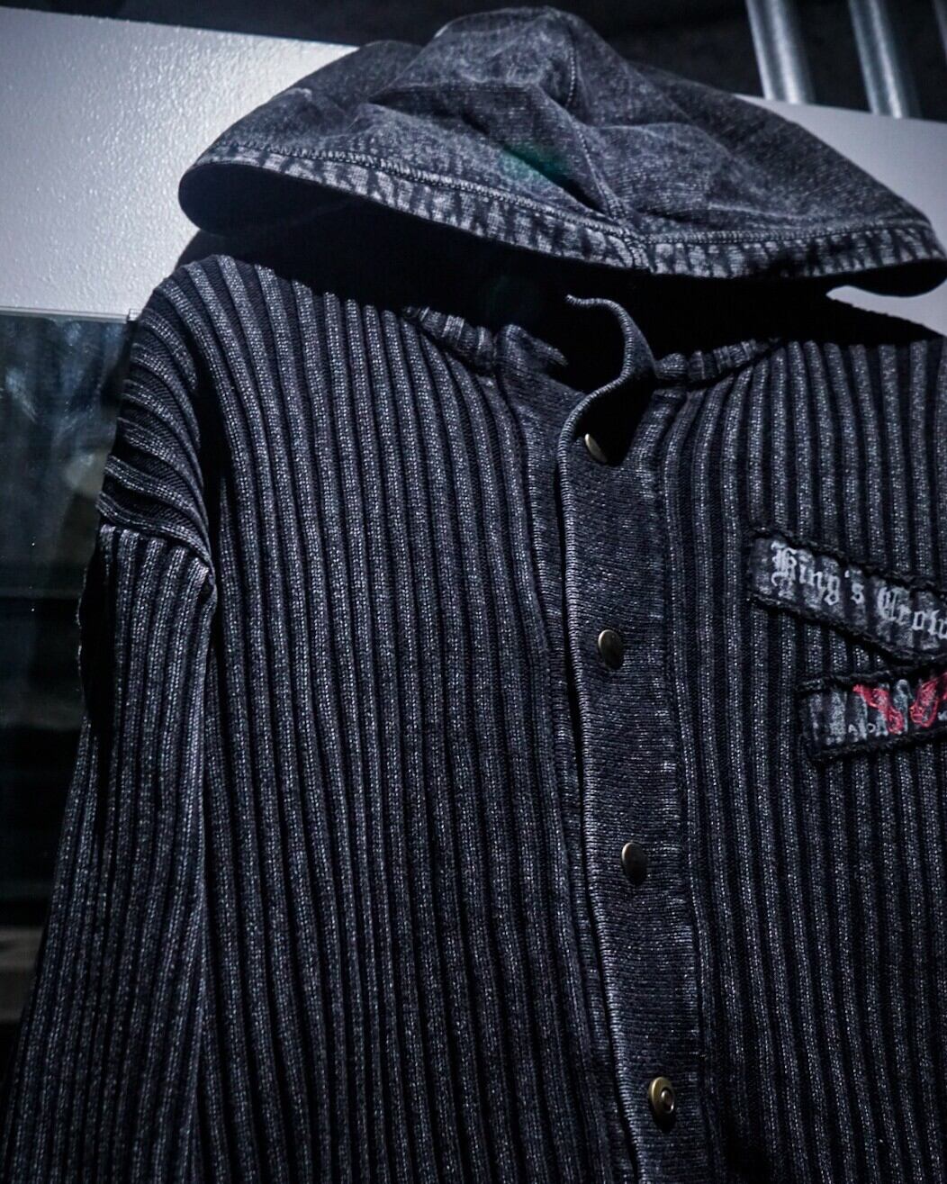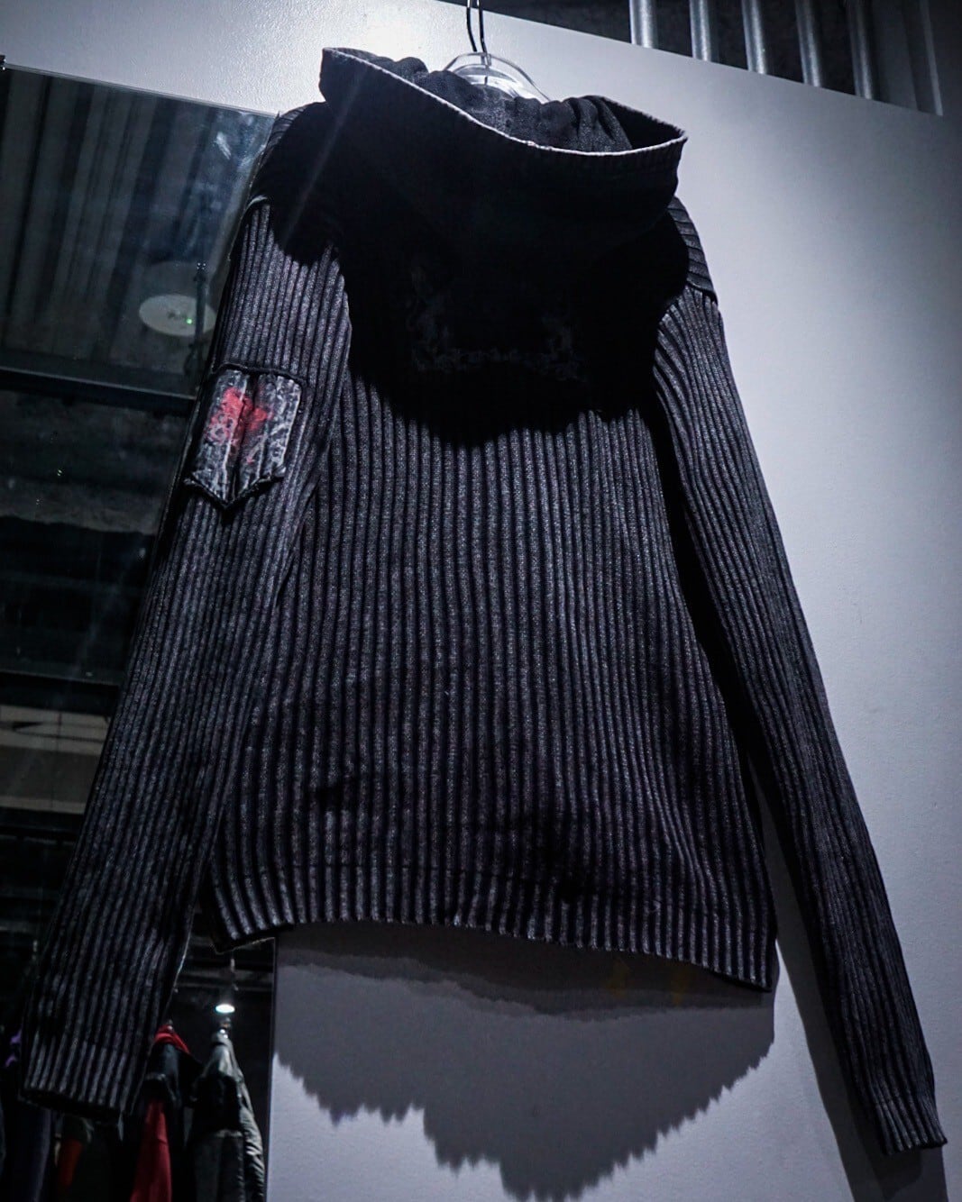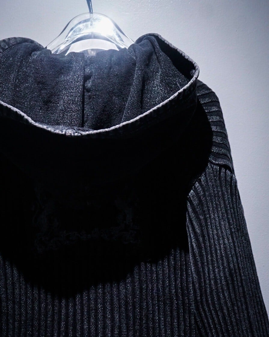 フェードブラックのボディをベースに、インナーにジップフーディを仕込んだレイヤード風のデザインに仕上げたニットジャケット。