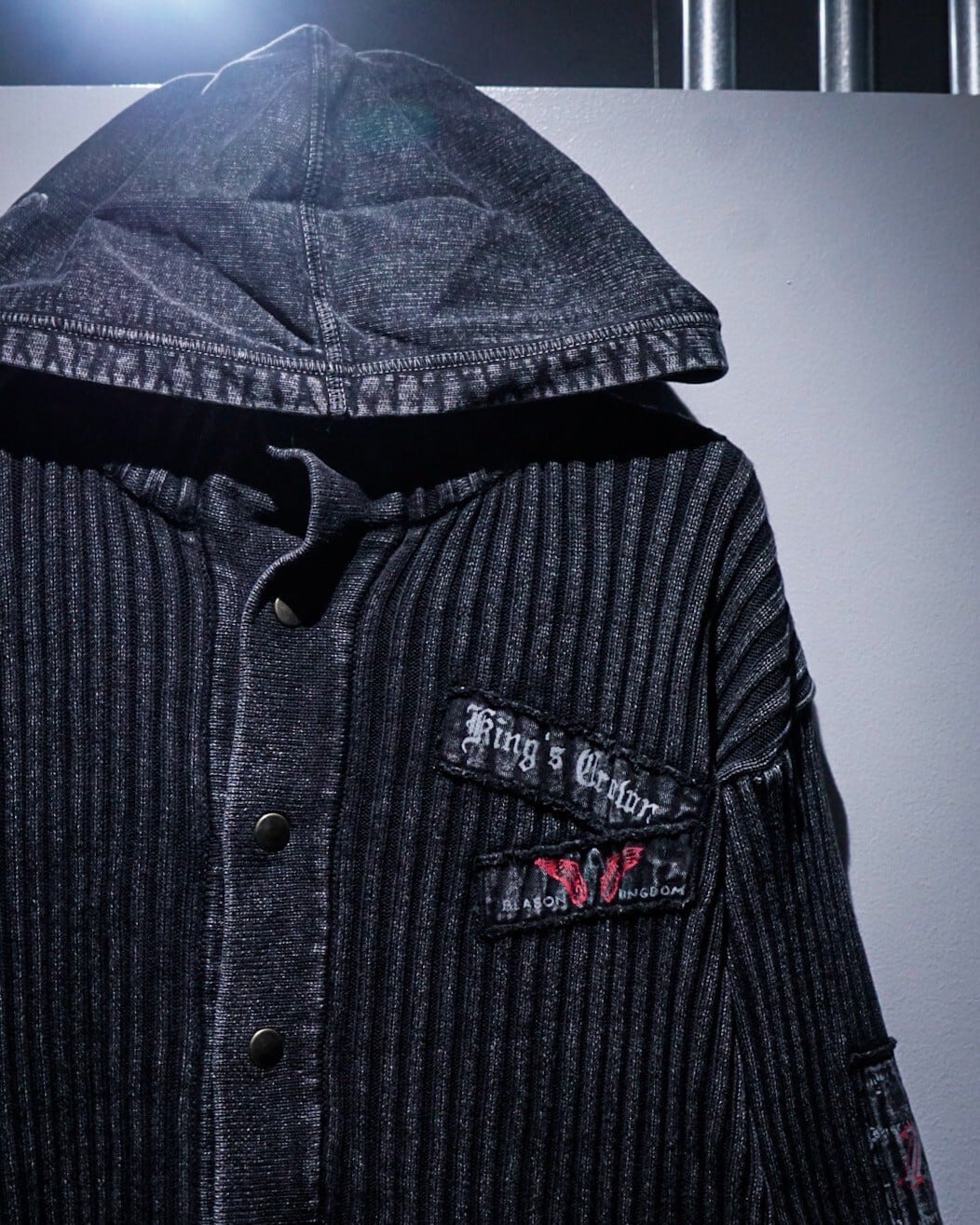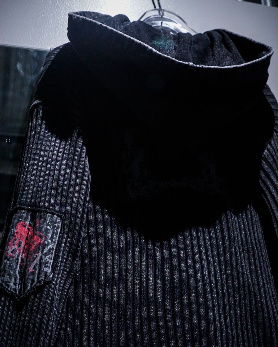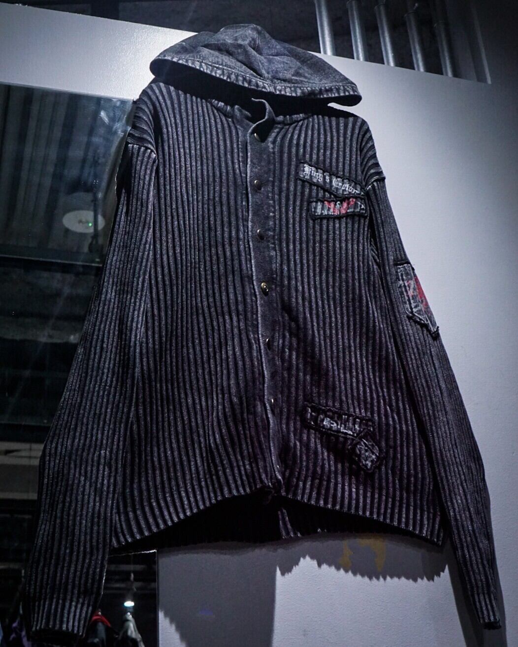 フェードブラックのボディをベースに、インナーにジップフーディを仕込んだレイヤード風のデザインに仕上げたニットジャケット。