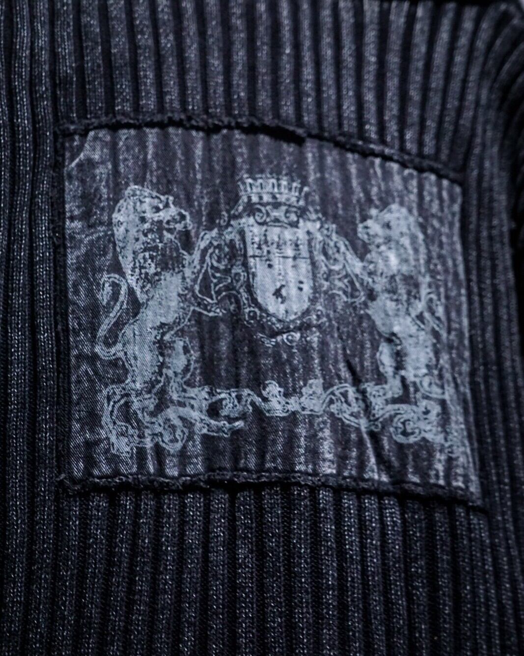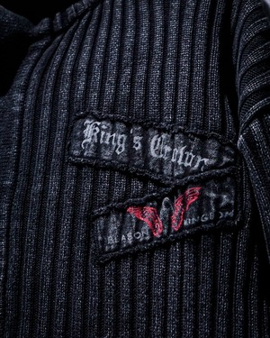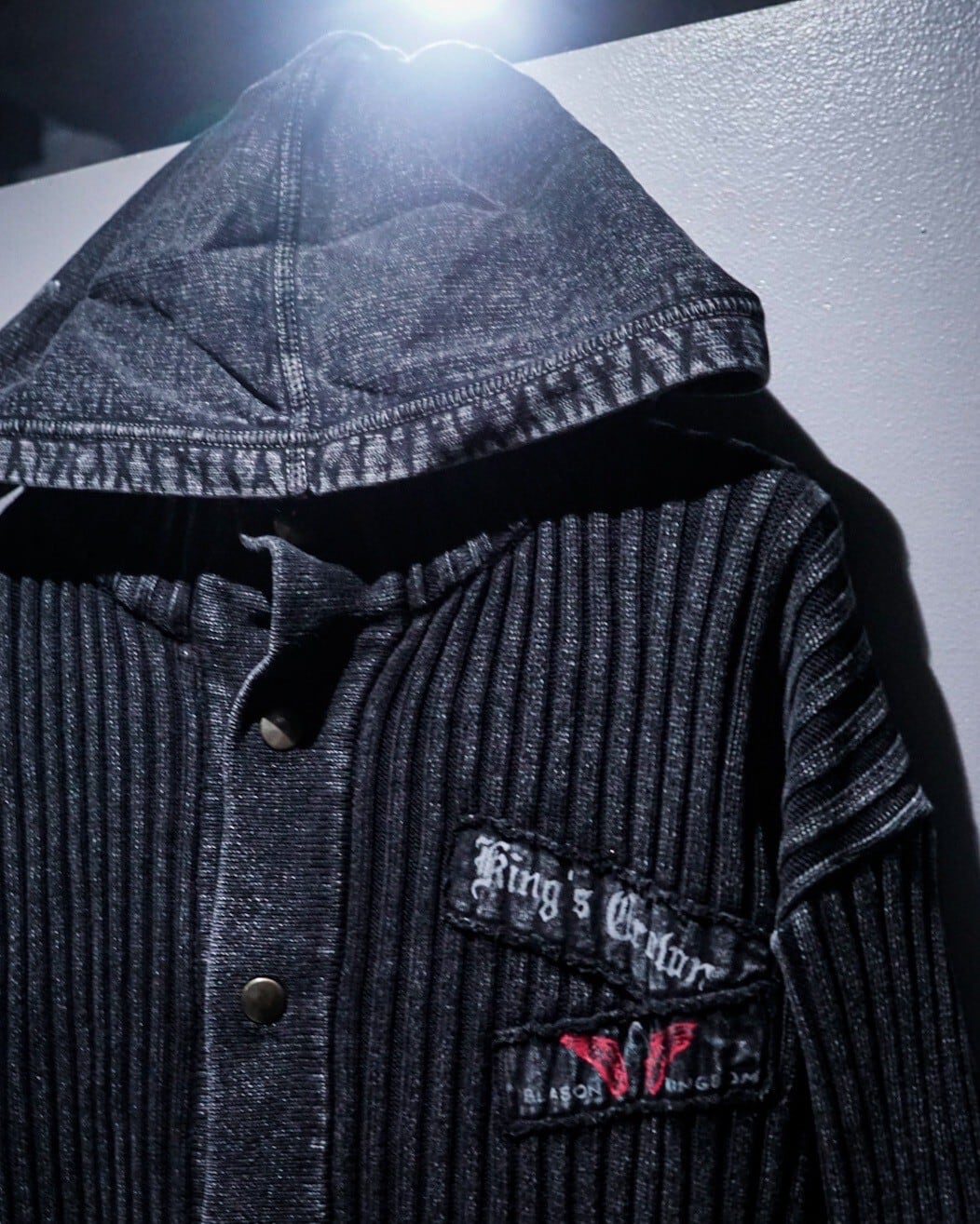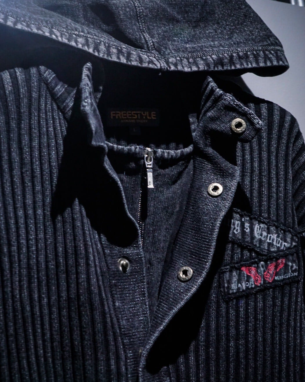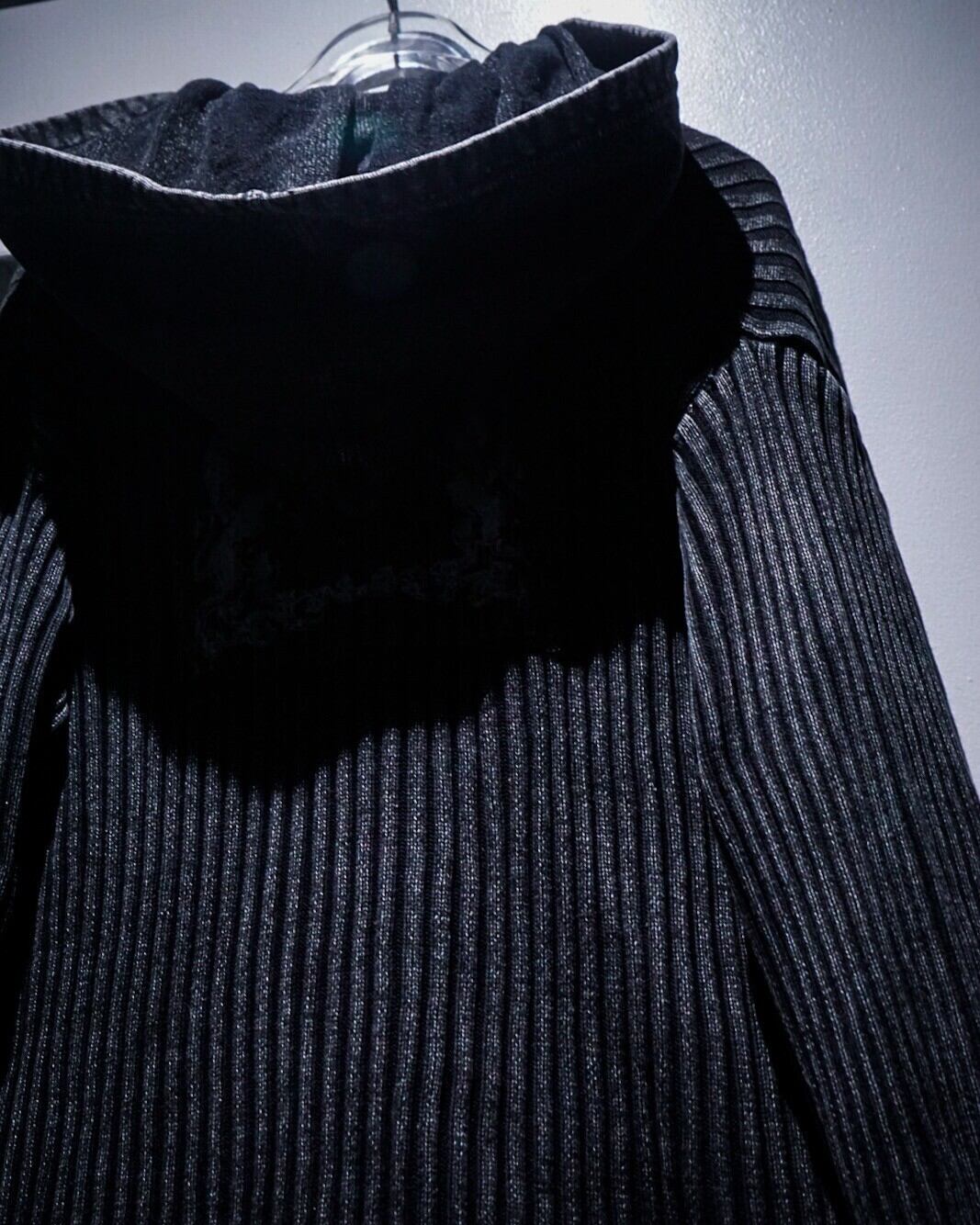 フェードブラックのボディをベースに、インナーにジップフーディを仕込んだレイヤード風のデザインに仕上げたニットジャケット。