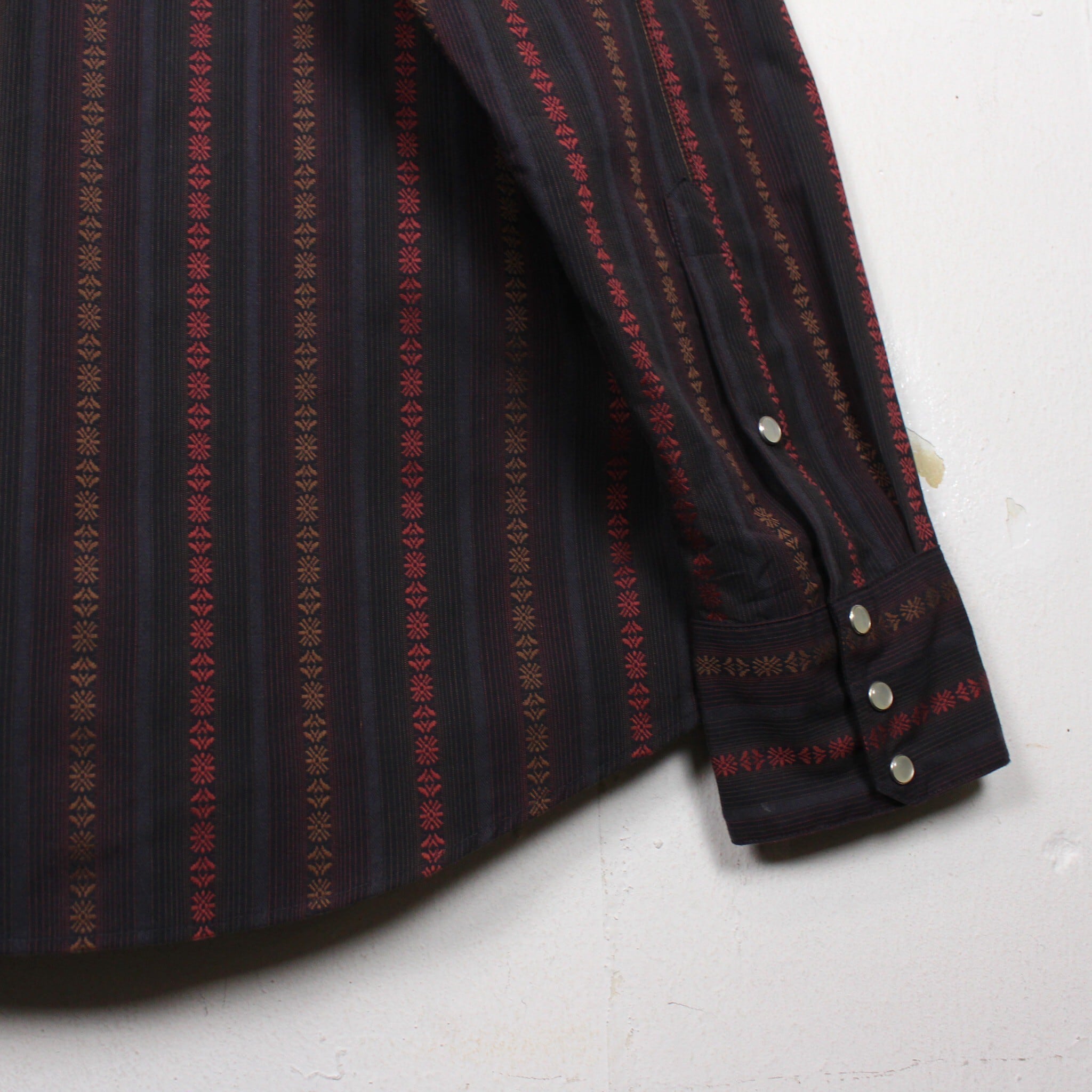 ピッチを変えたストライプのボディに、織りによってエスニック調のデザインを施し、さらにウエスタンの要素をMixさせた稀有な長袖シャツ。