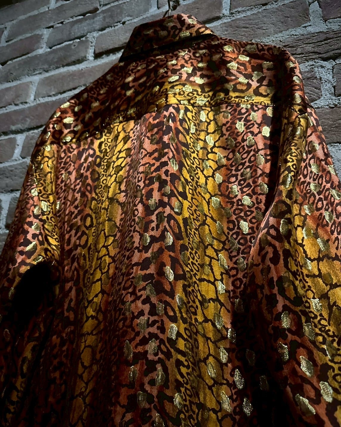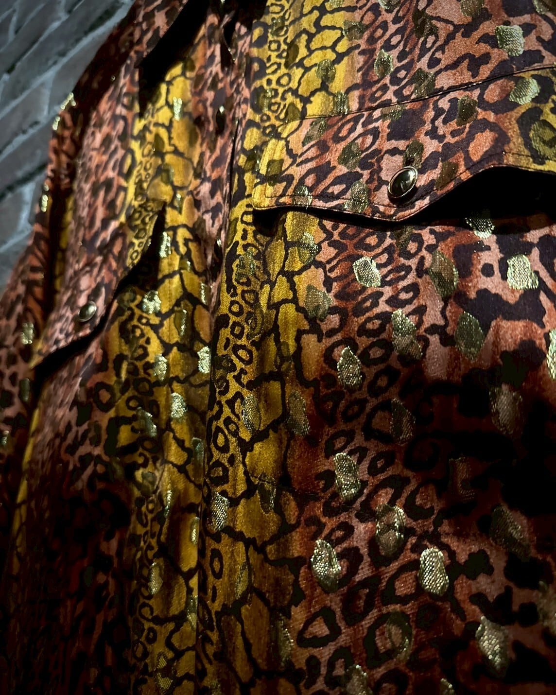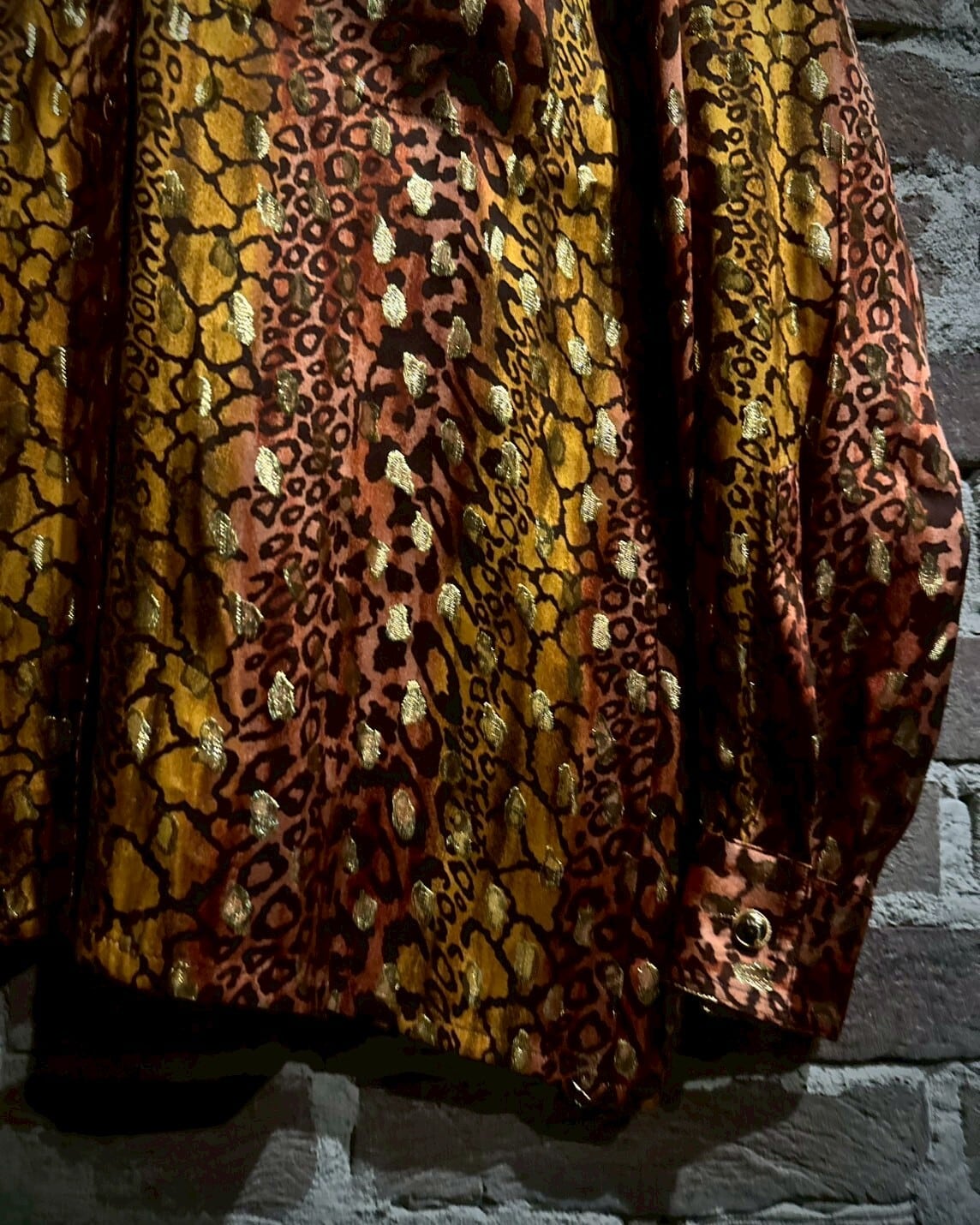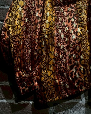 肌触り滑らかな極上シルク素材とハリ感のあるポリエステル素材をミックスし、両素材の良い所取りのボディに、ストライプに切り替わるレオパードを載せた逸品。