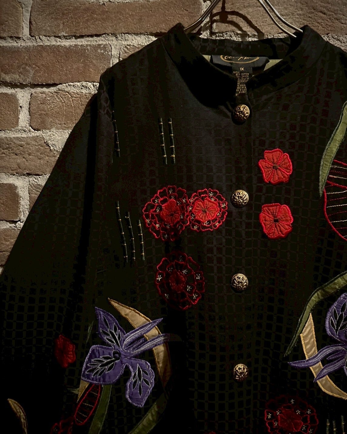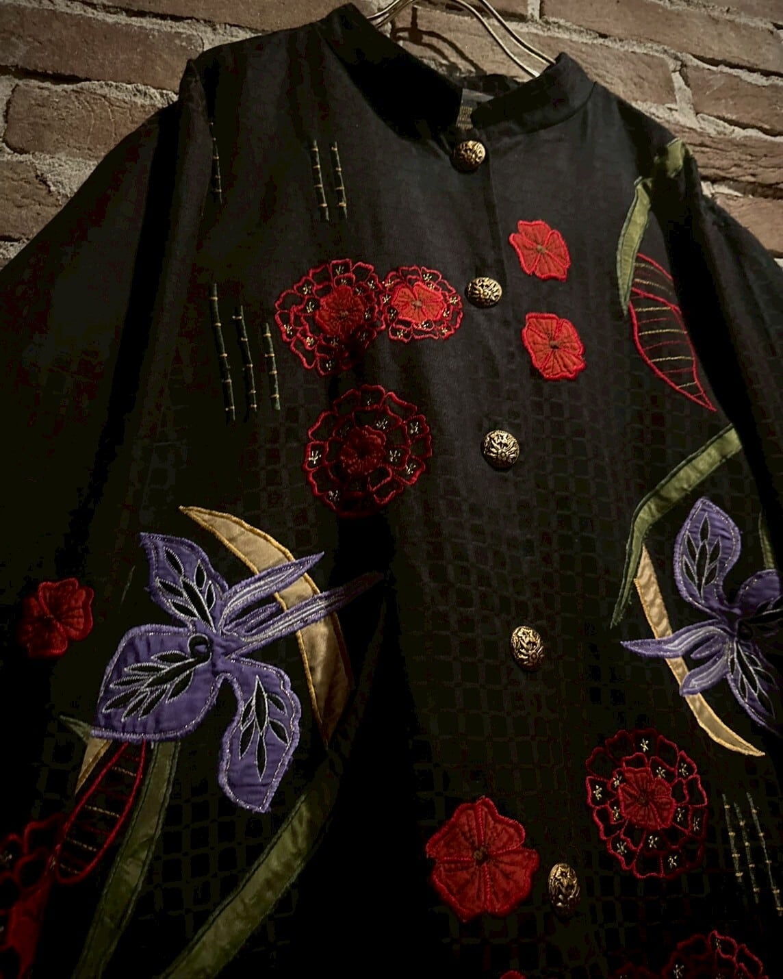 美しい独創的な花柄が唯一無二なフレーバーをムンムンに漂わせています。緻密な刺繍が魅せる繊細な表情は深みを与えると同時に上品さもプラスしてくれます。フロントに施された金ボタンもデザインのアクセントに。