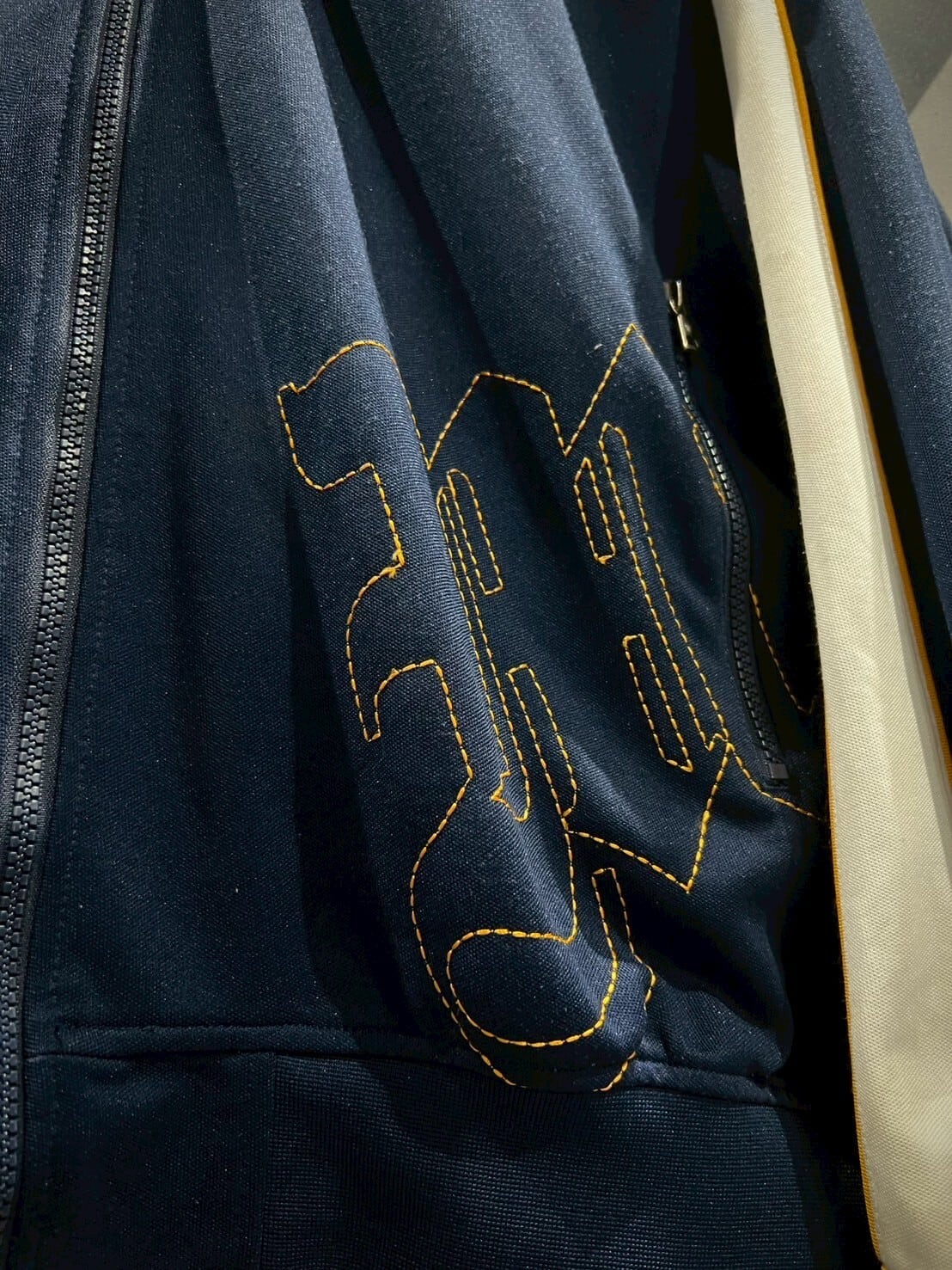ネイビーのボディをベースに、左胸には2pacを載せたワッペン、ボディ左側には頭文字の"M"をステッチで載せた1着。