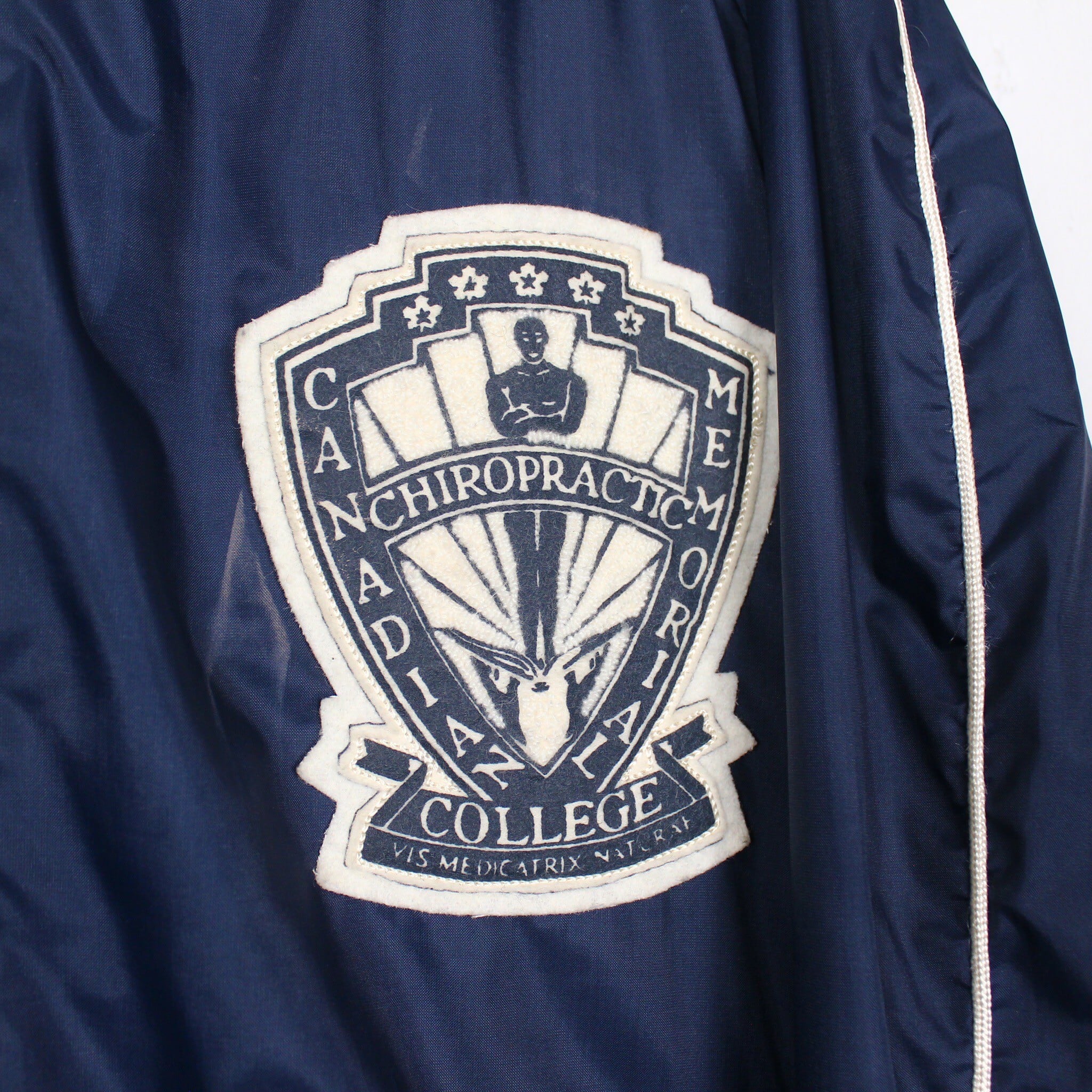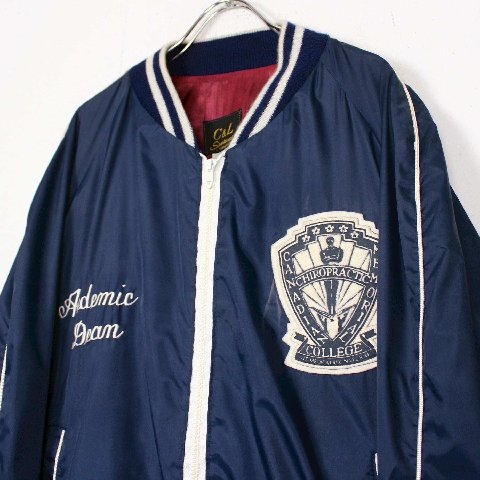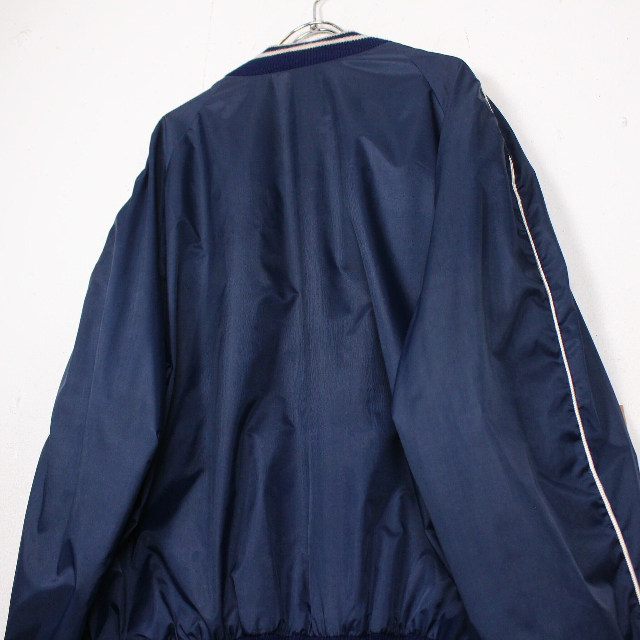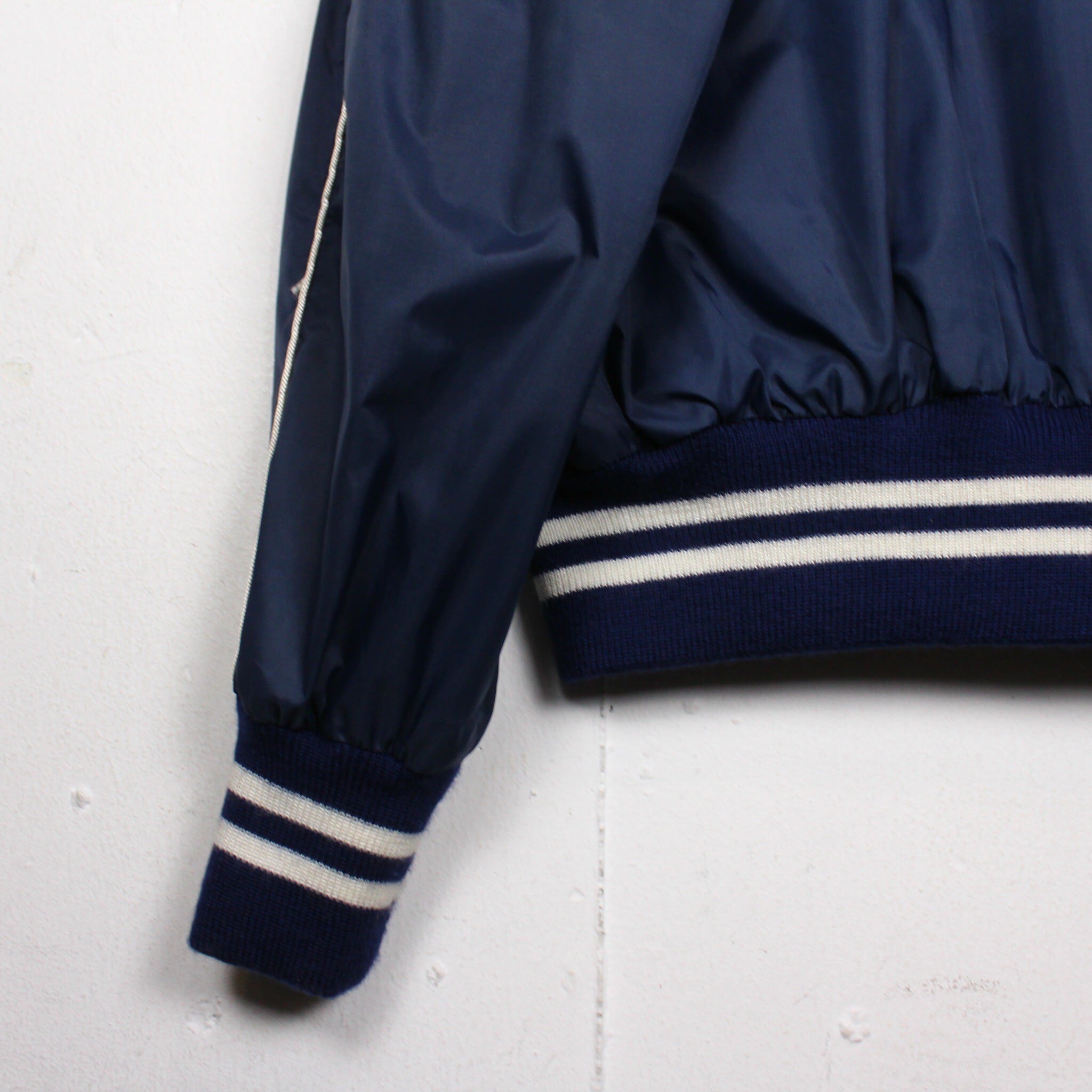 特有の光沢を放つネイビーカラーのナイロン素材をベースに、フロント左胸にはカレッジワッペン、右胸には刺繍デザインを載せたナイロンスタジャン。