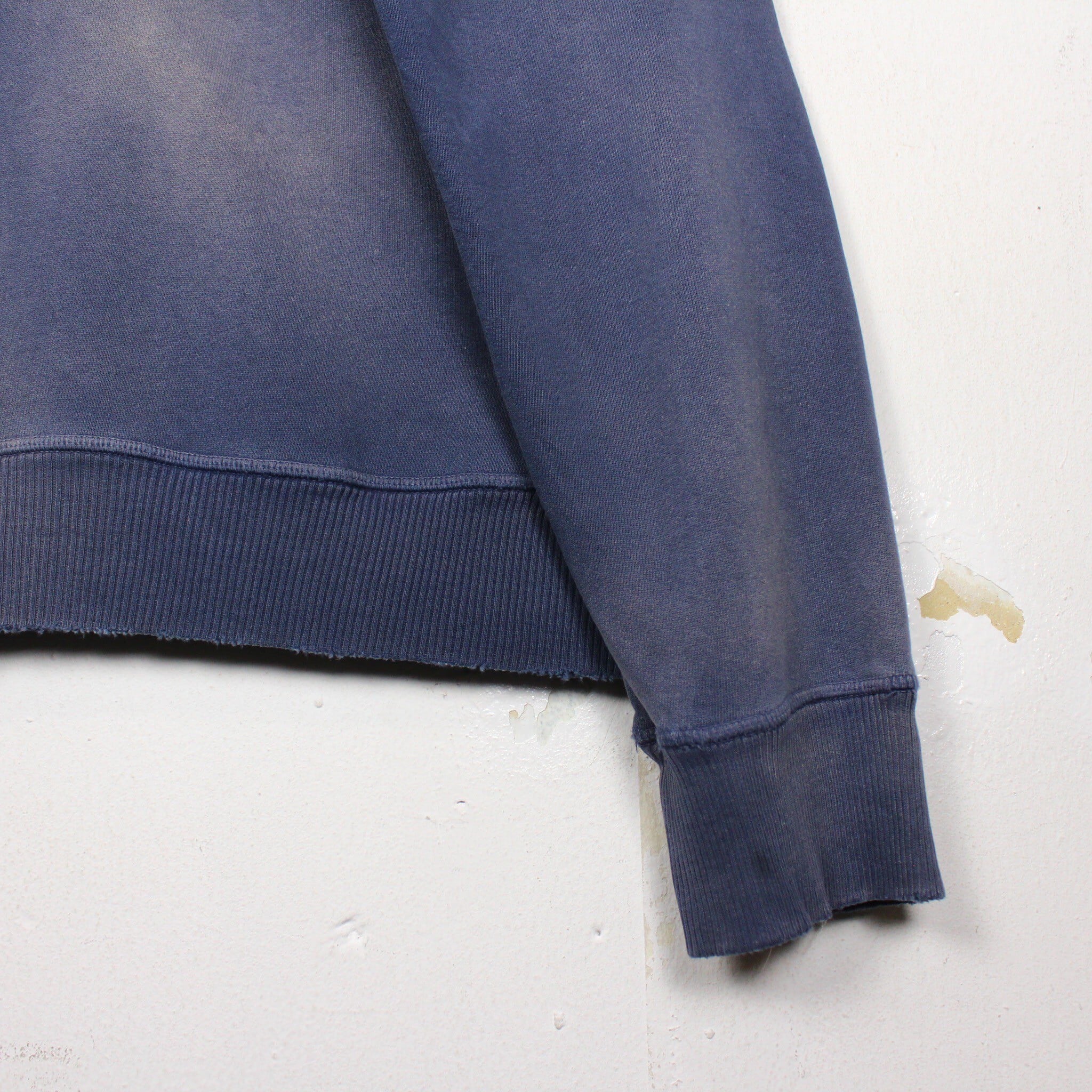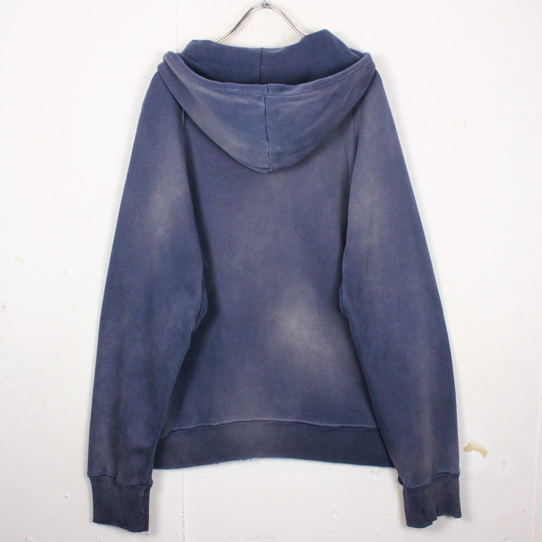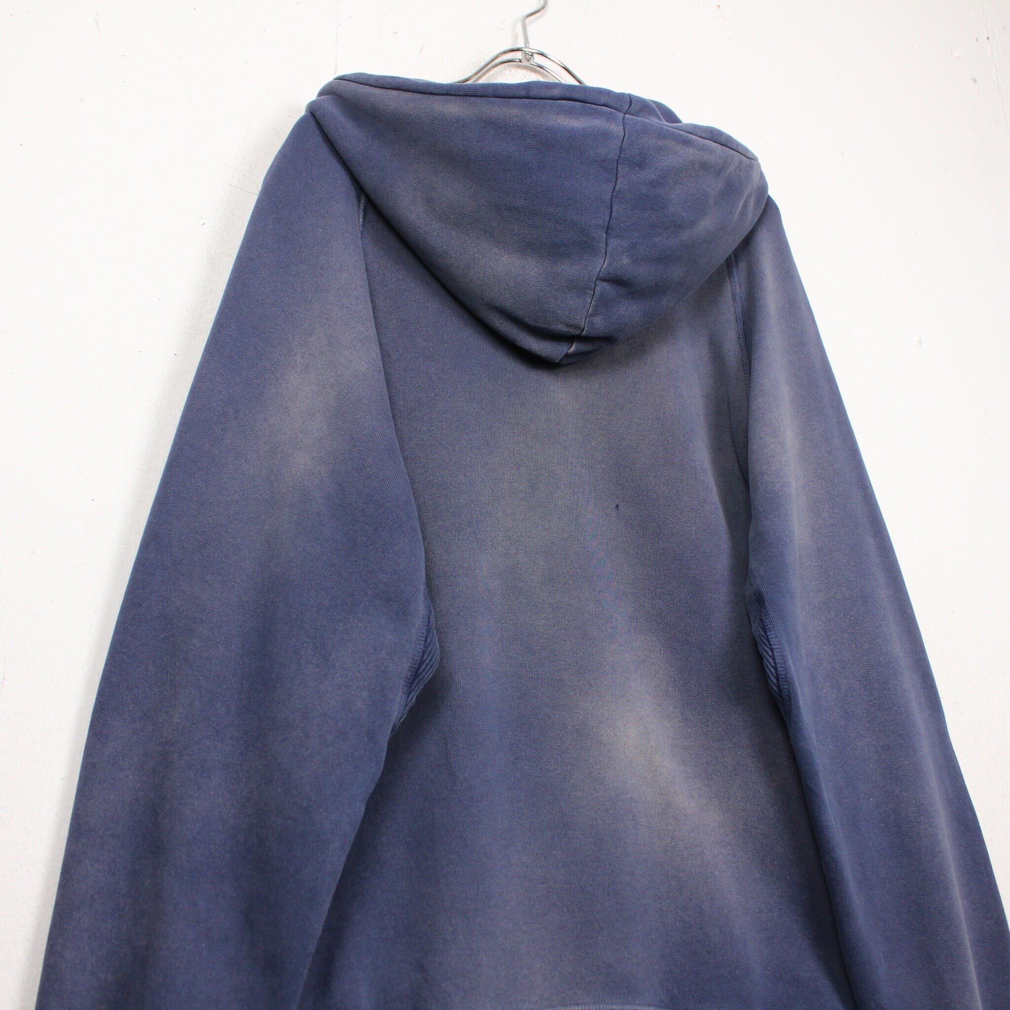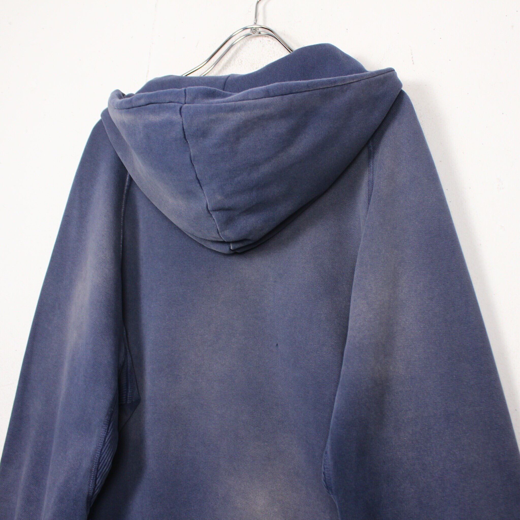美しいフェードの効いたネイビーのボディに、フロントには経年変化によって擦れたプリントが残ったプルオーバー型のスウェットフーディー。