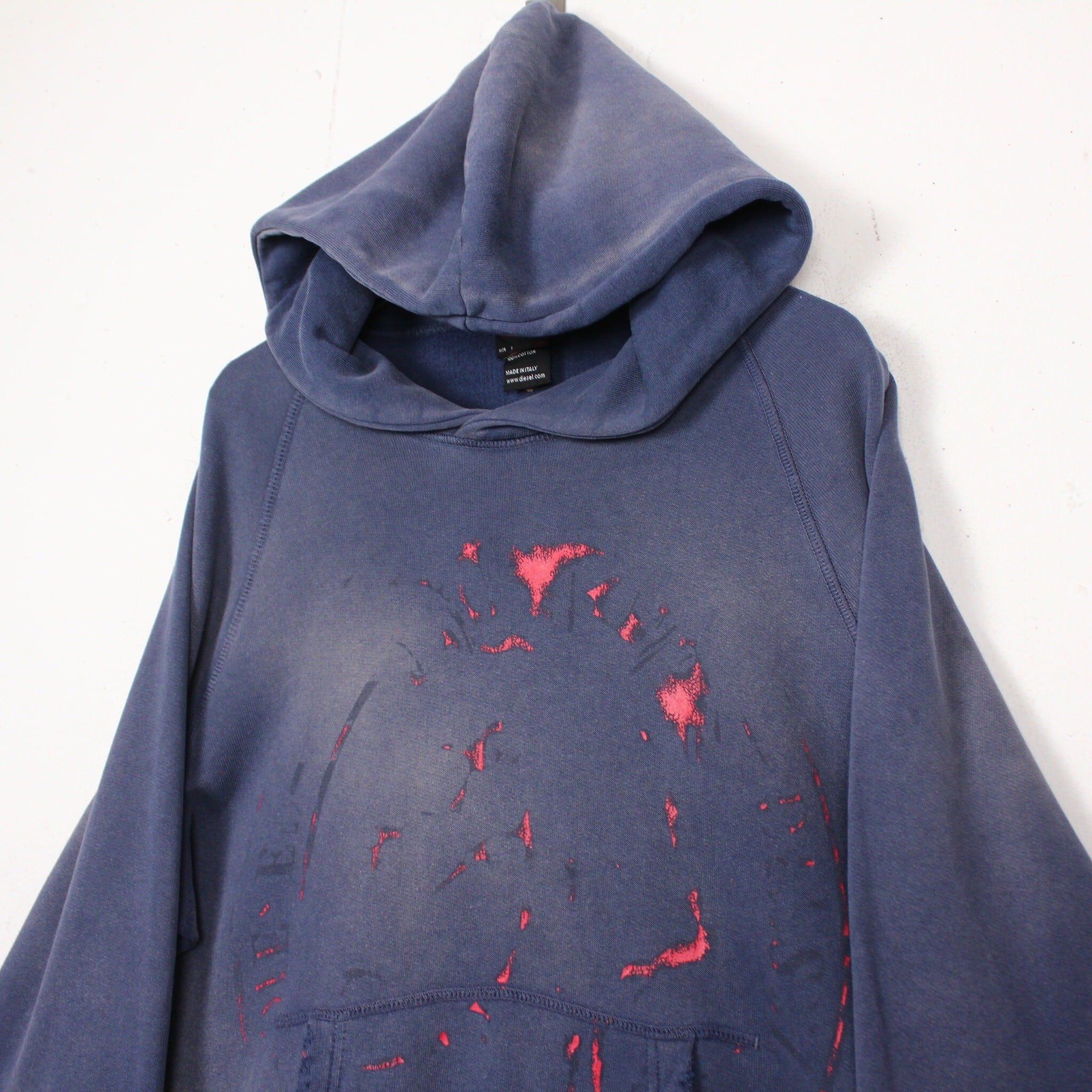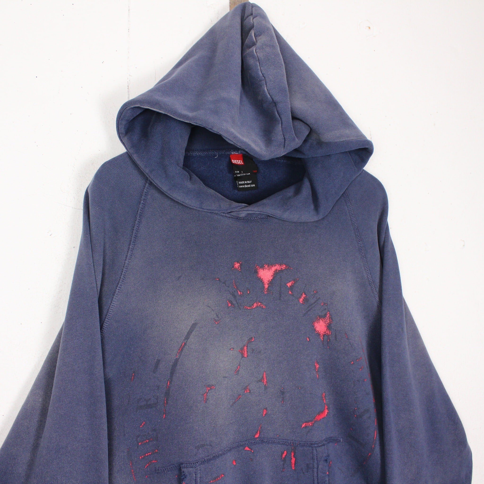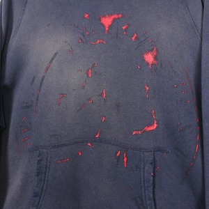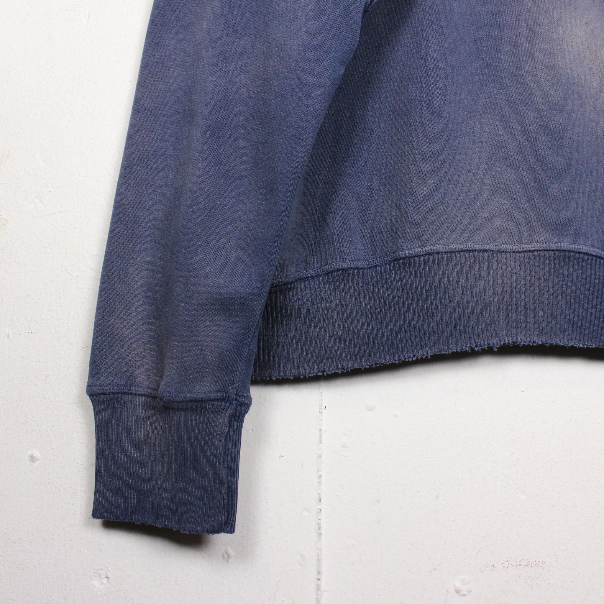 美しいフェードの効いたネイビーのボディに、フロントには経年変化によって擦れたプリントが残ったプルオーバー型のスウェットフーディー。