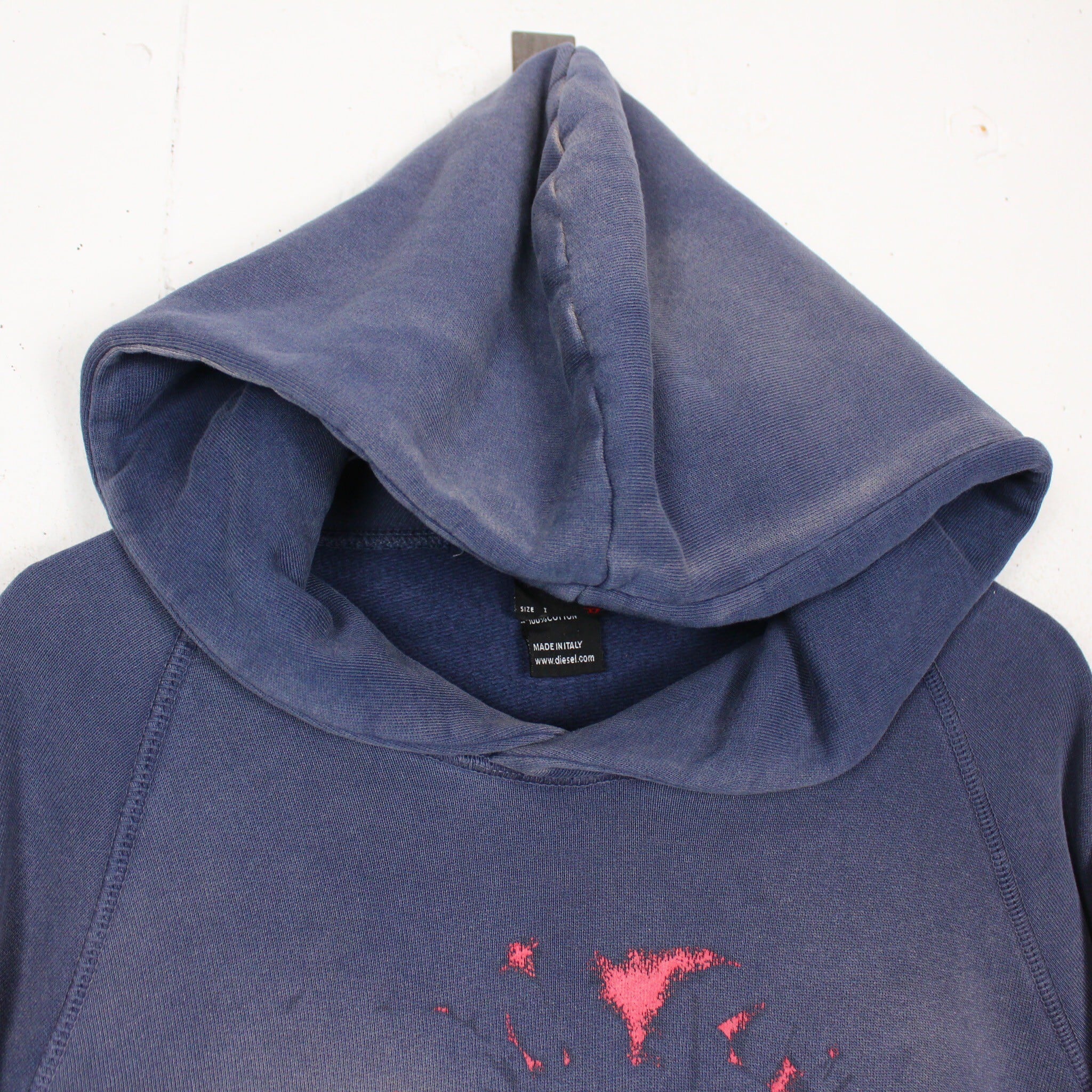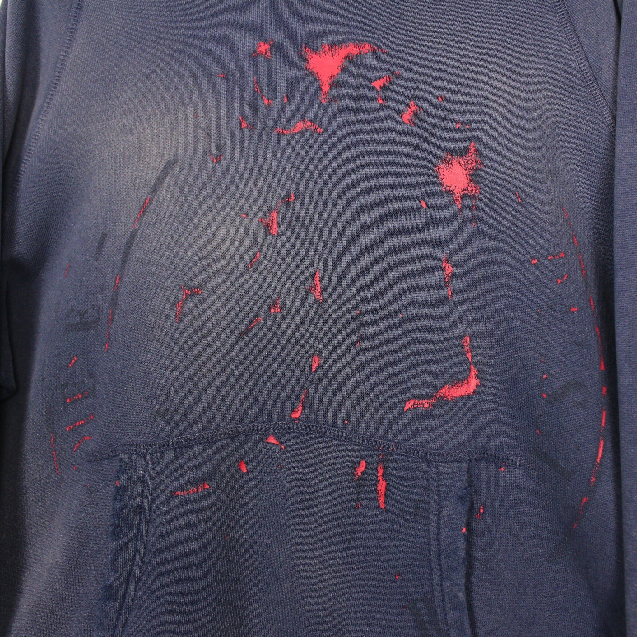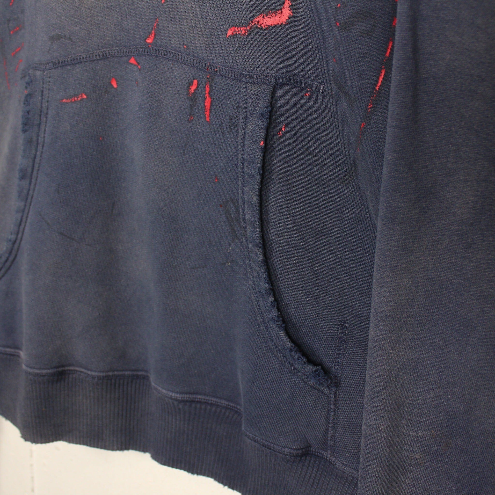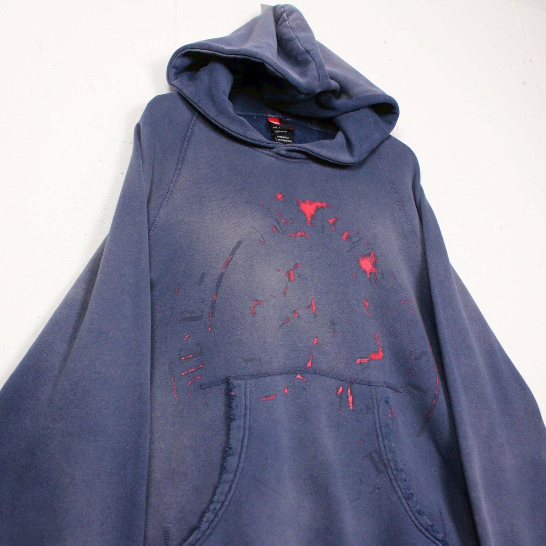 美しいフェードの効いたネイビーのボディに、フロントには経年変化によって擦れたプリントが残ったプルオーバー型のスウェットフーディー。