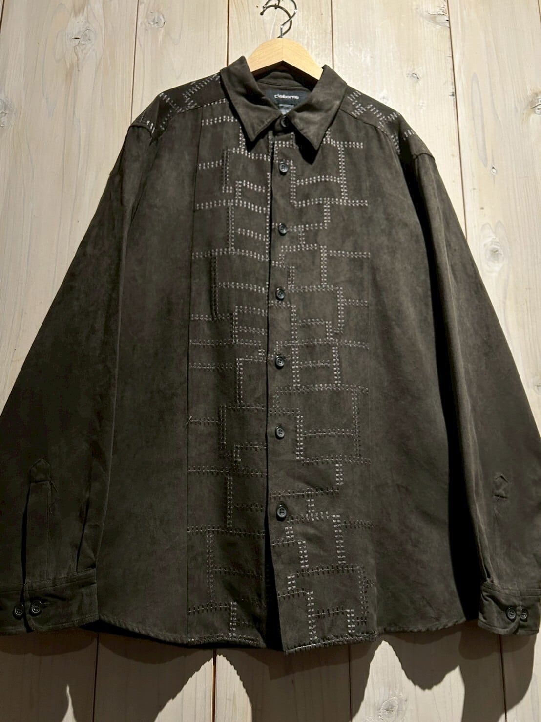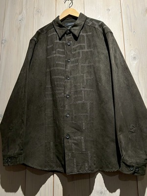 しっとりとし起毛感のあるブラックのフェイクレザーをベースに、刺繍で幾何学調の柄を刻み込んだ長袖シャツ。