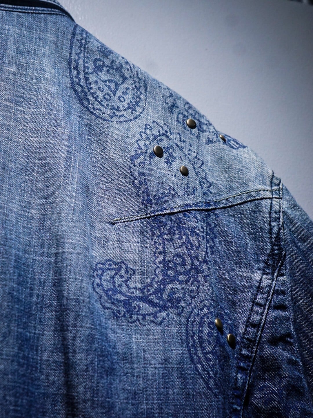 程よくフェードの効いたデニムボディに、ペイズリーのプリント、その上からスタッズを打ち込んだデニムシャツ。