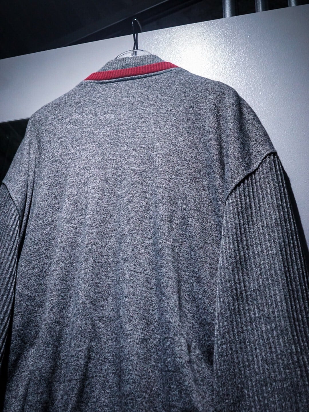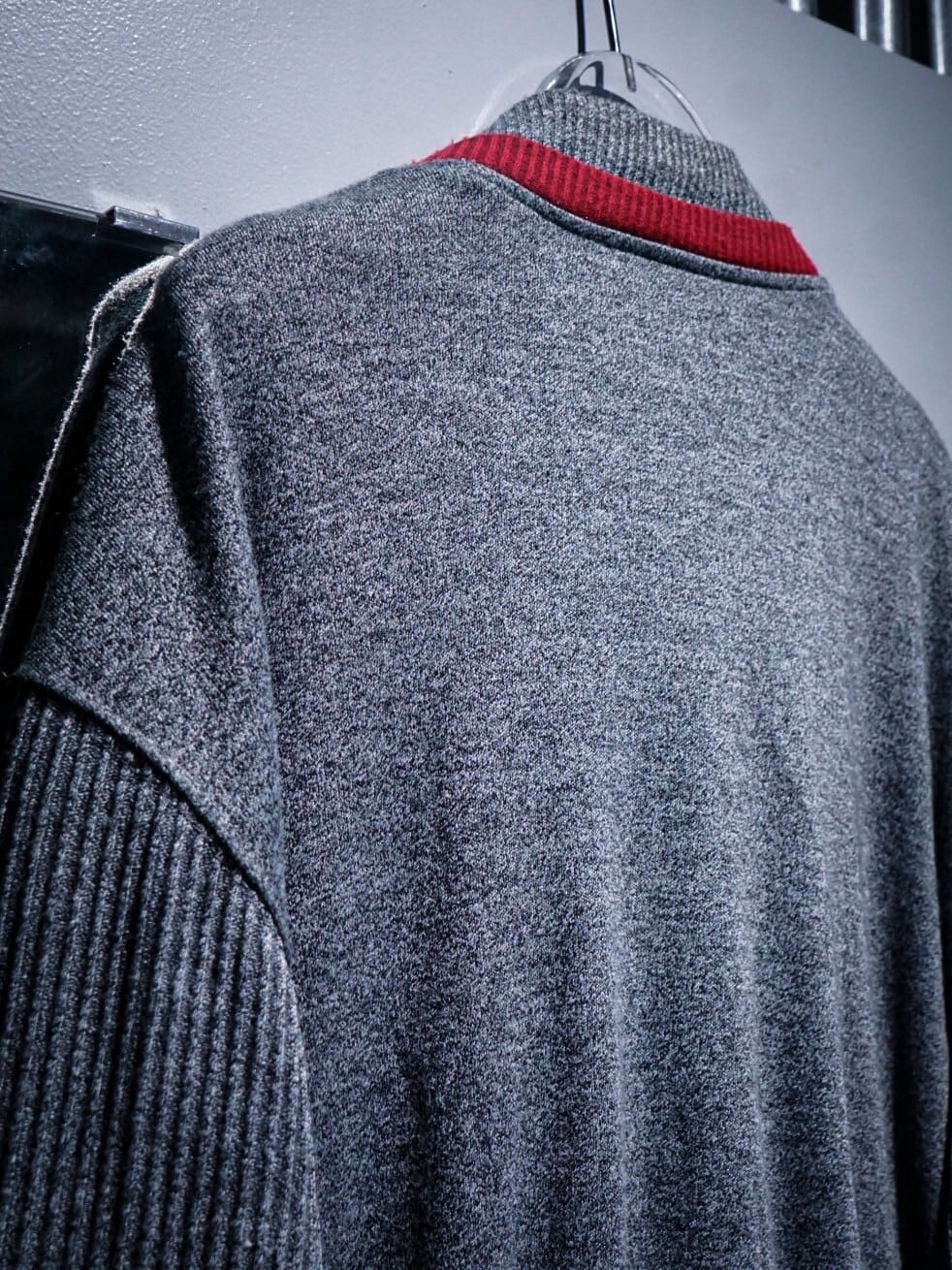 アームや各所には凹凸のあるリブニット状の素材を切り替え、両サイドにはジップポケット、左胸にはメタルのハトメ調のディテールをON。