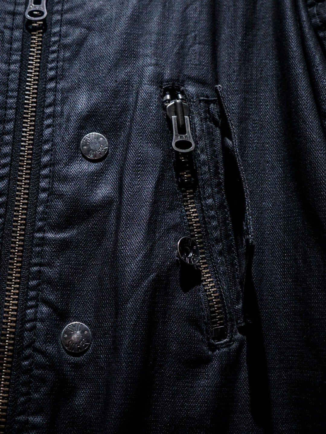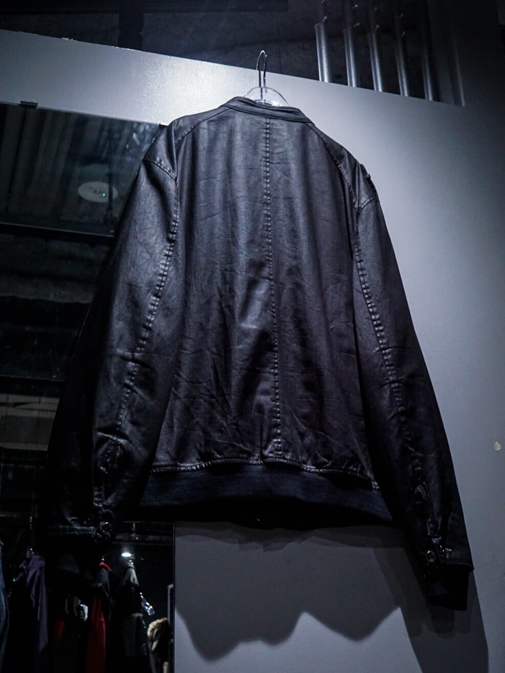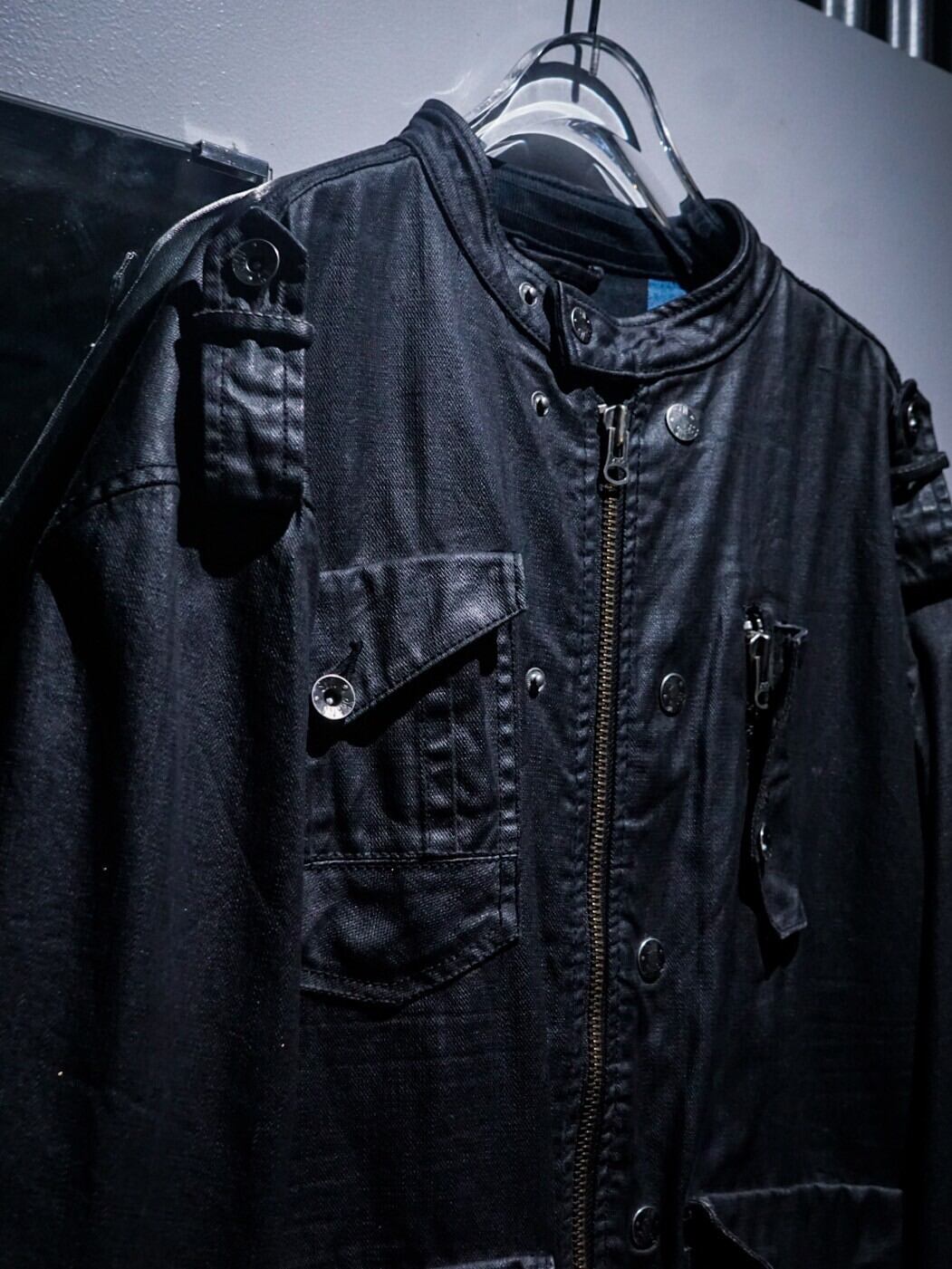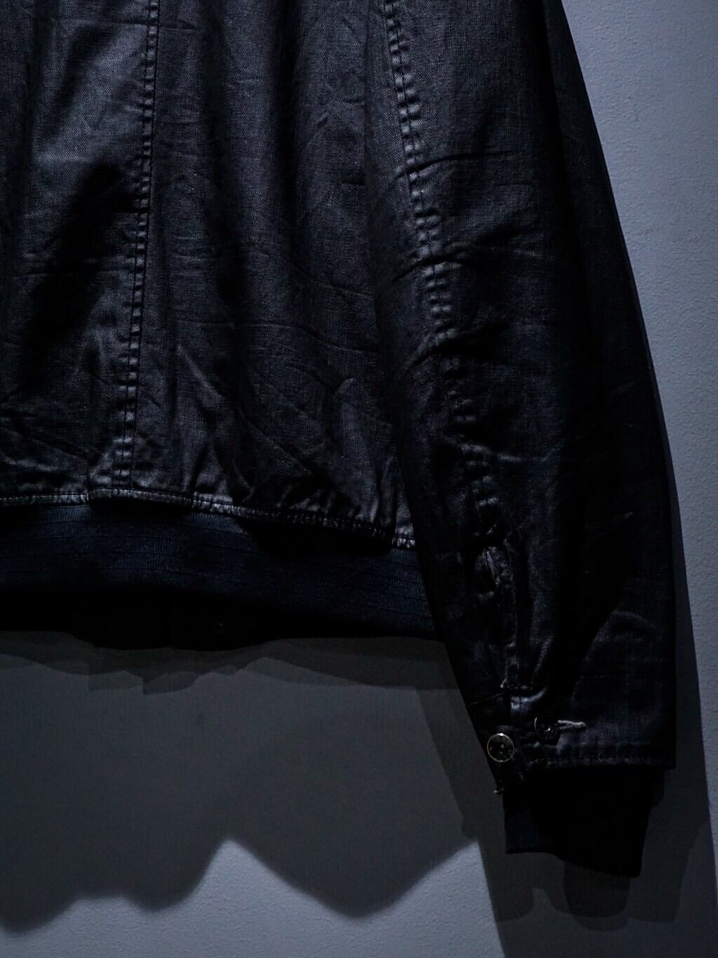 ブラックのコットンをベースにコーティングを施したジャケット。特有の光沢感を放ち、着込むほどに味わい深くなるのが魅力の一つ。