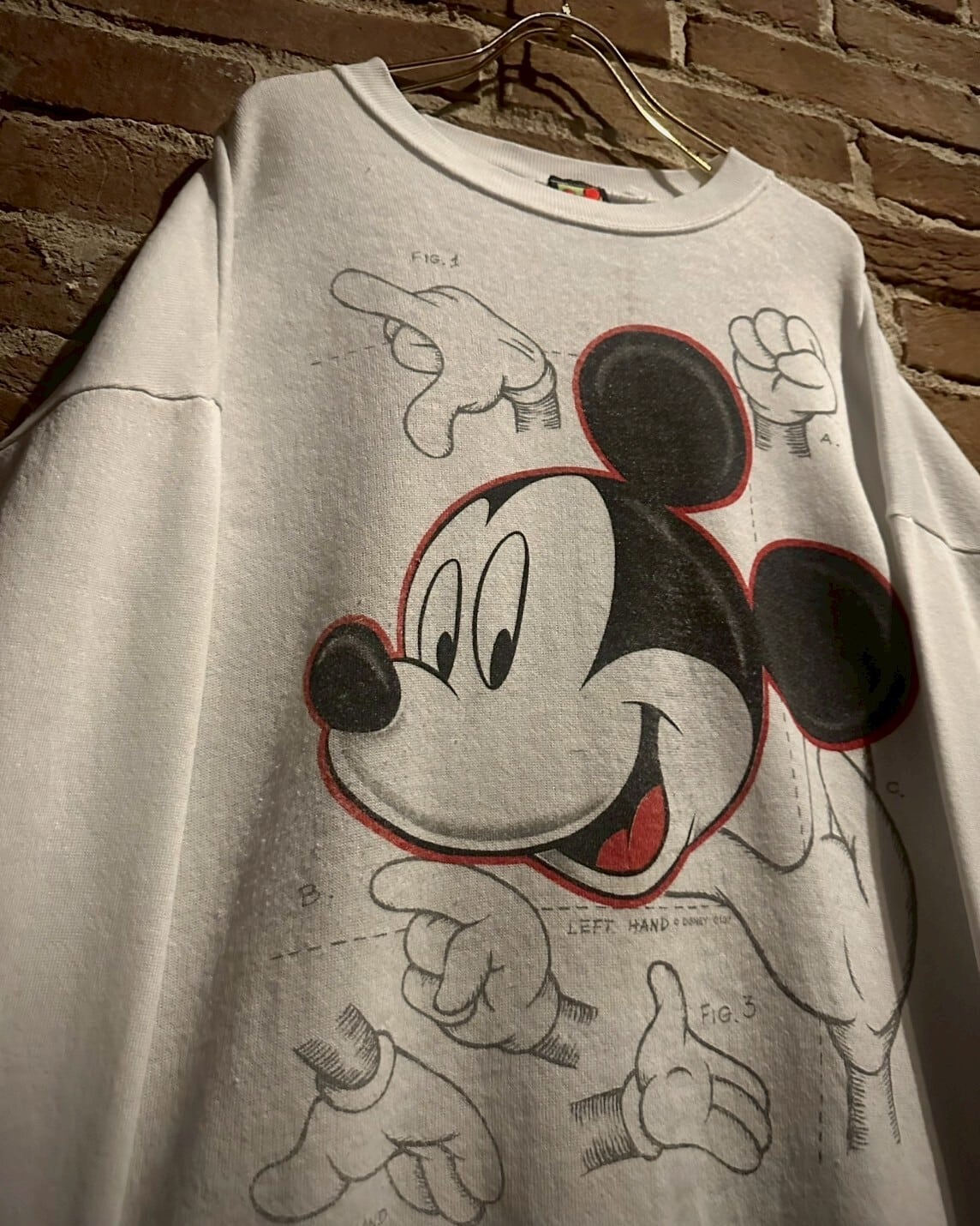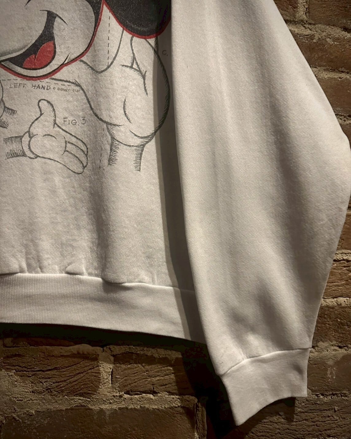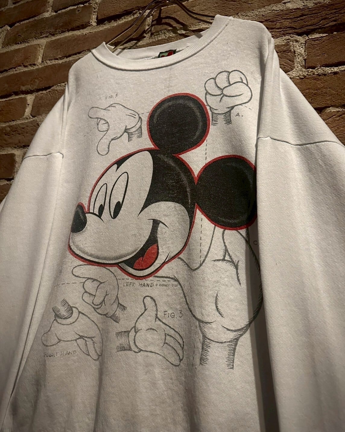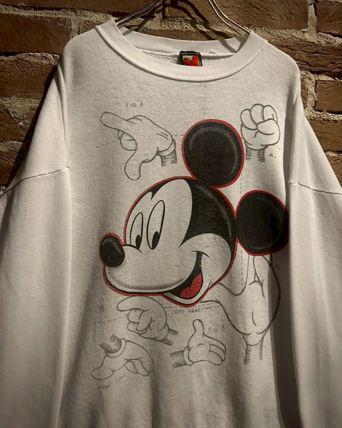 程よく肉感のある白のスウェットボディに、大ぶりなミッキーの顔、4本指のミッキーの様々なハンドサインをプリントで載せたスウェット。